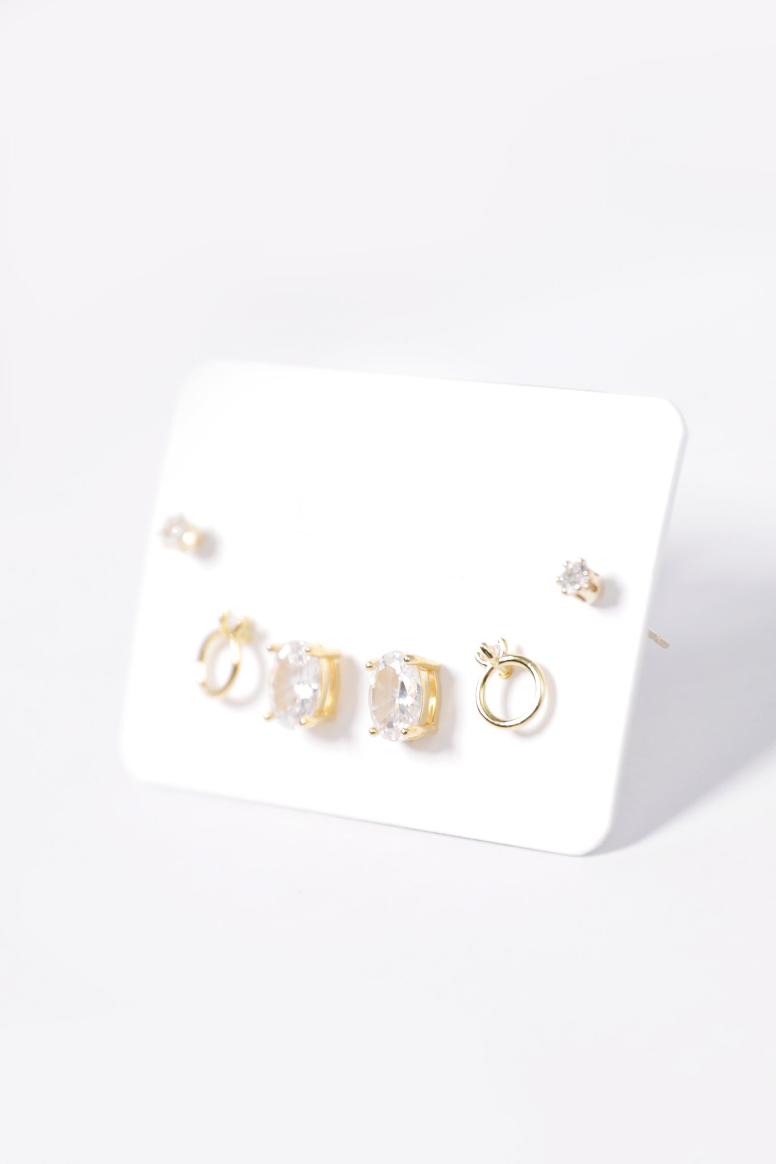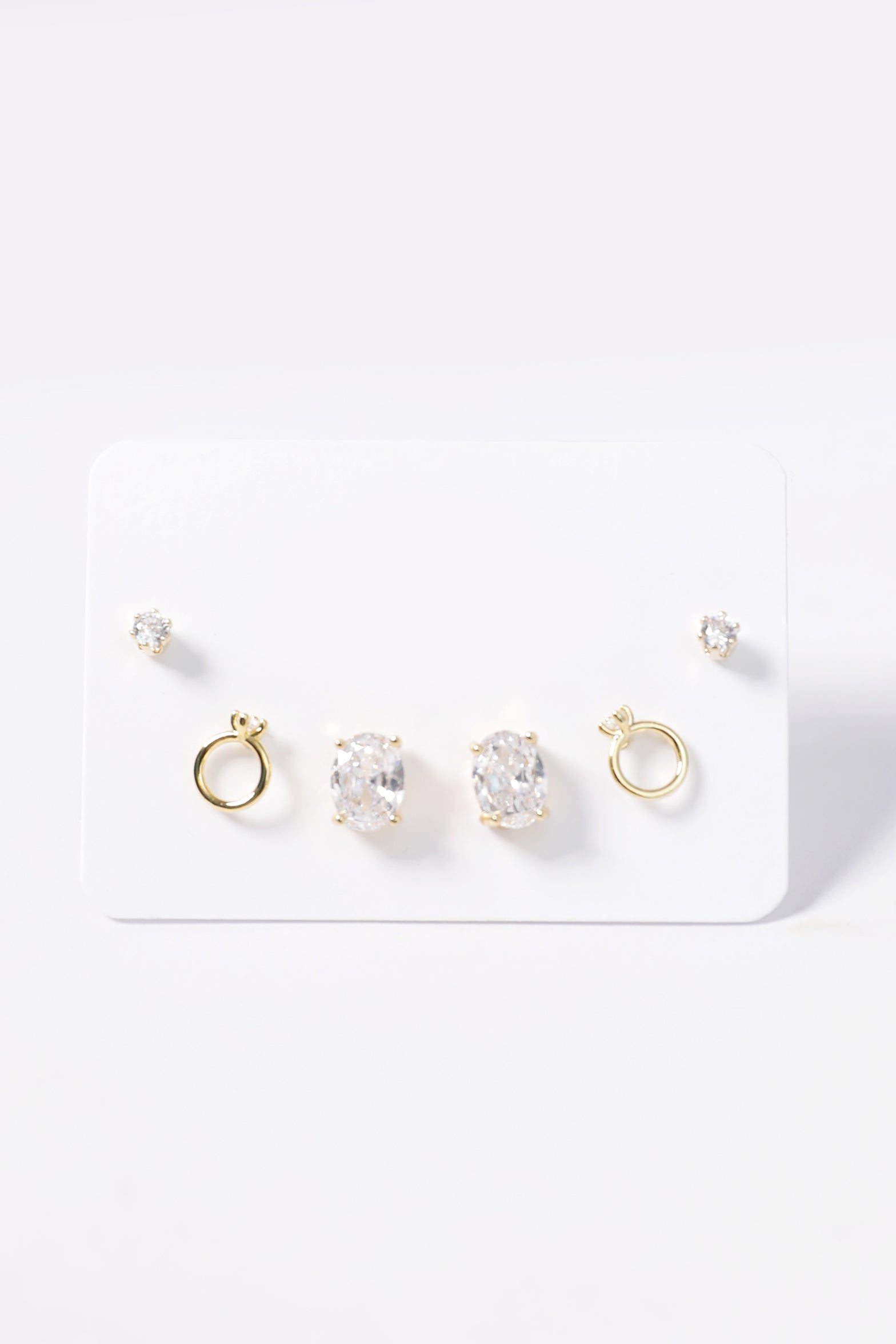 Pack of three gold-base studs, each set featuring a single rhinestone for a clean, minimal sparkle.
