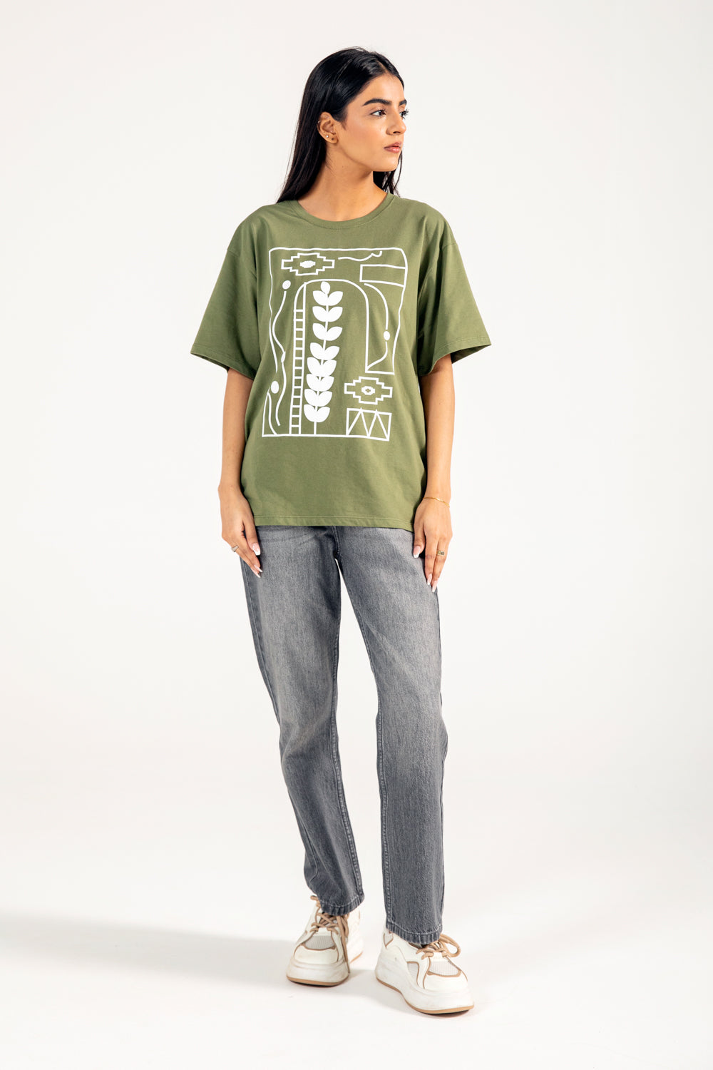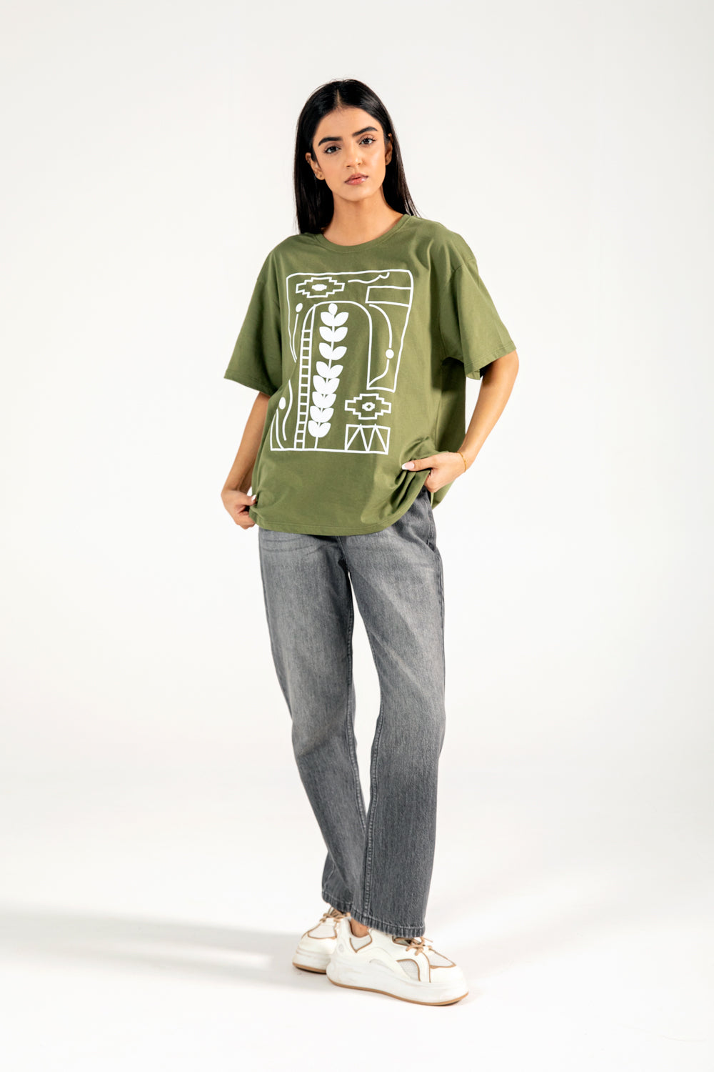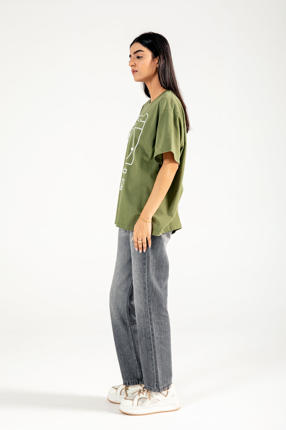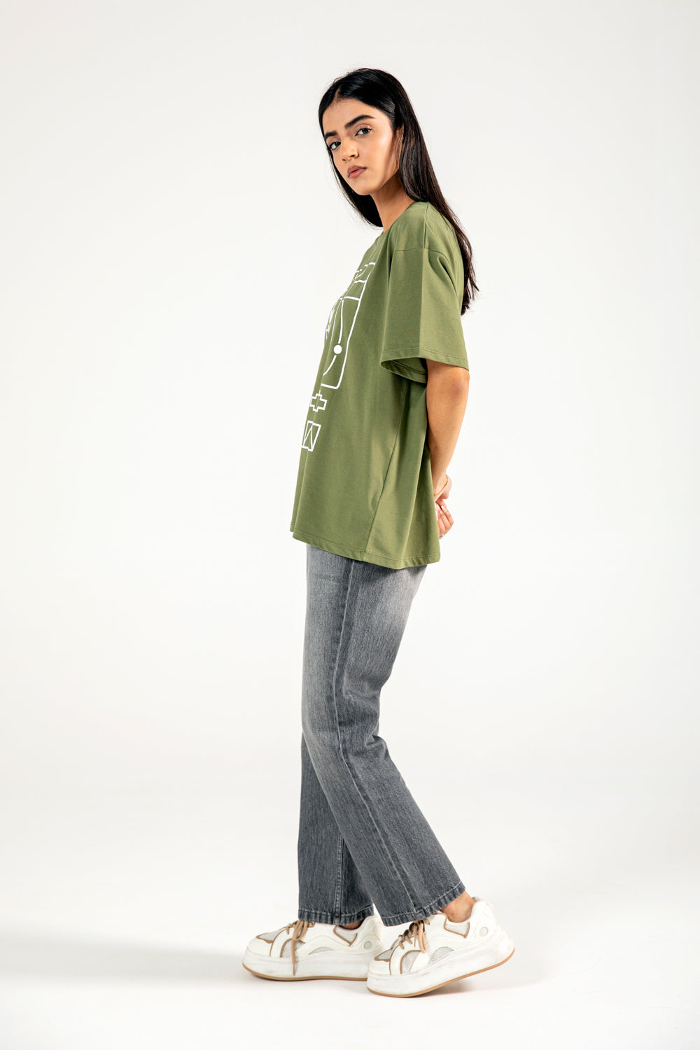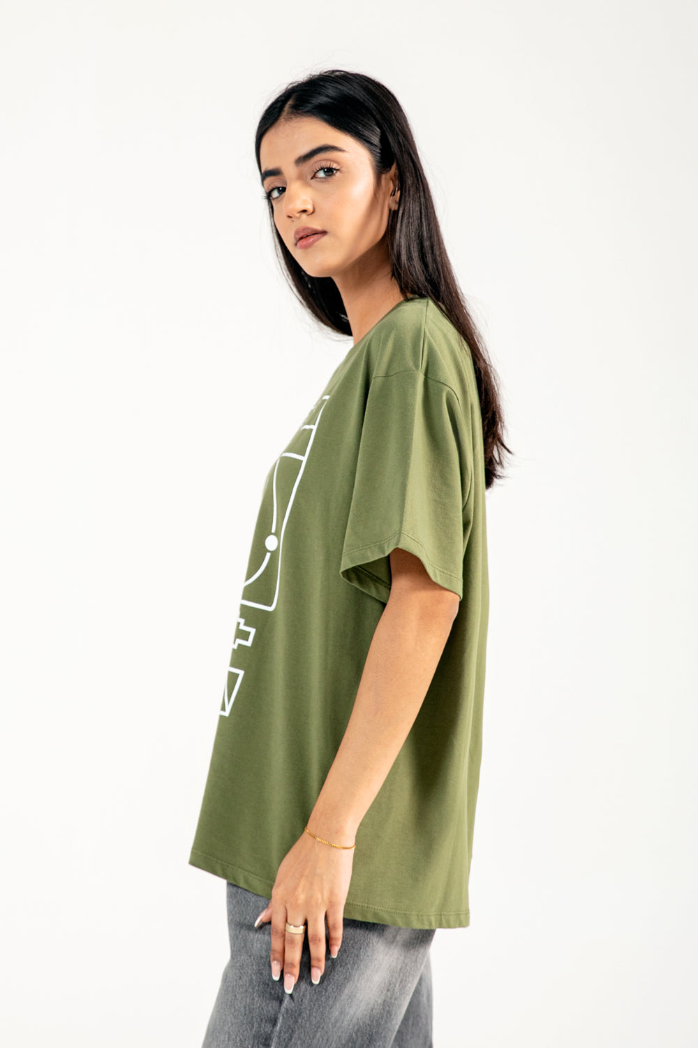 Oversized cotton tee in olive green with a bold white graphic across the front.
