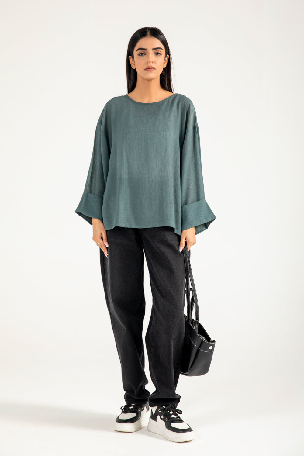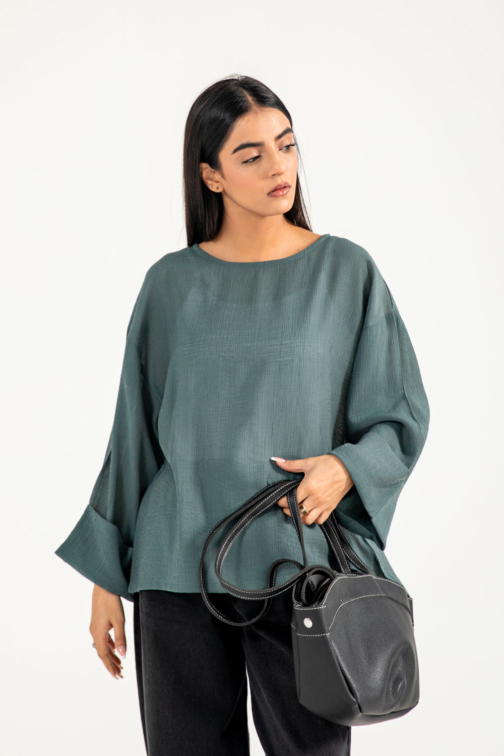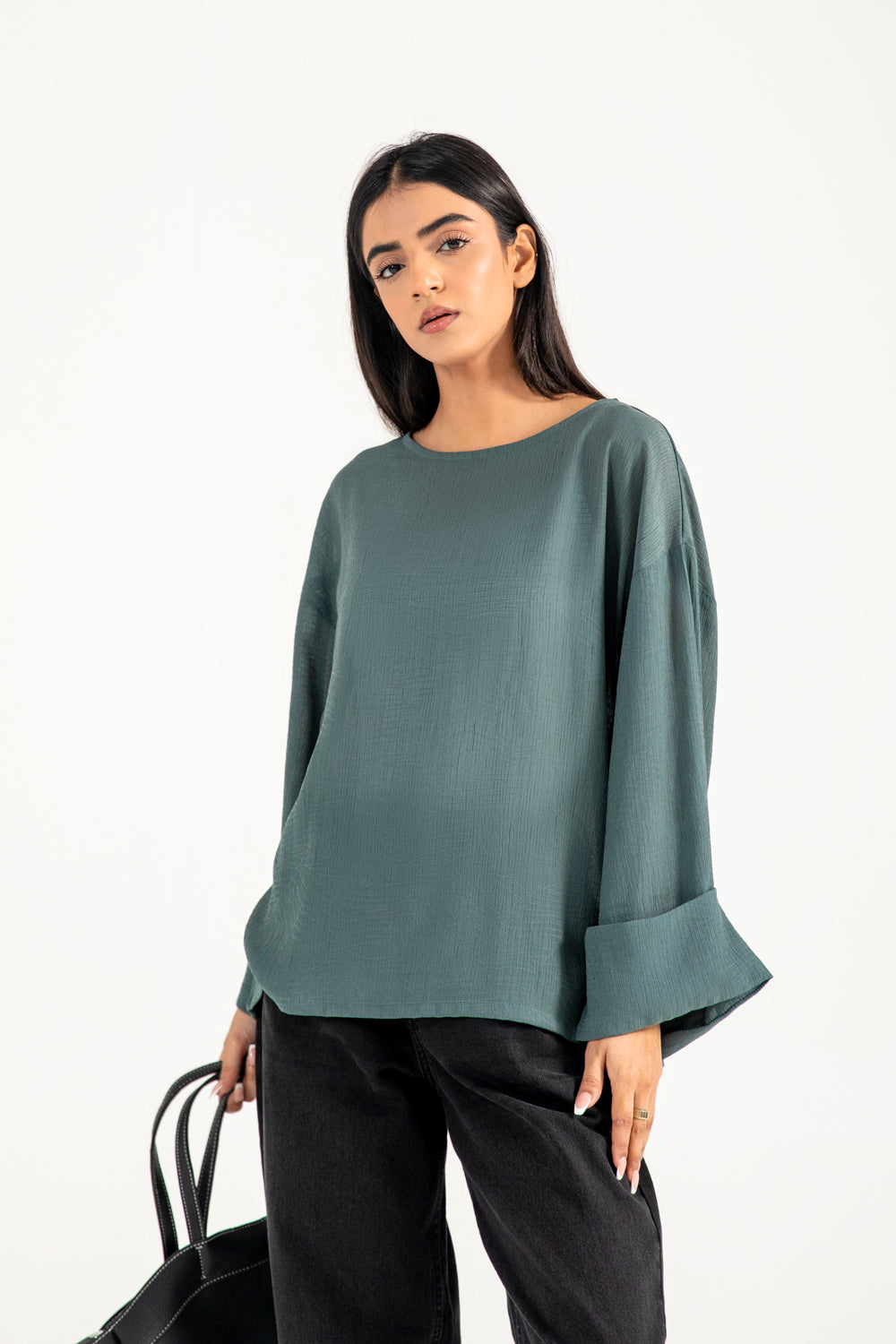 Teal jacquard top in a flowy synthetic blend, featuring oversized sleeves with a roll-up detail for a clean finish.