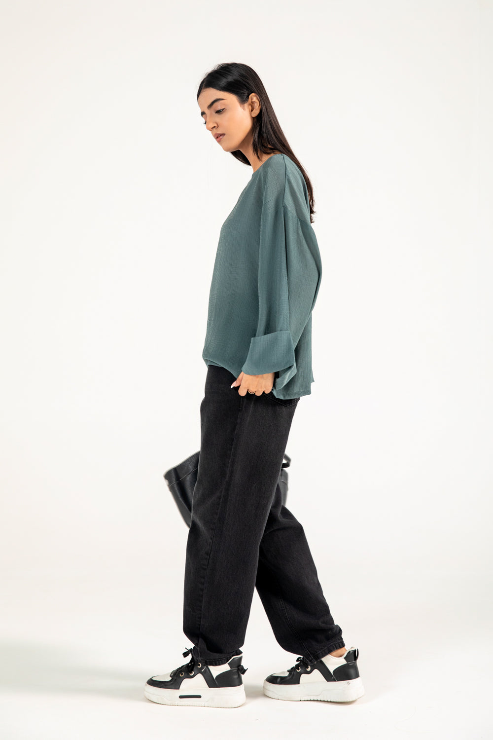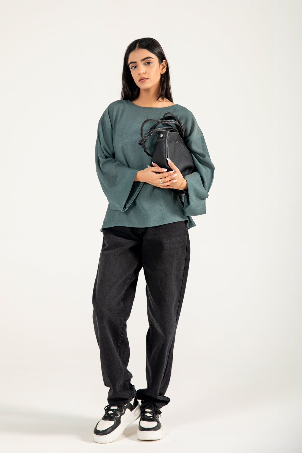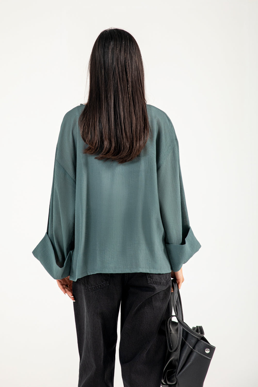 Teal jacquard top in a flowy synthetic blend, featuring oversized sleeves with a roll-up detail for a clean finish.