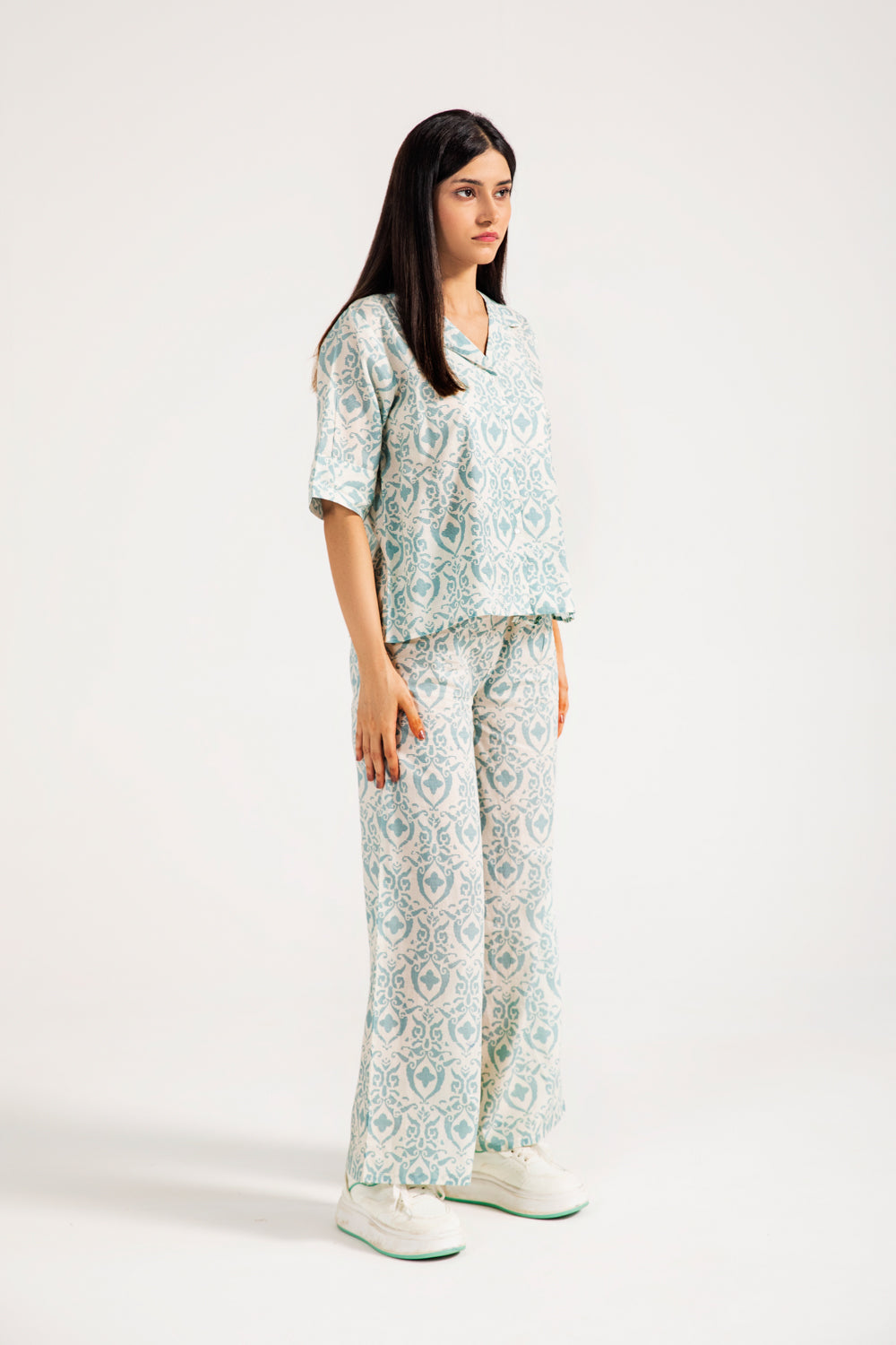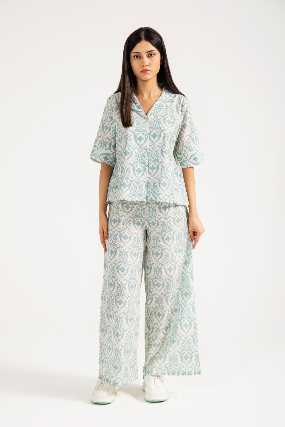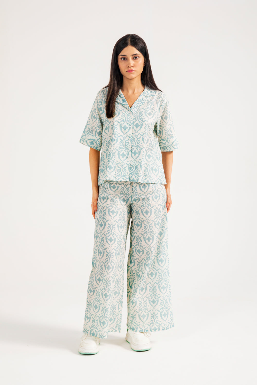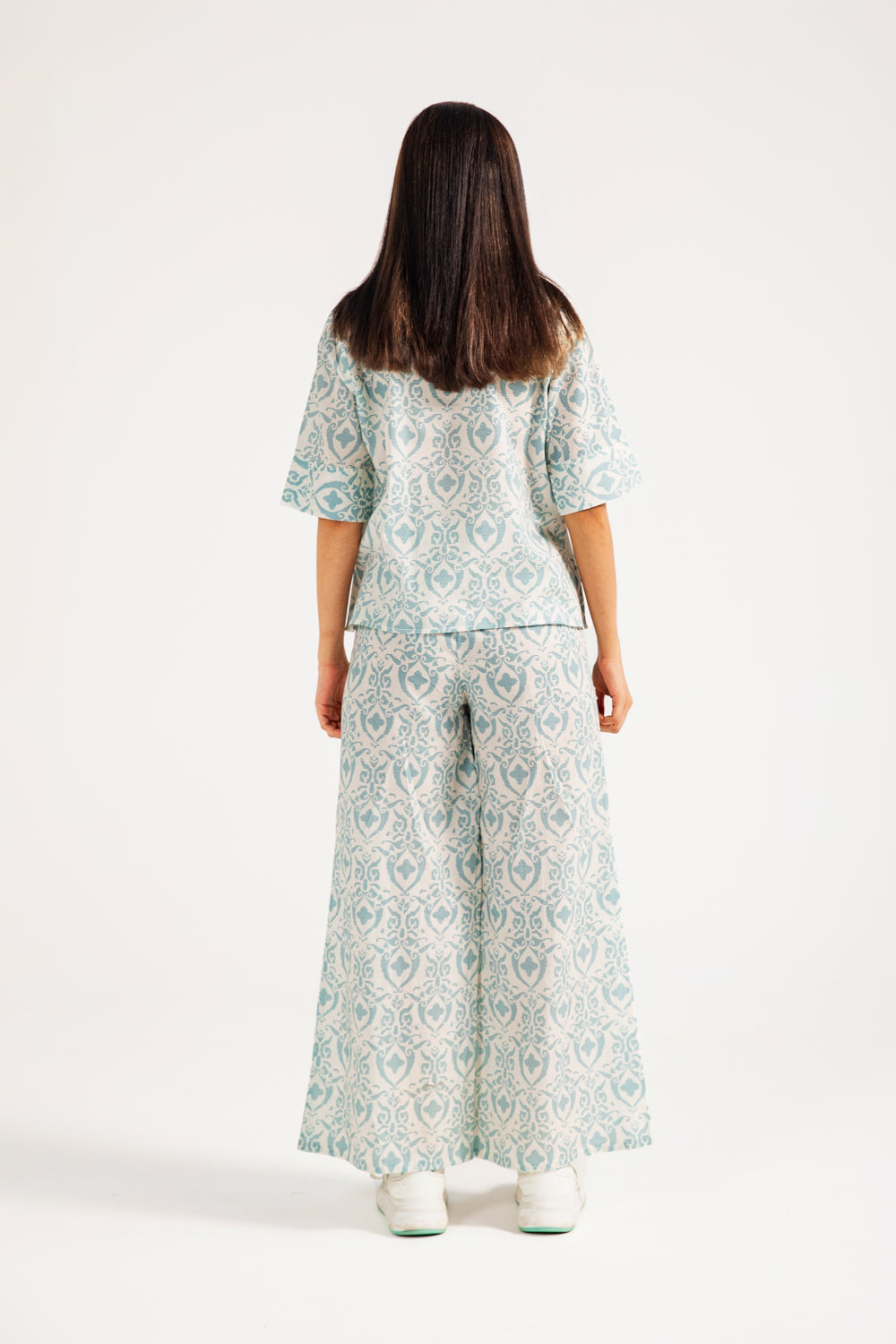 Cotton shirt with half sleeves, white button closure, and a teal and white print throughout.