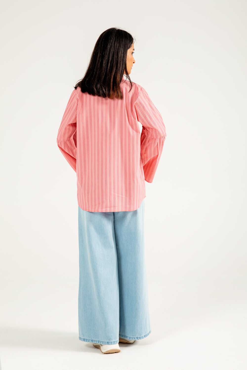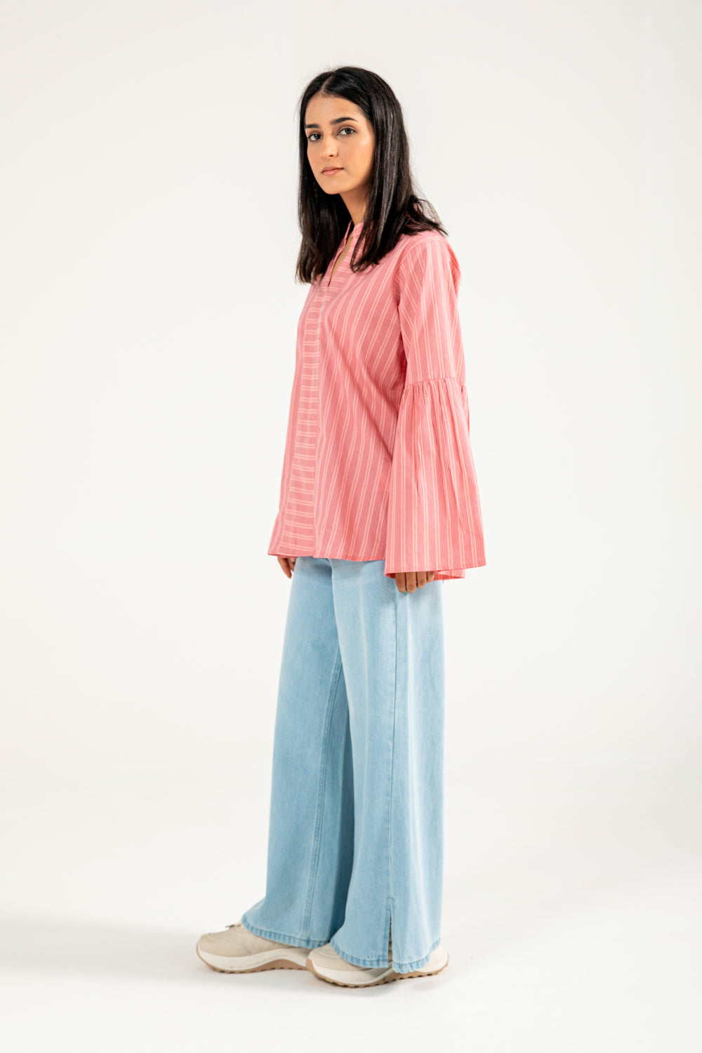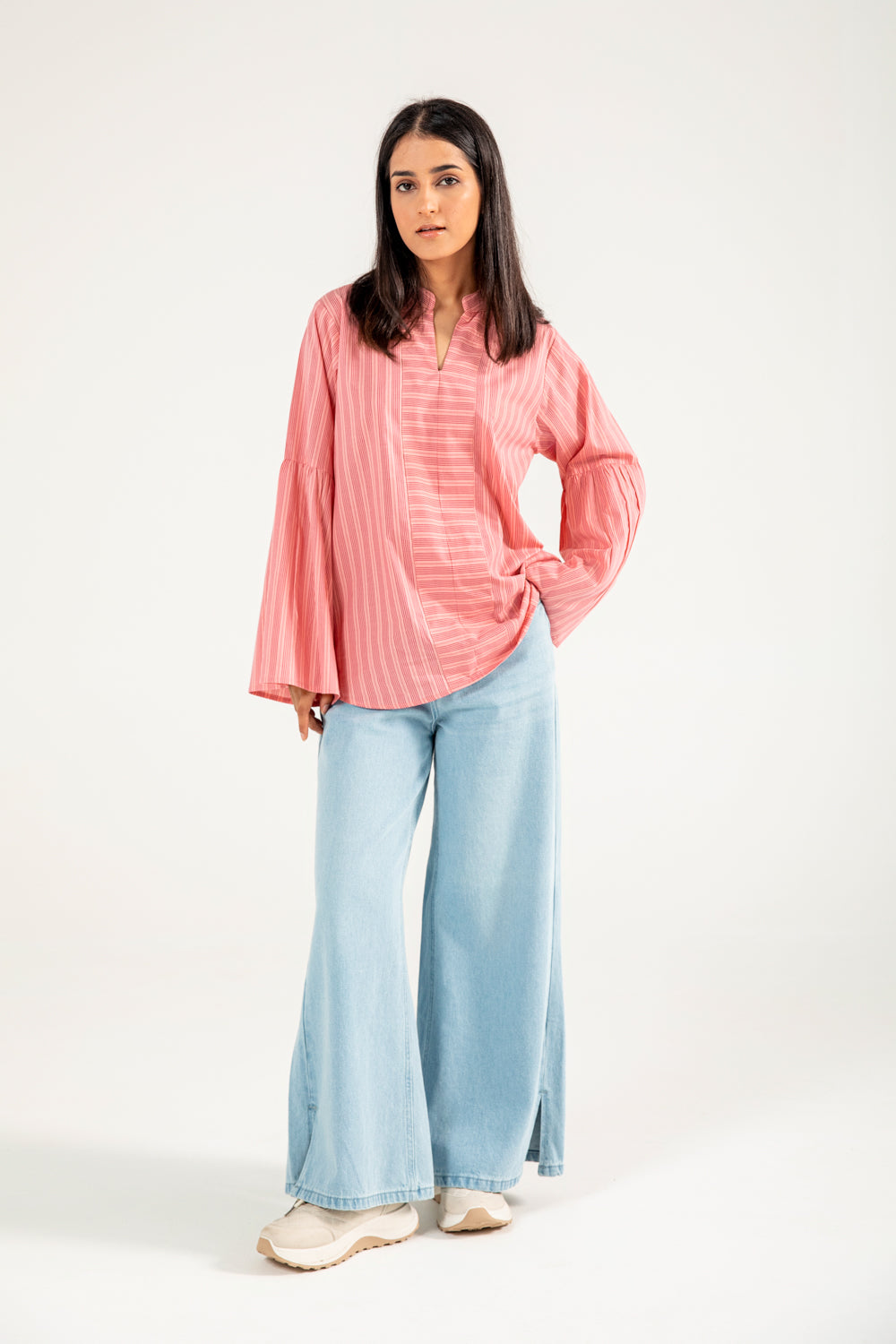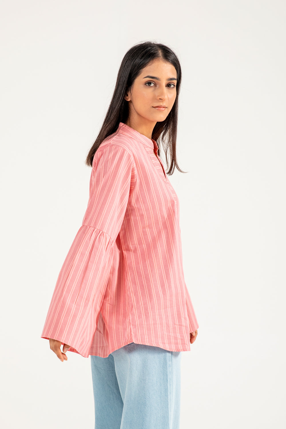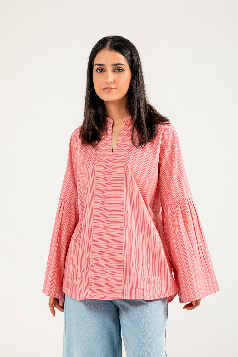 Cotton top with pink-on-pink vertical stripes, featuring a tunic inspired silhouette and soft sleeve detailing.