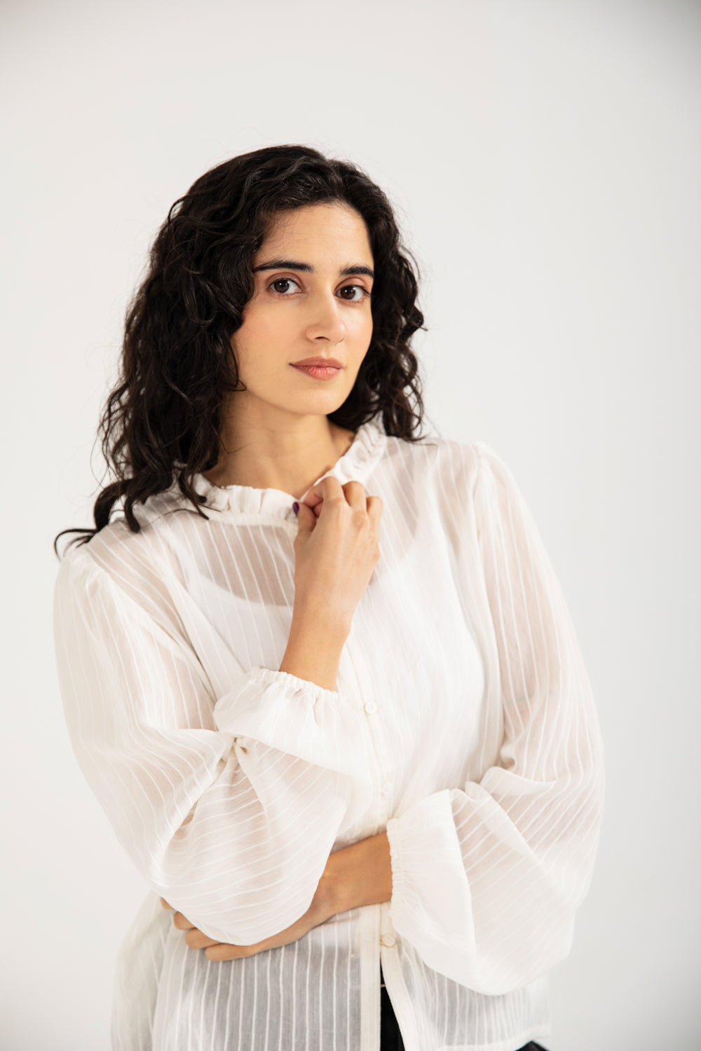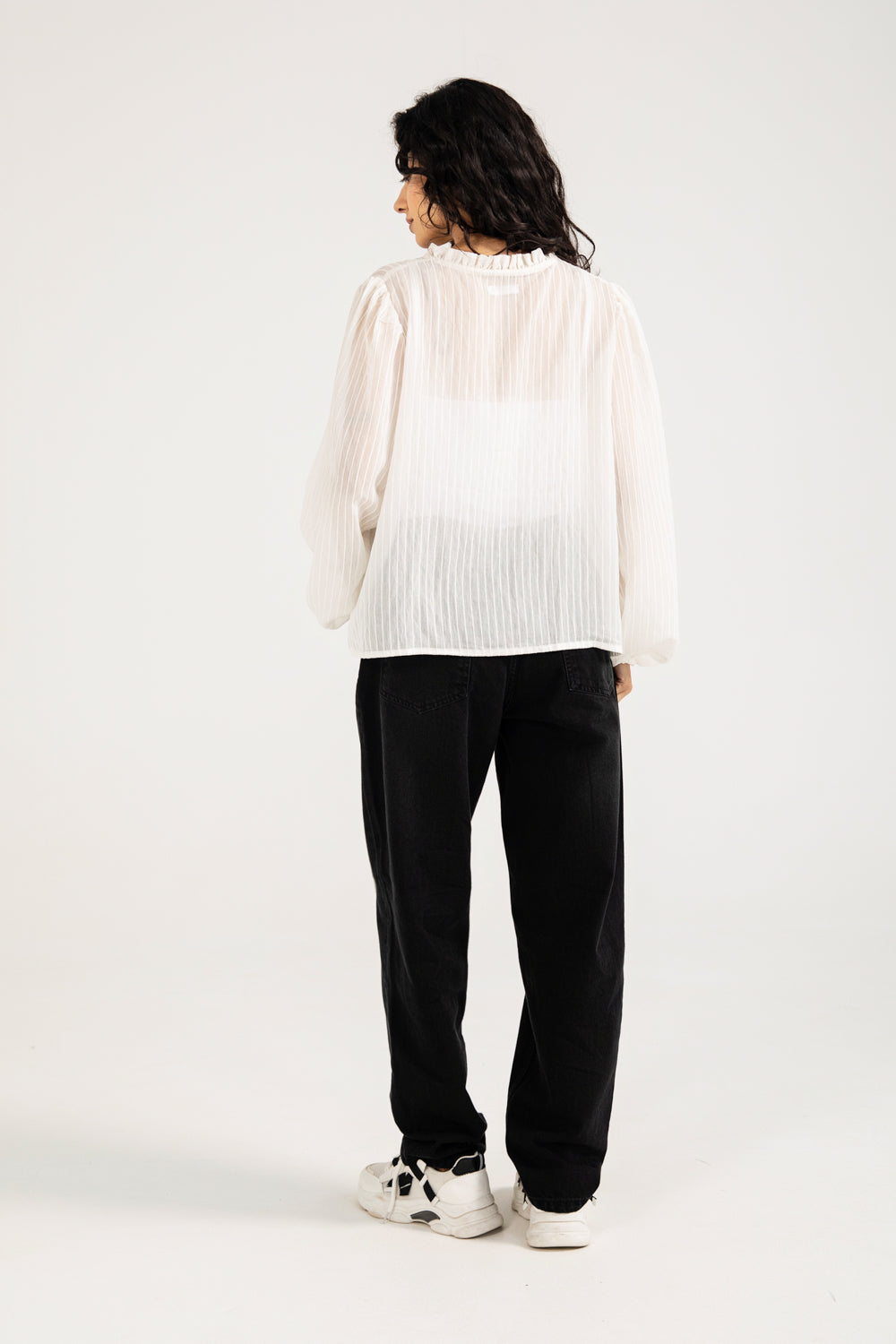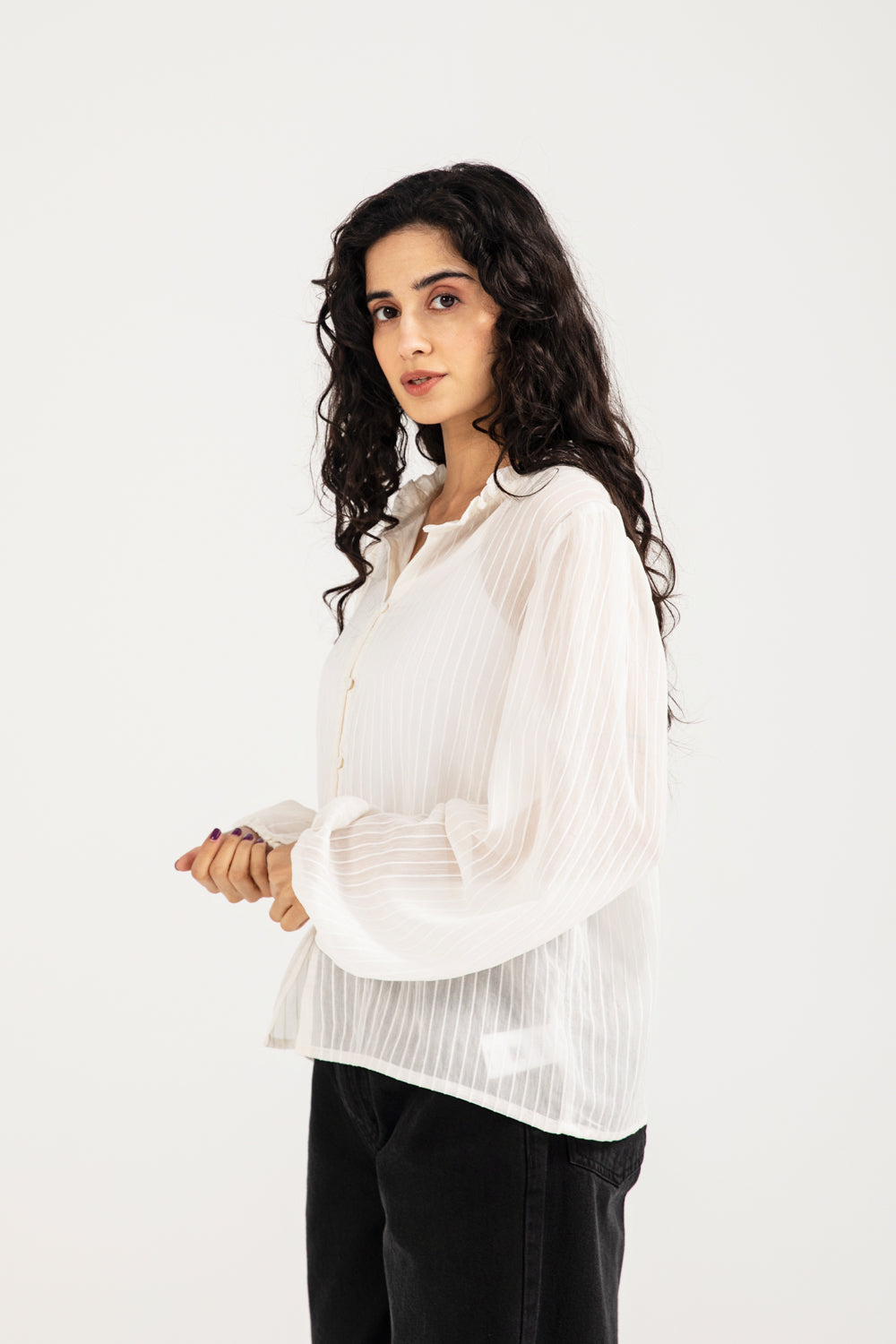 Sheer synthetic blouse with a textured vertical stripe design, featuring full length sleeves with elasticated cuffs, matching white buttons, and a pleated trim along the neckline.