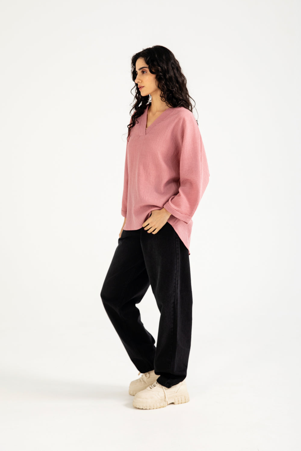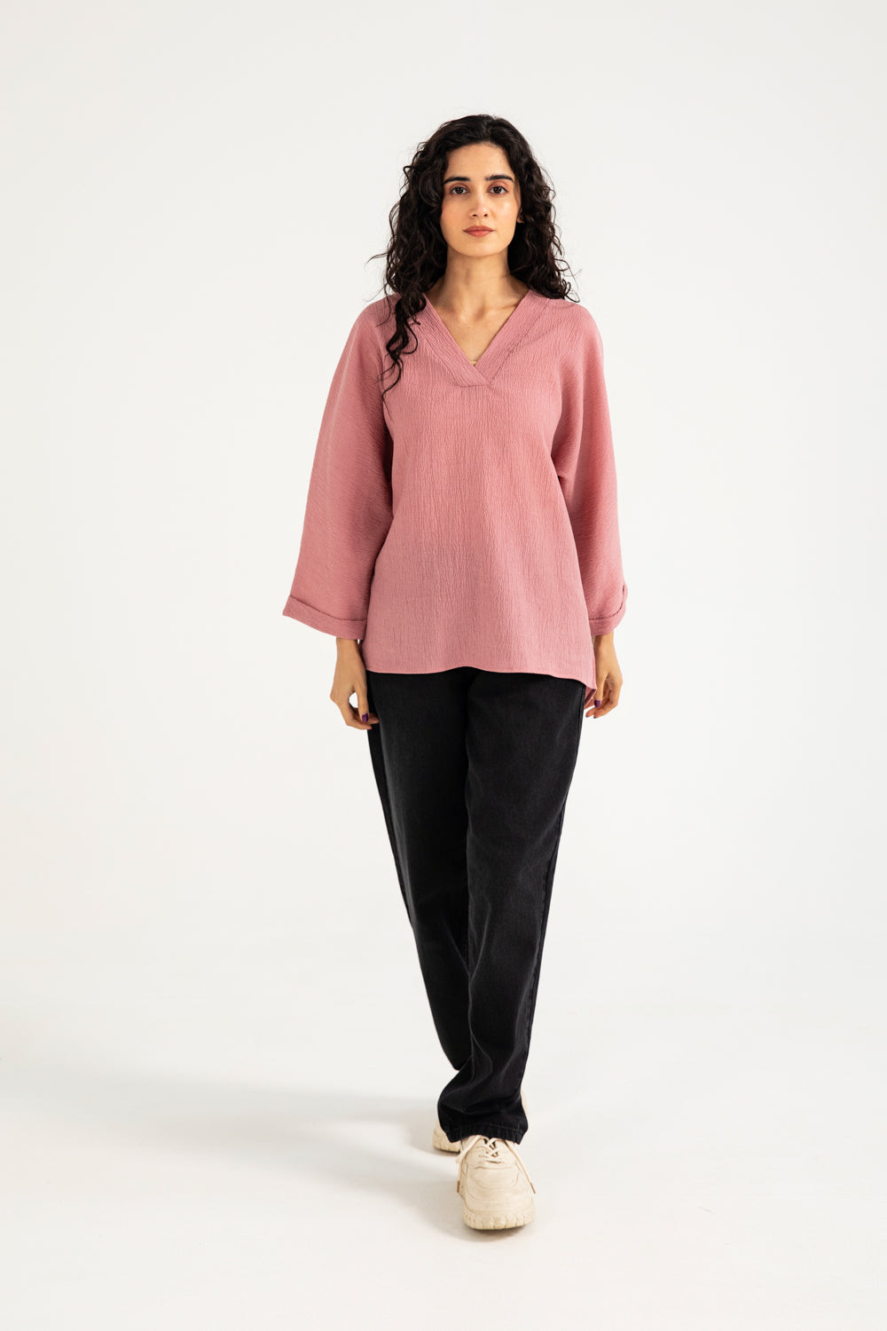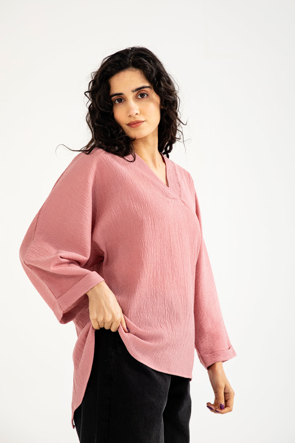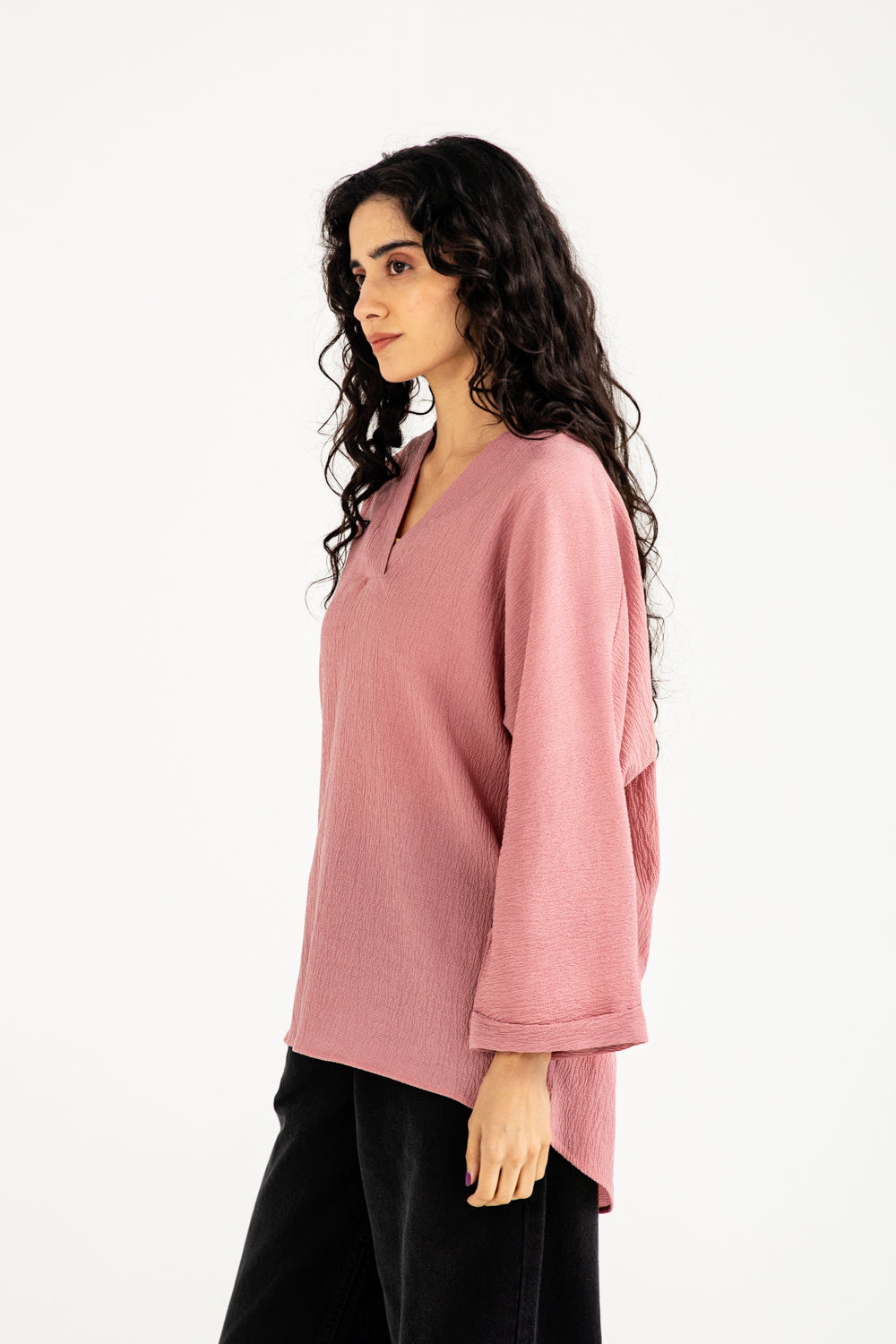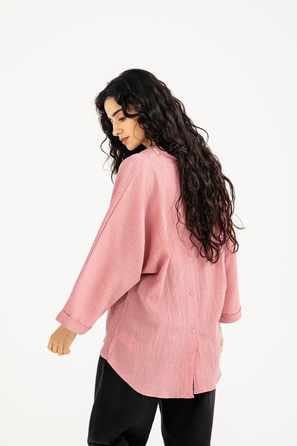 Crafted from a textured synthetic blend in dusky pink, this top features a wide V neckline, full length sleeves, and button down detailing along the back.