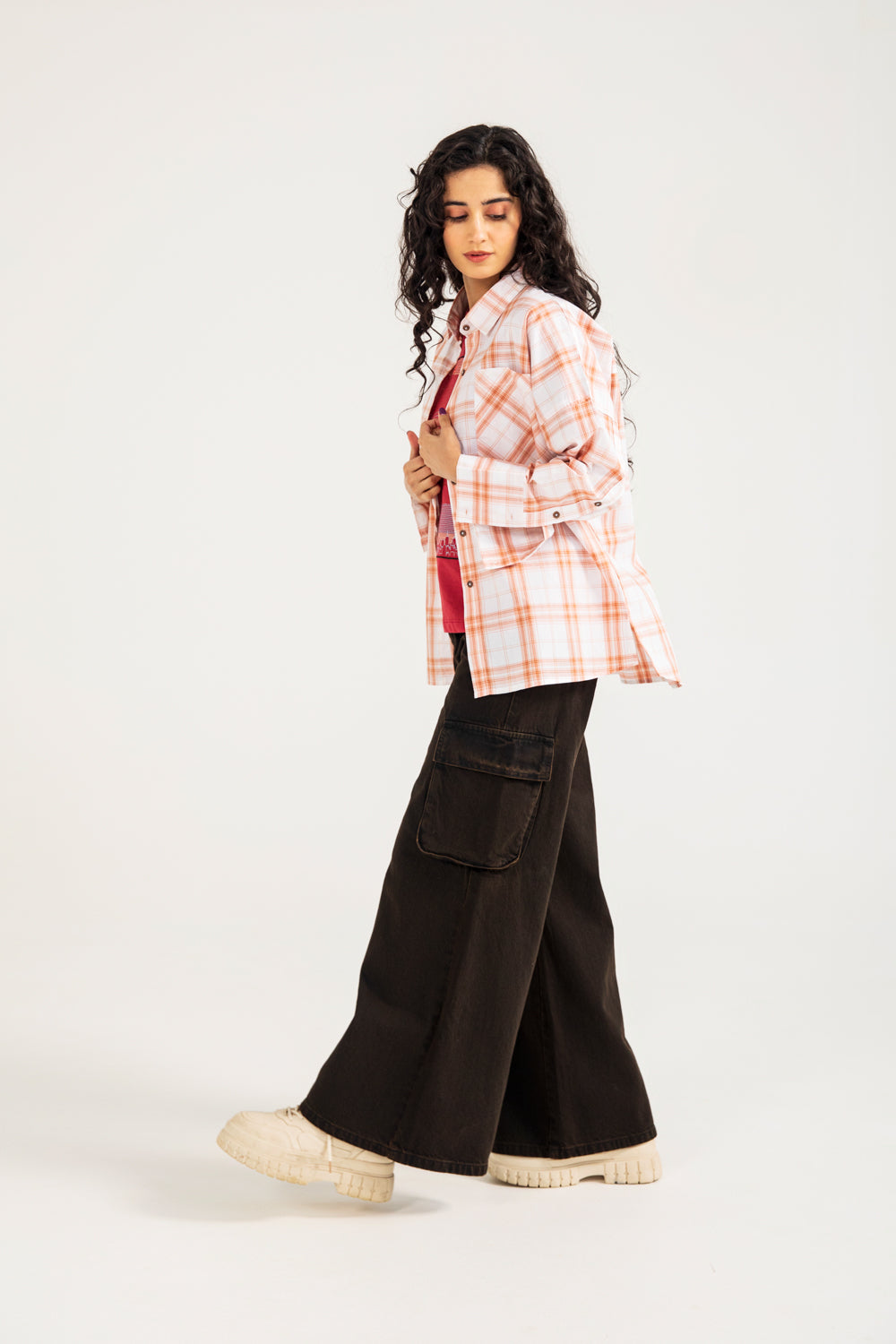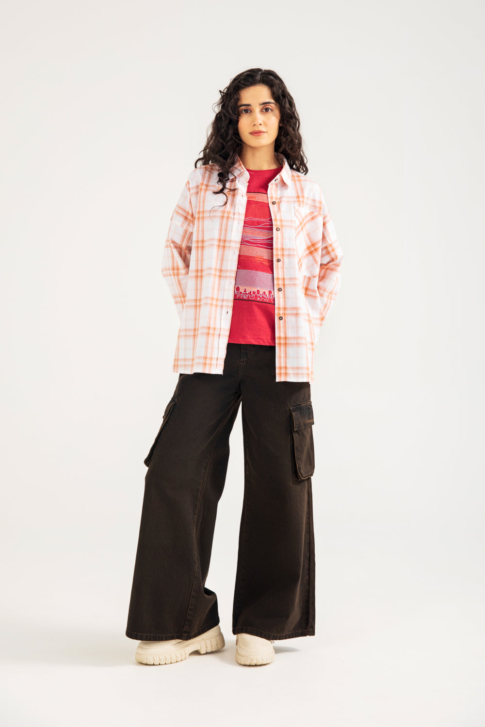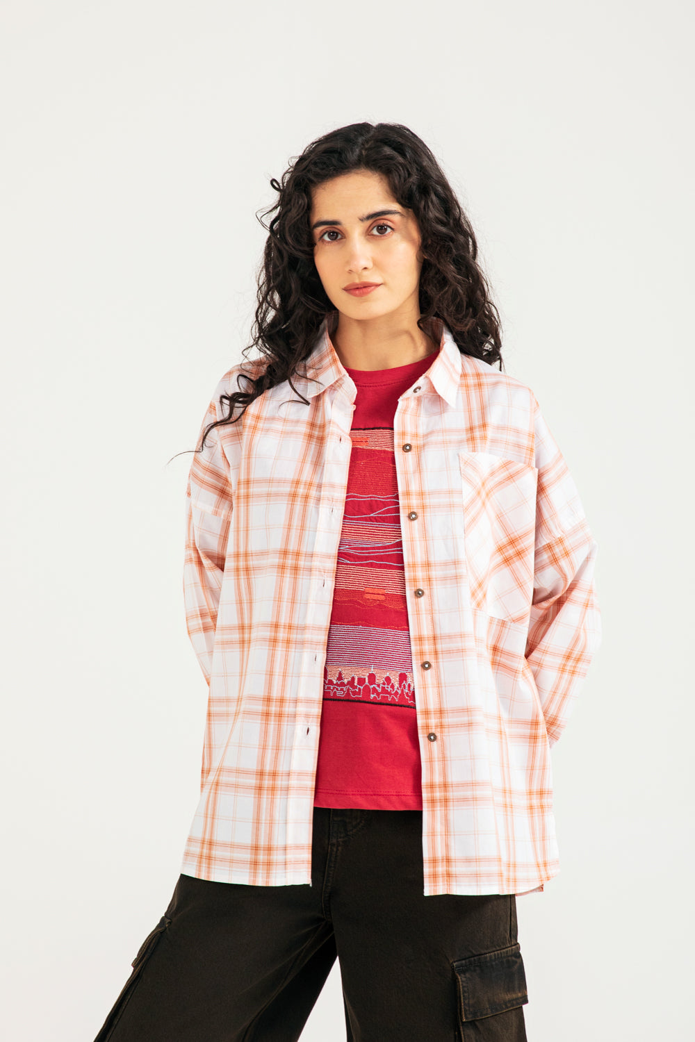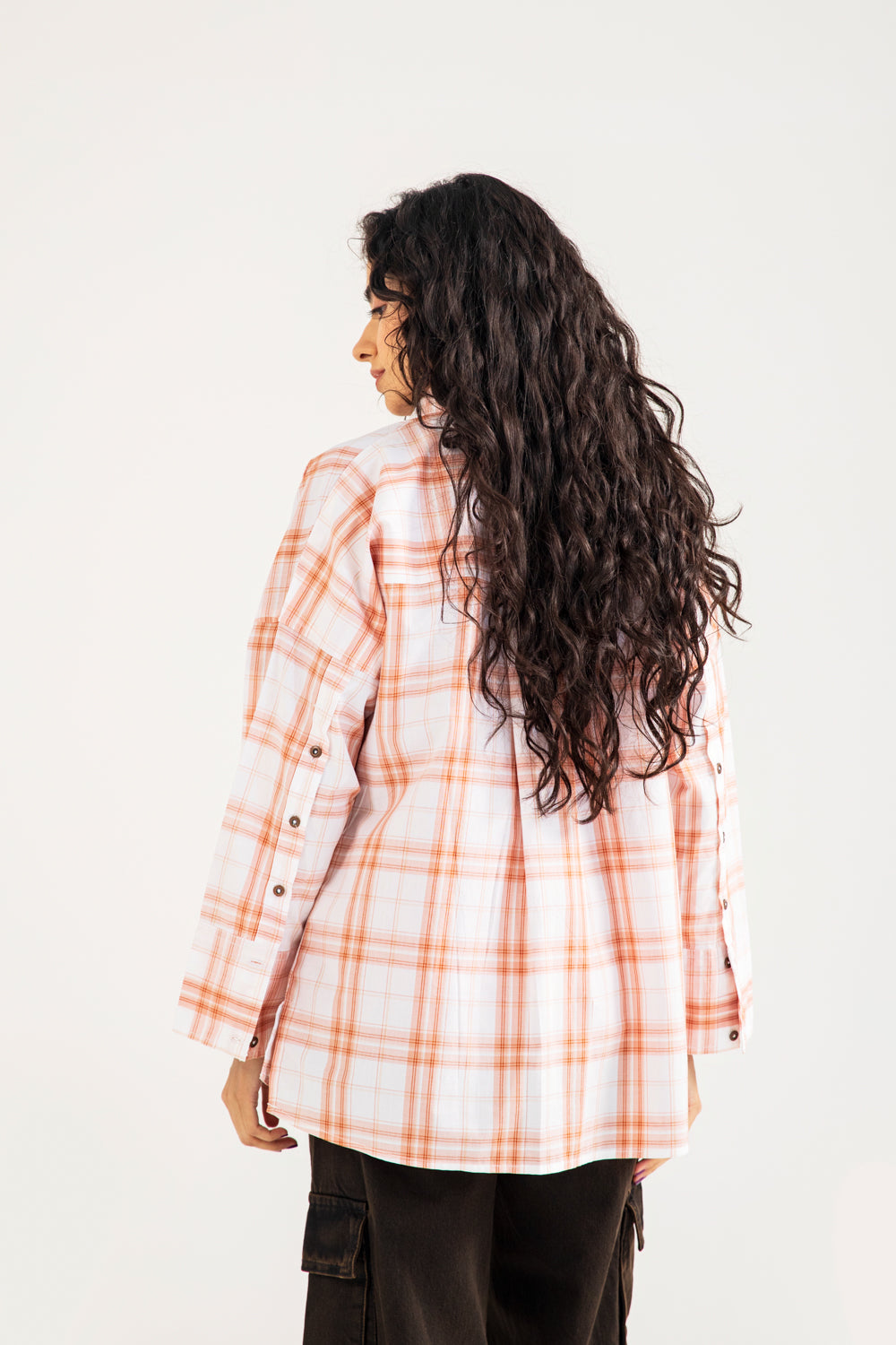 Cotton shirt in an orange and white checkered pattern, designed with contrasting buttons and full length sleeves finished with multiple button details on the cuffs.