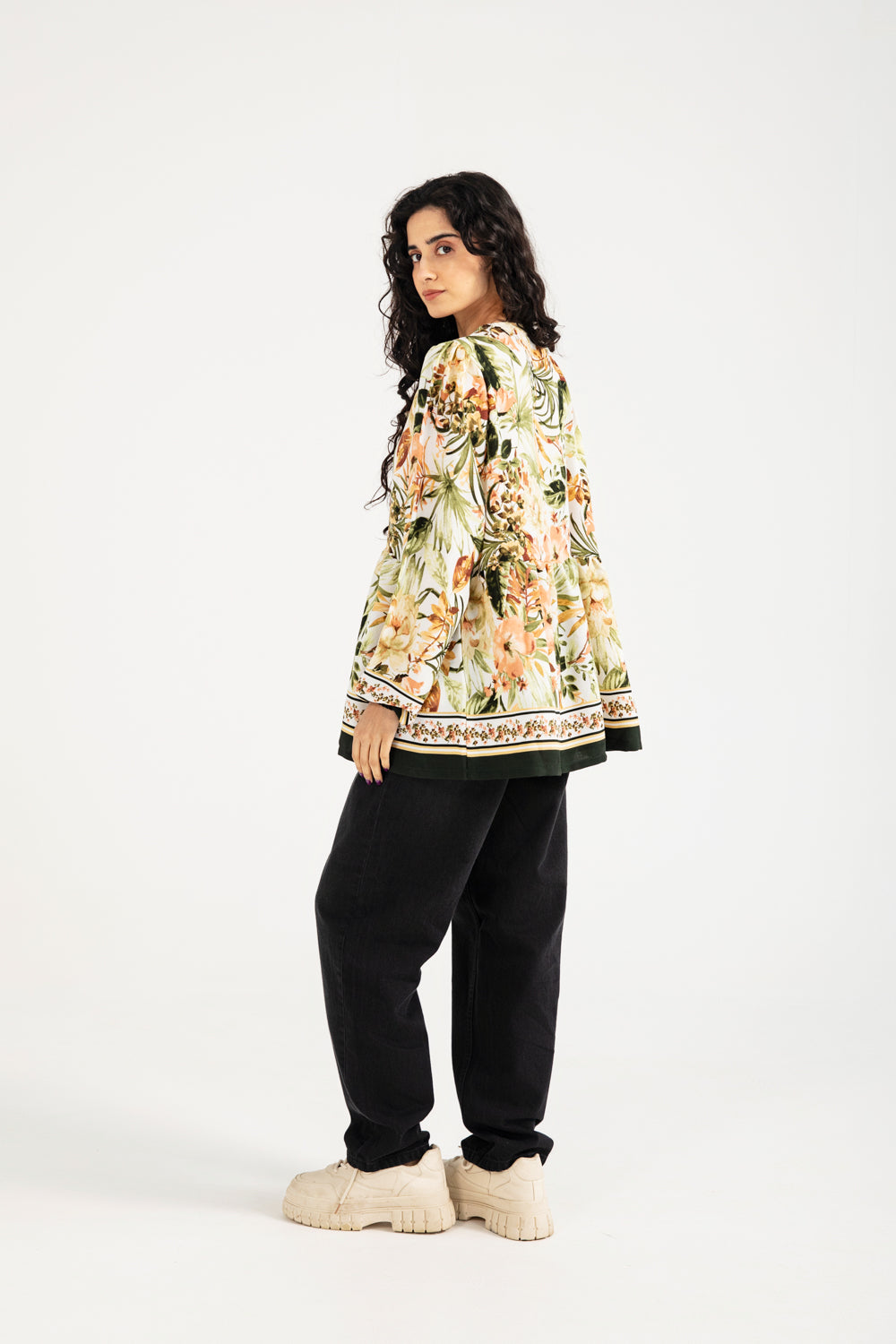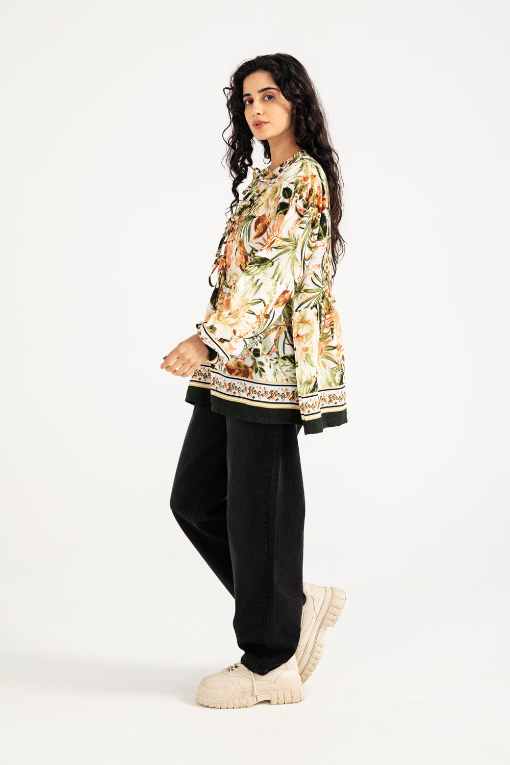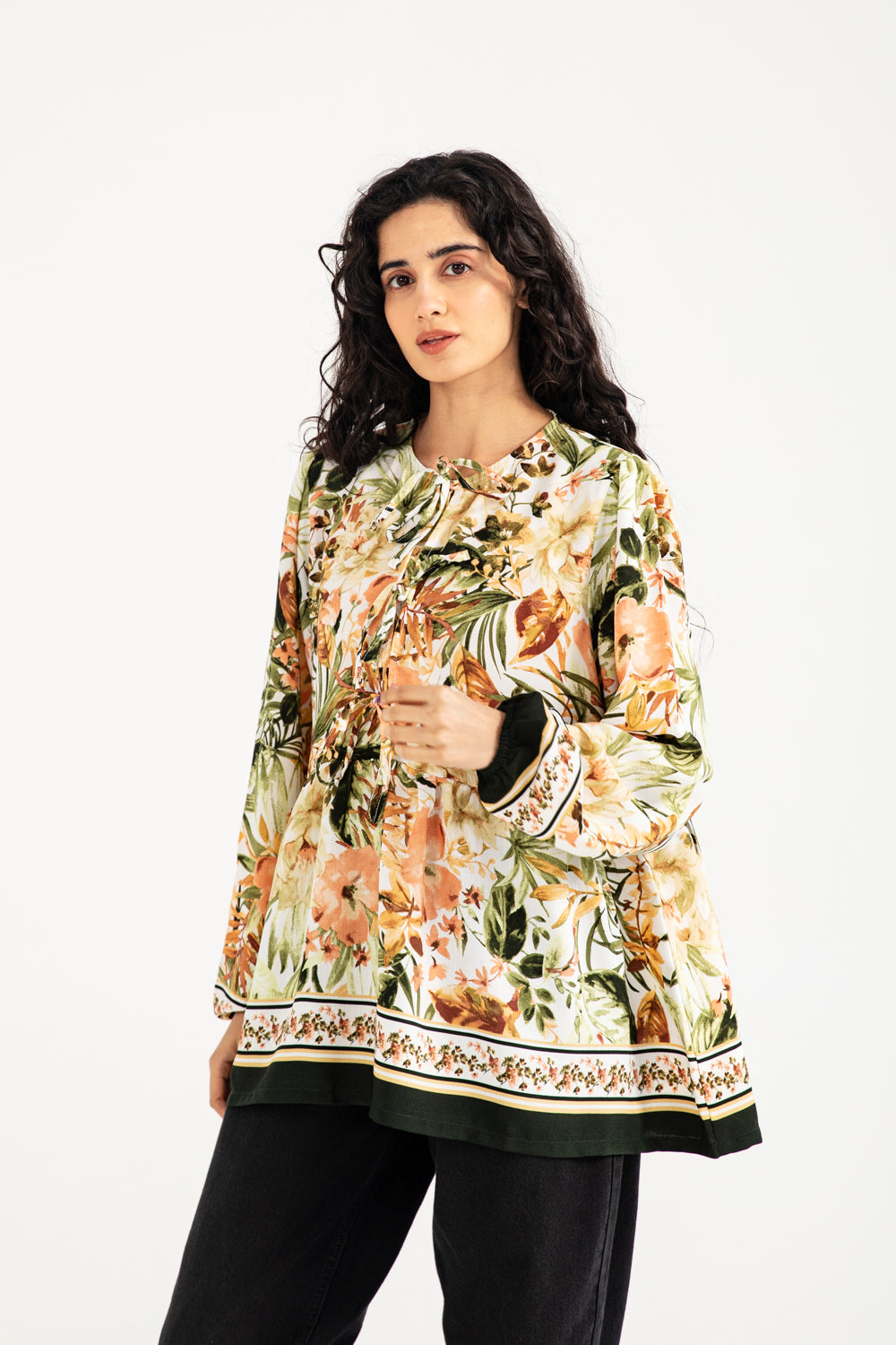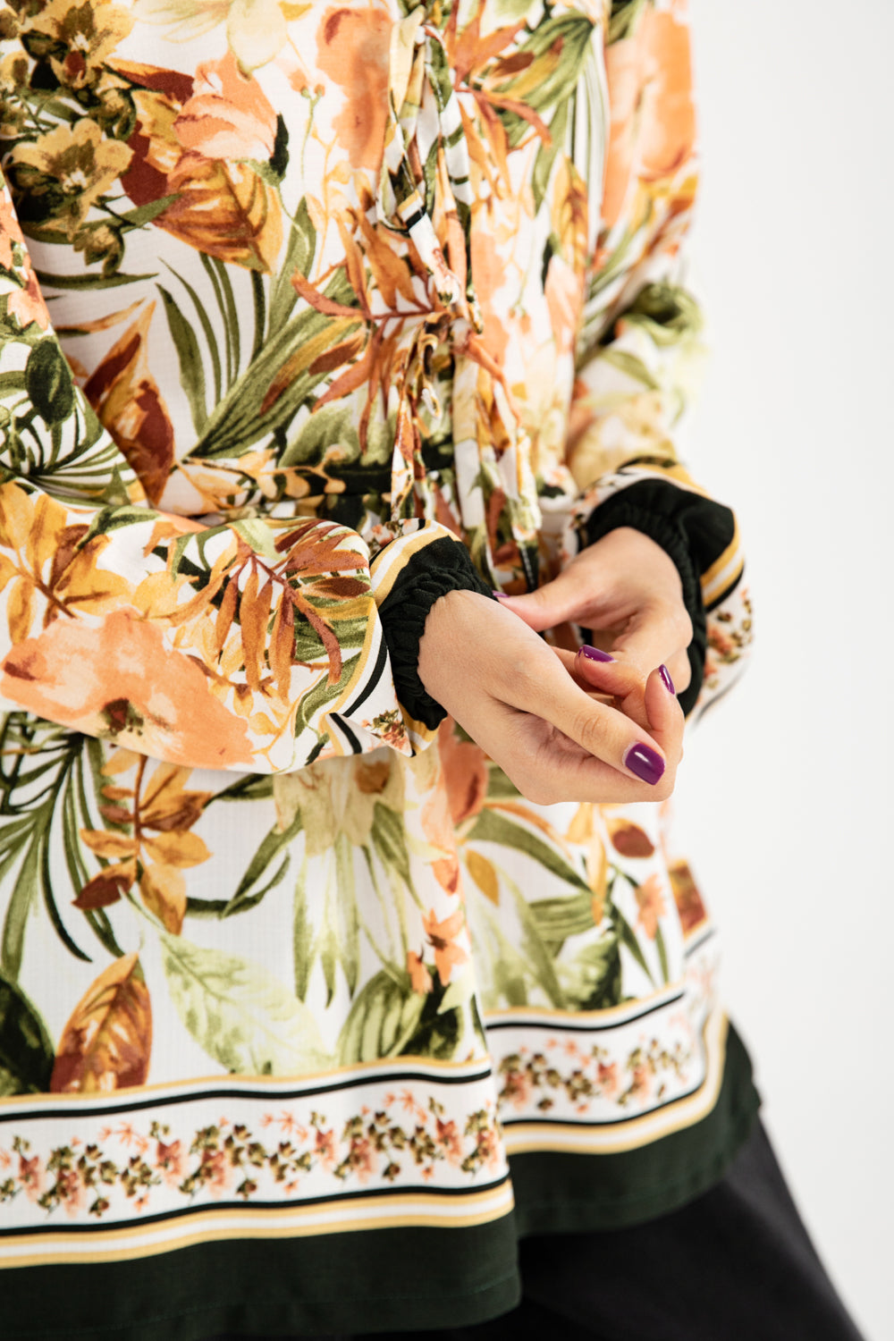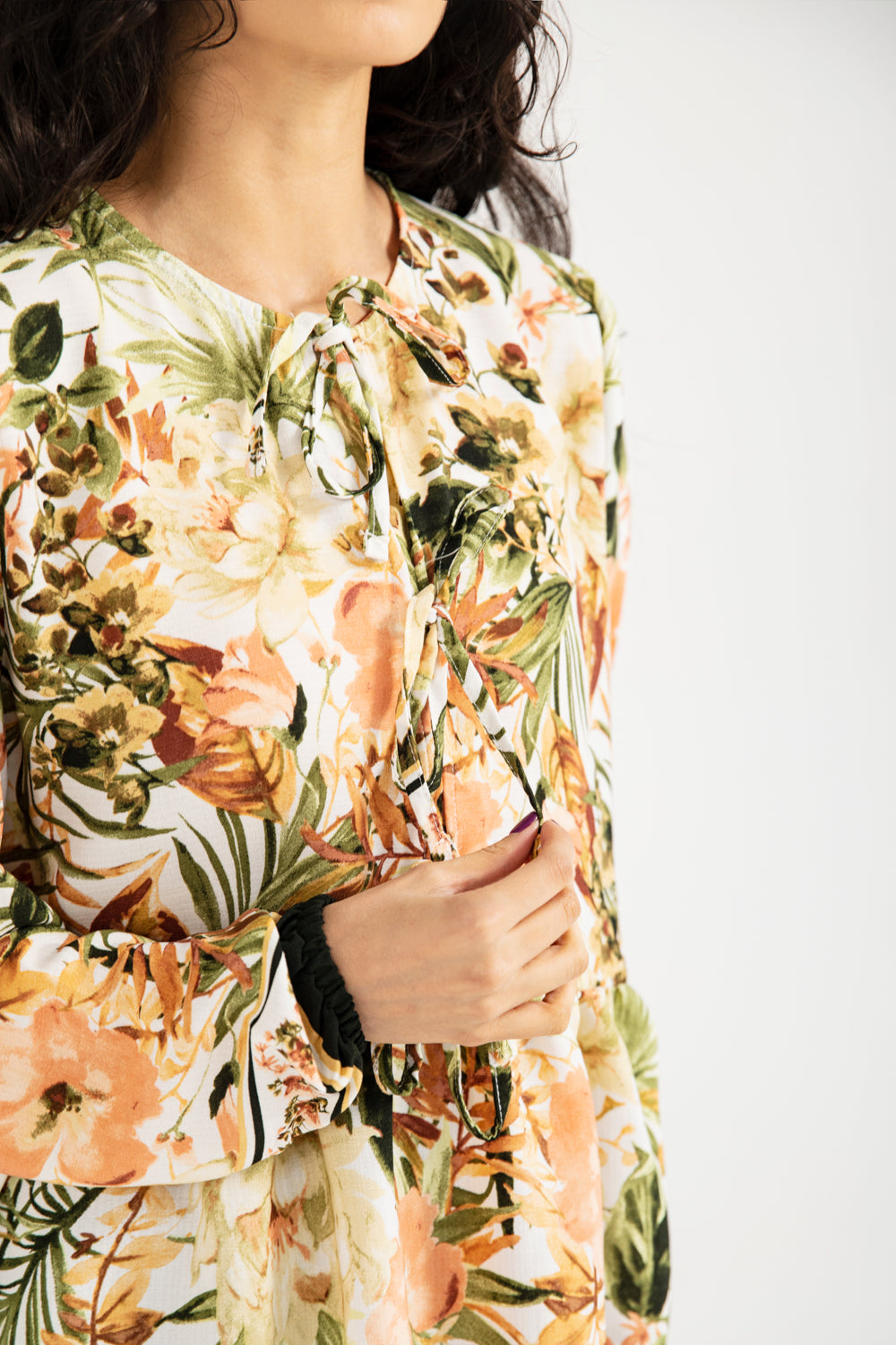 Peplum top in a soft synthetic blend with an all-over floral print in earthy tones, featuring tied bow fastenings down the front and full length sleeves with elasticated cuffs.