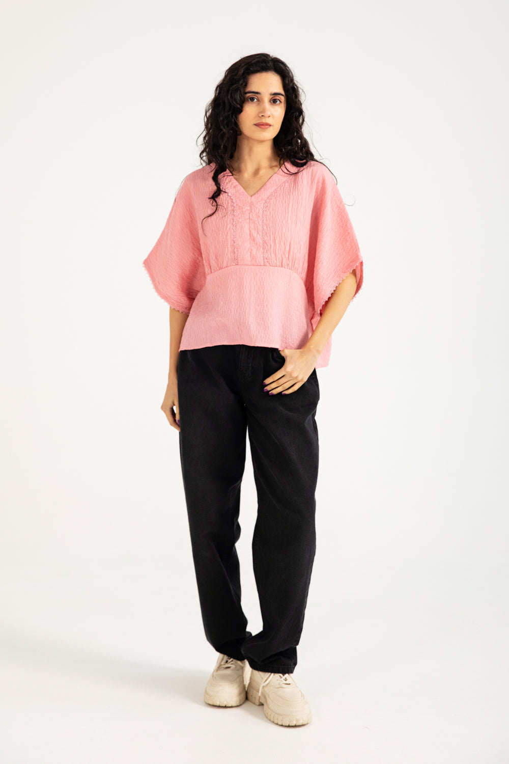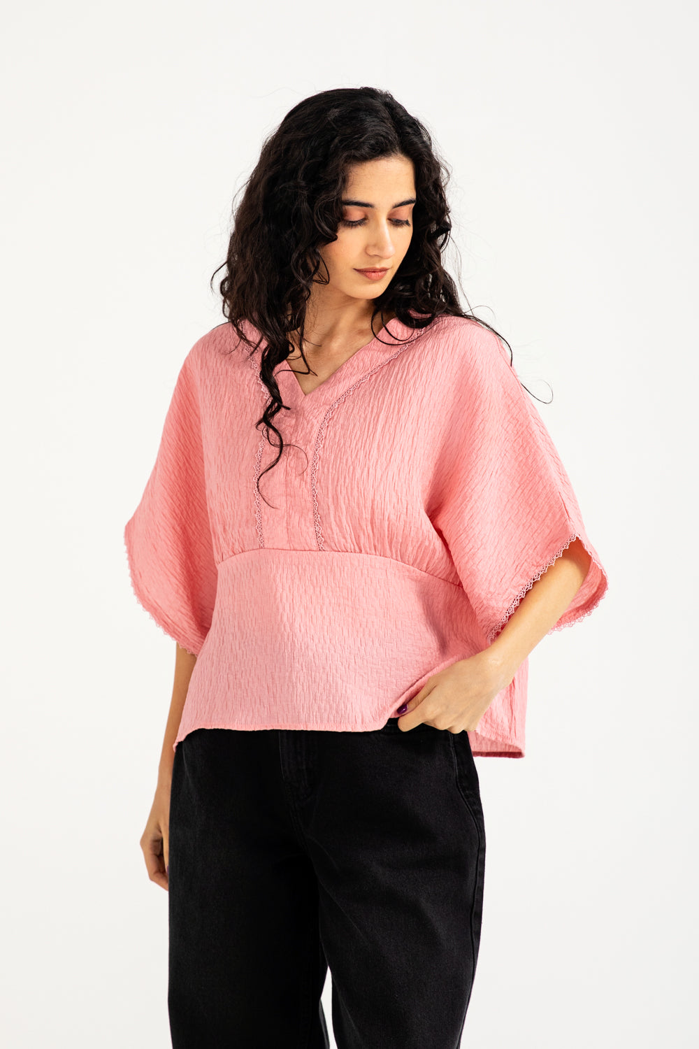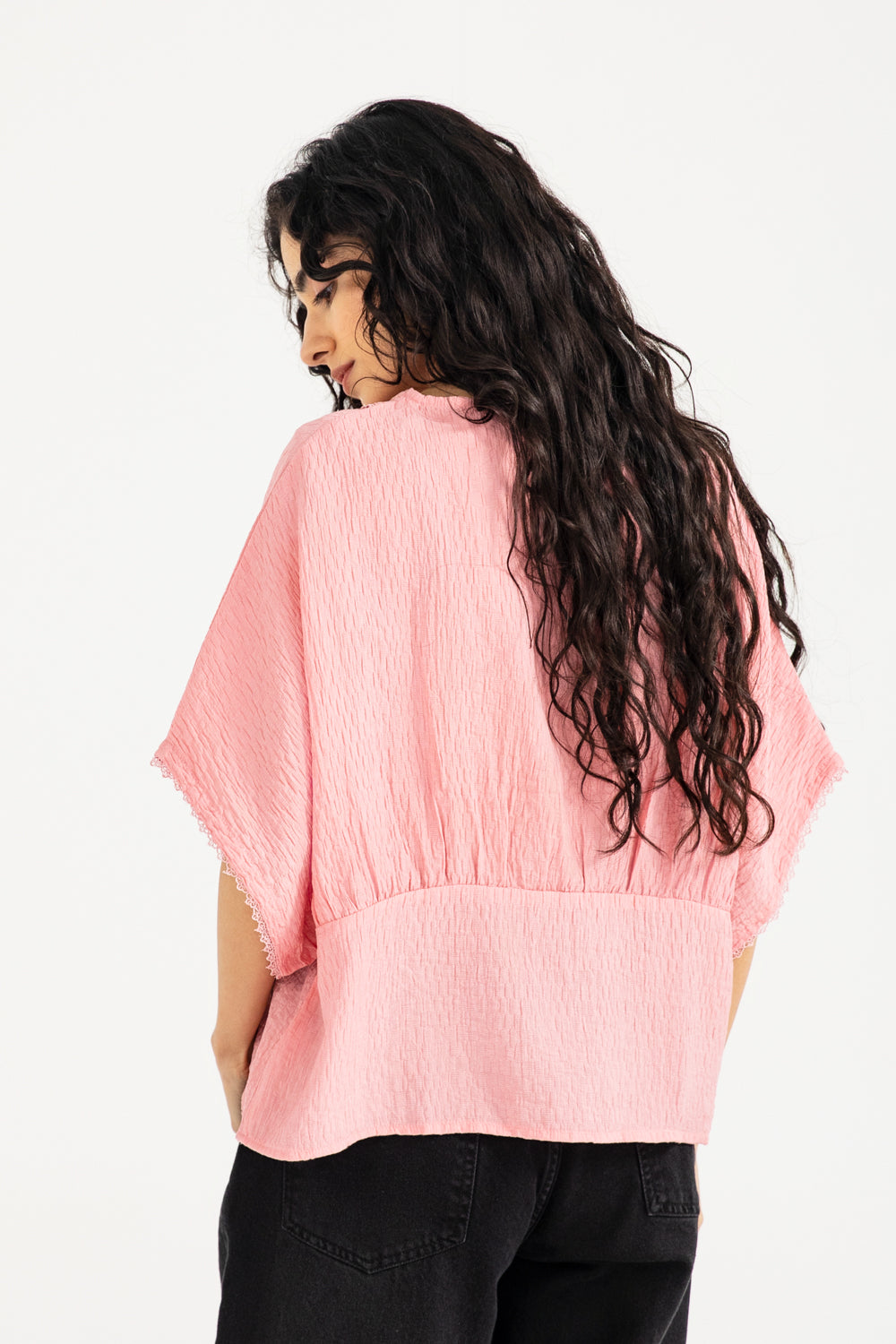 Kimono-style top in a soft pink textured synthetic blend, finished with delicate lace along the neckline and sleeve hems for a subtle graceful finish.
