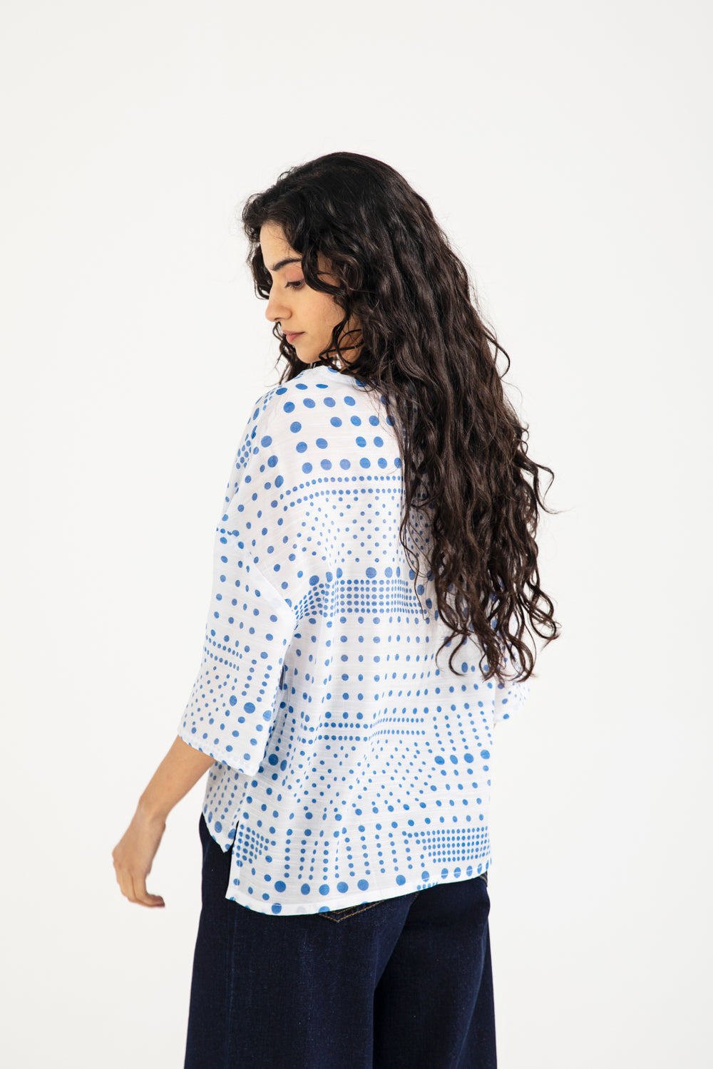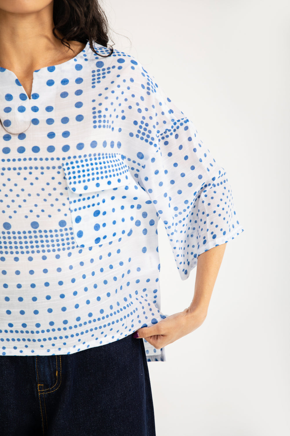 White semi sheer top in a lightweight synthetic blend, patterned with blue polka dots and finished with a flap pocket on the left chest.