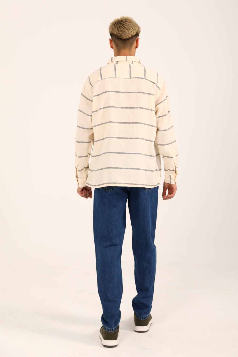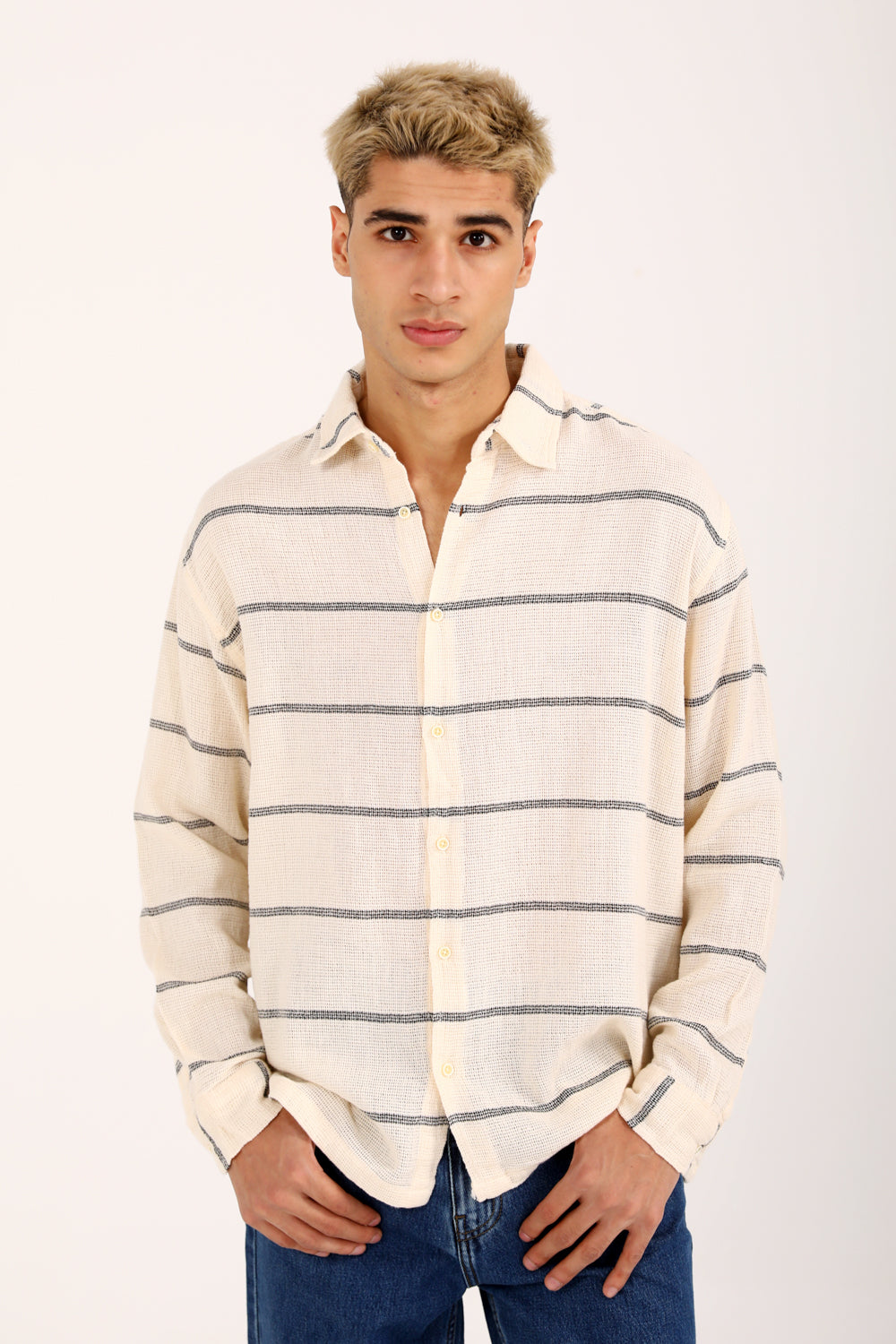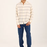 An off white dobby shirt designed in a relaxed baggy fit, featuring horizontal stripes and a classic button down front.