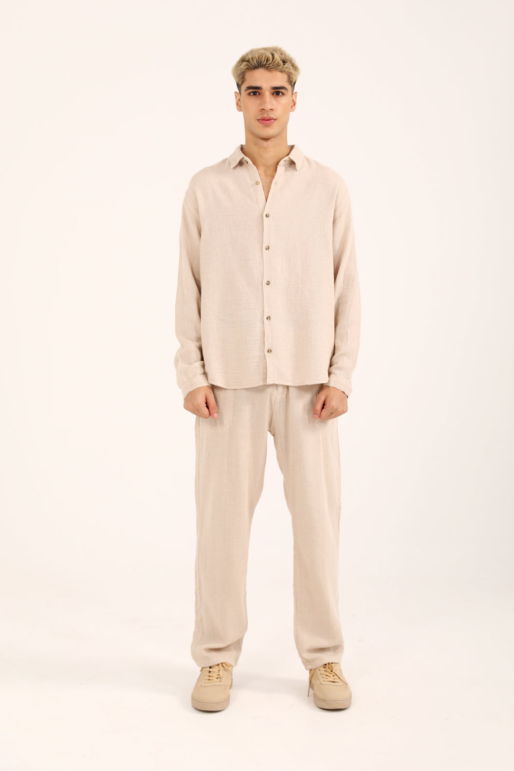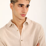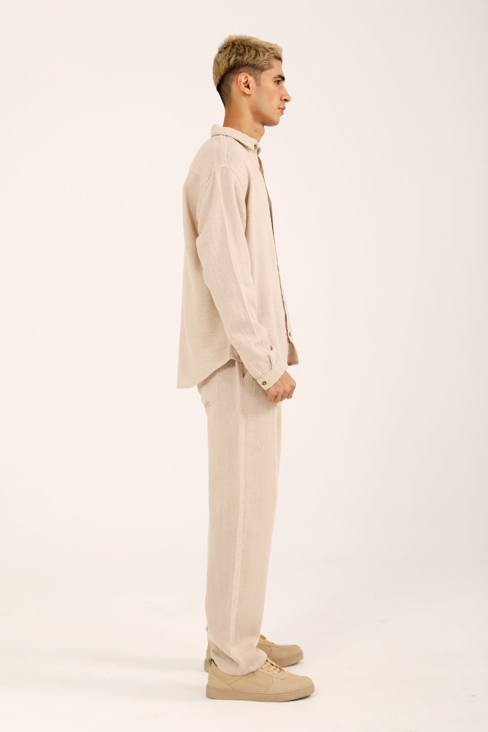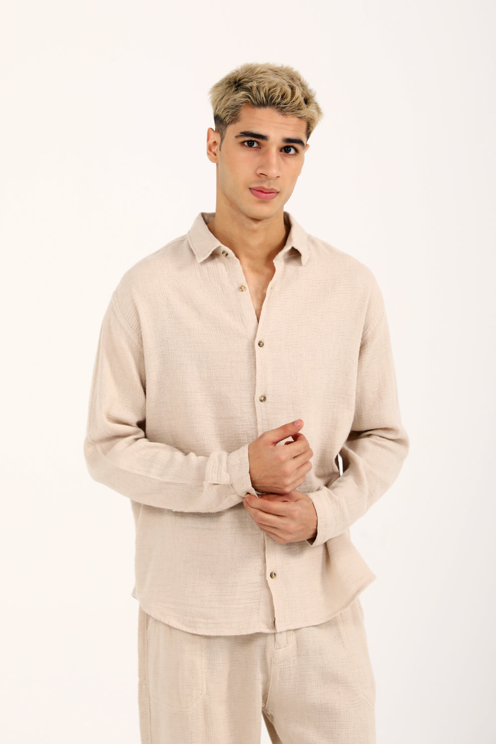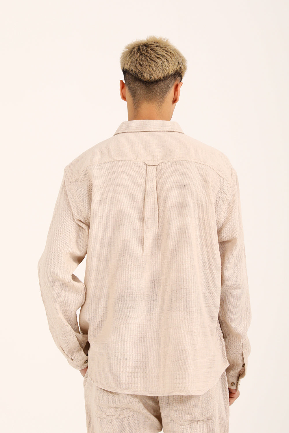 A stone colored dobby shirt crafted in a relaxed baggy fit, featuring a textured finish with full length sleeves and a button down front.