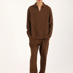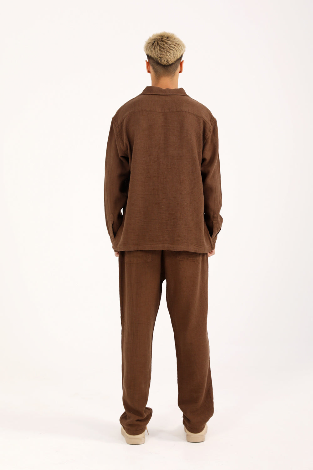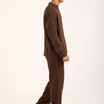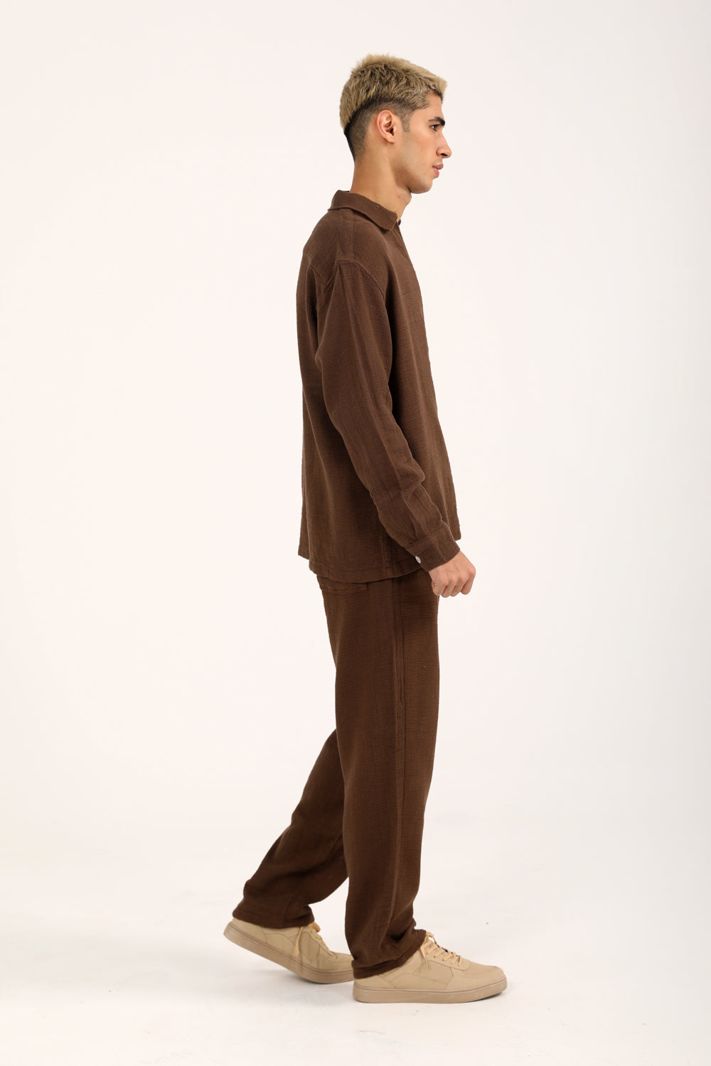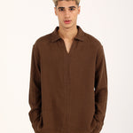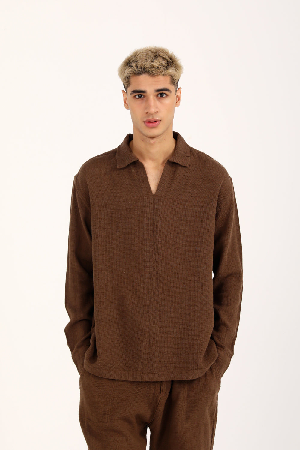 A brown dobby shirt featuring a textured surface and full length sleeves, designed in a relaxed baggy fit.