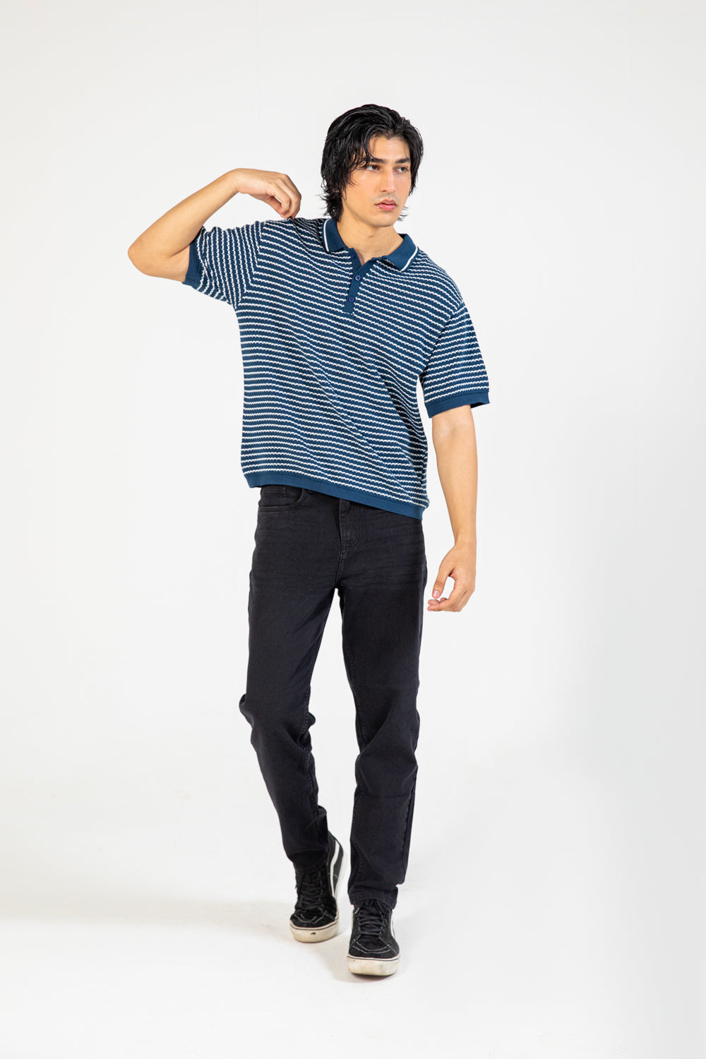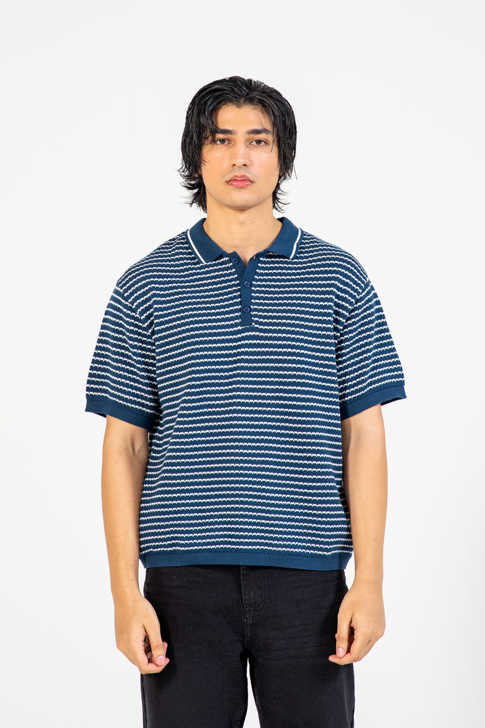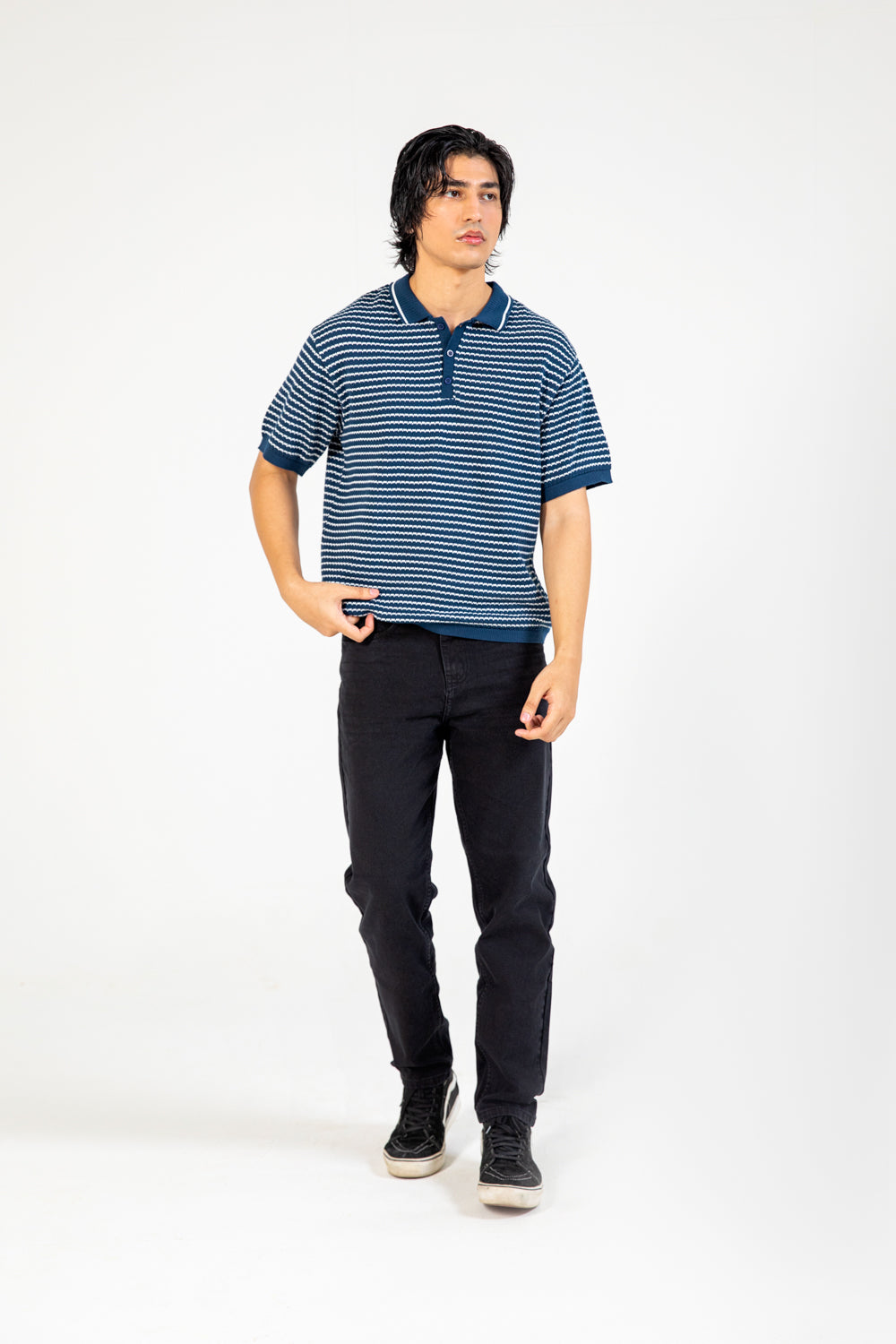 A navy polo with a knitted texture, finished with white horizontal stripes and matching buttons for a classic feel.