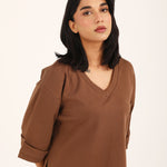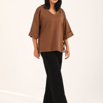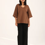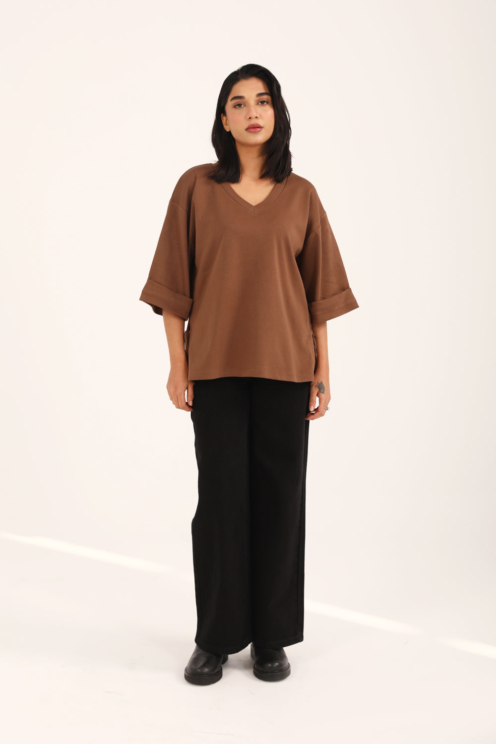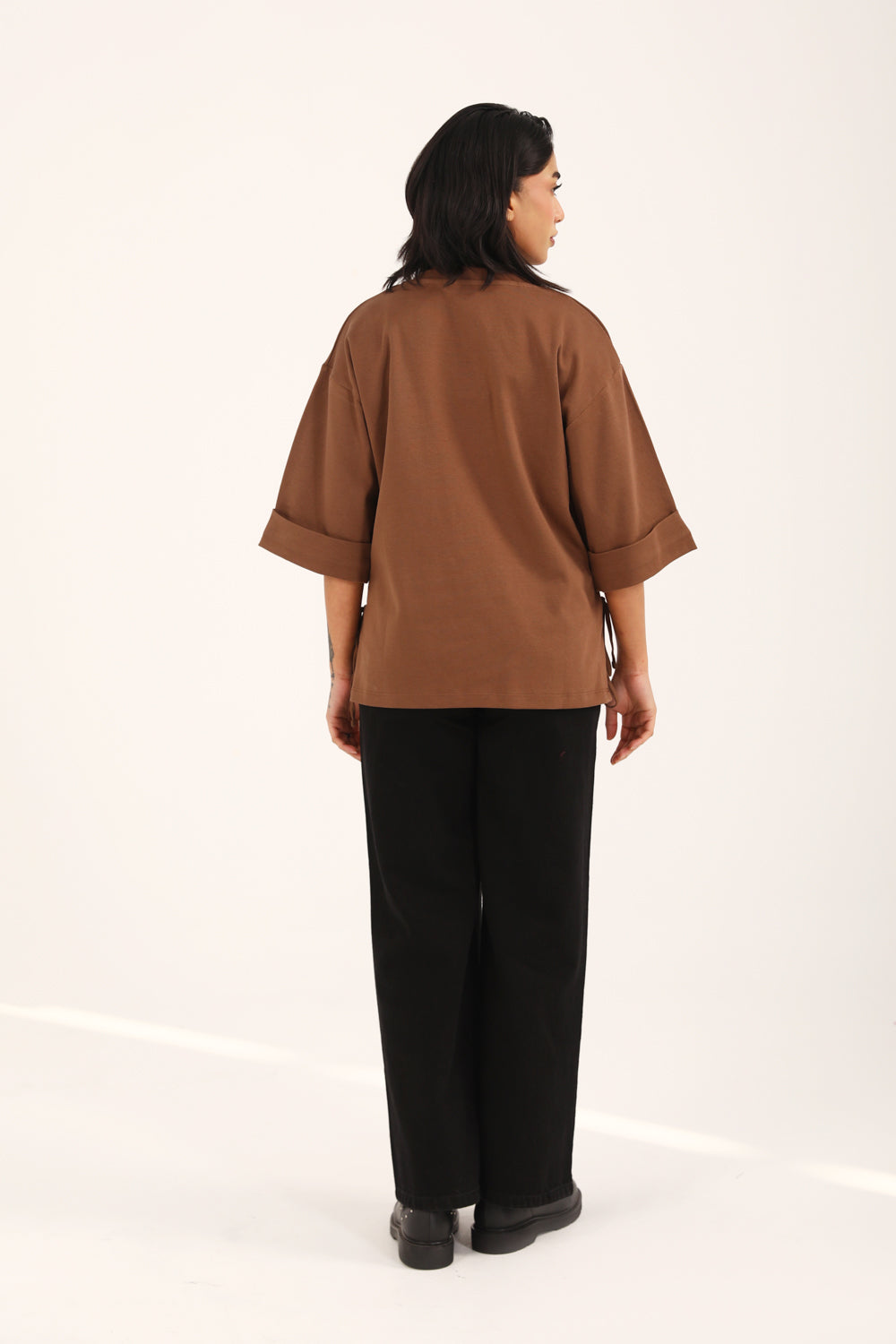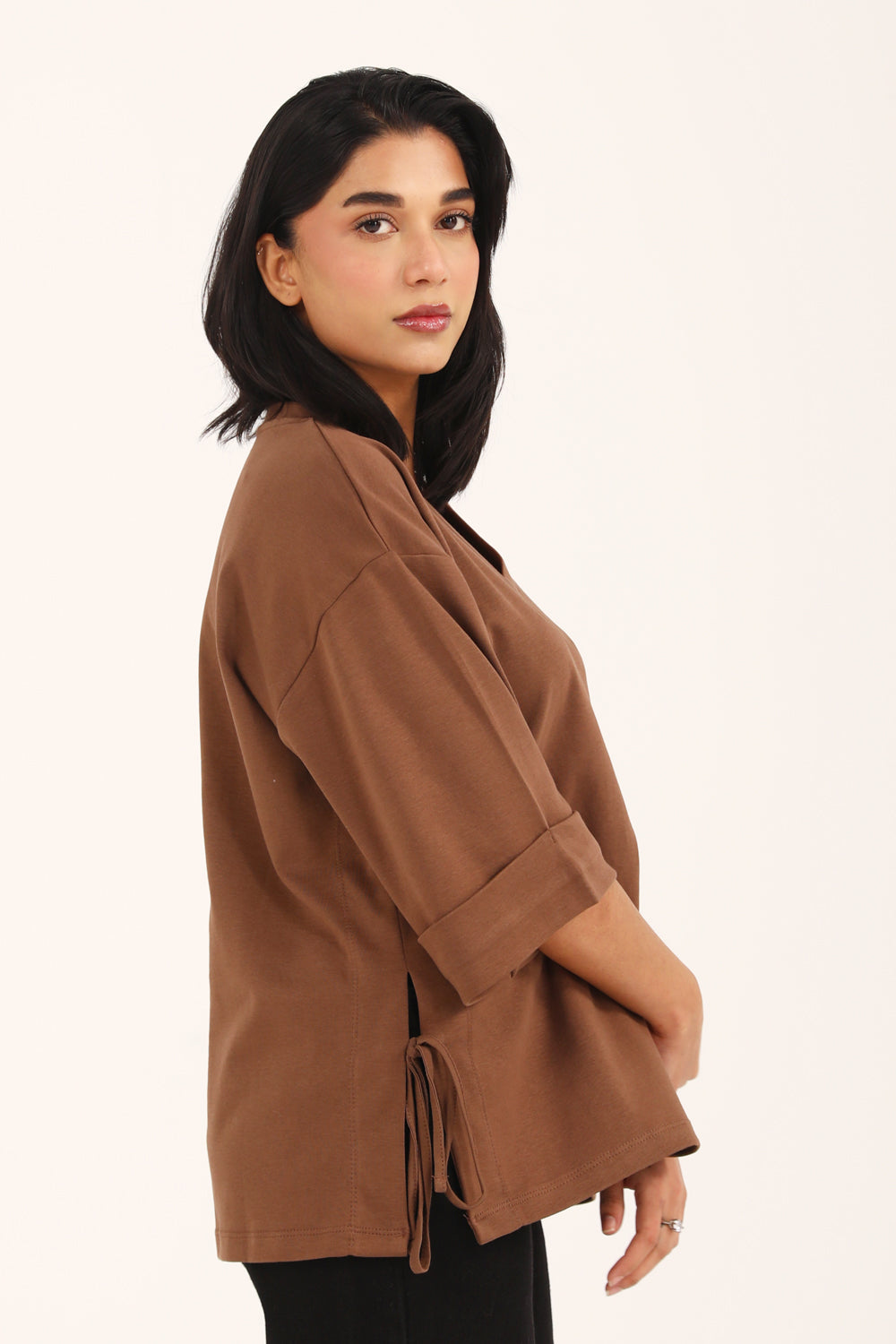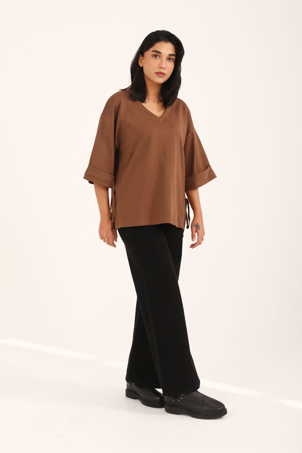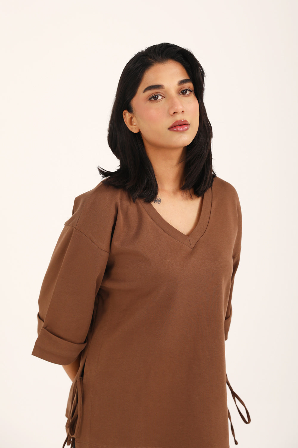 Oversized brown tee with tie details on both sides and three quarter sleeves.