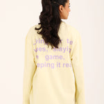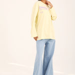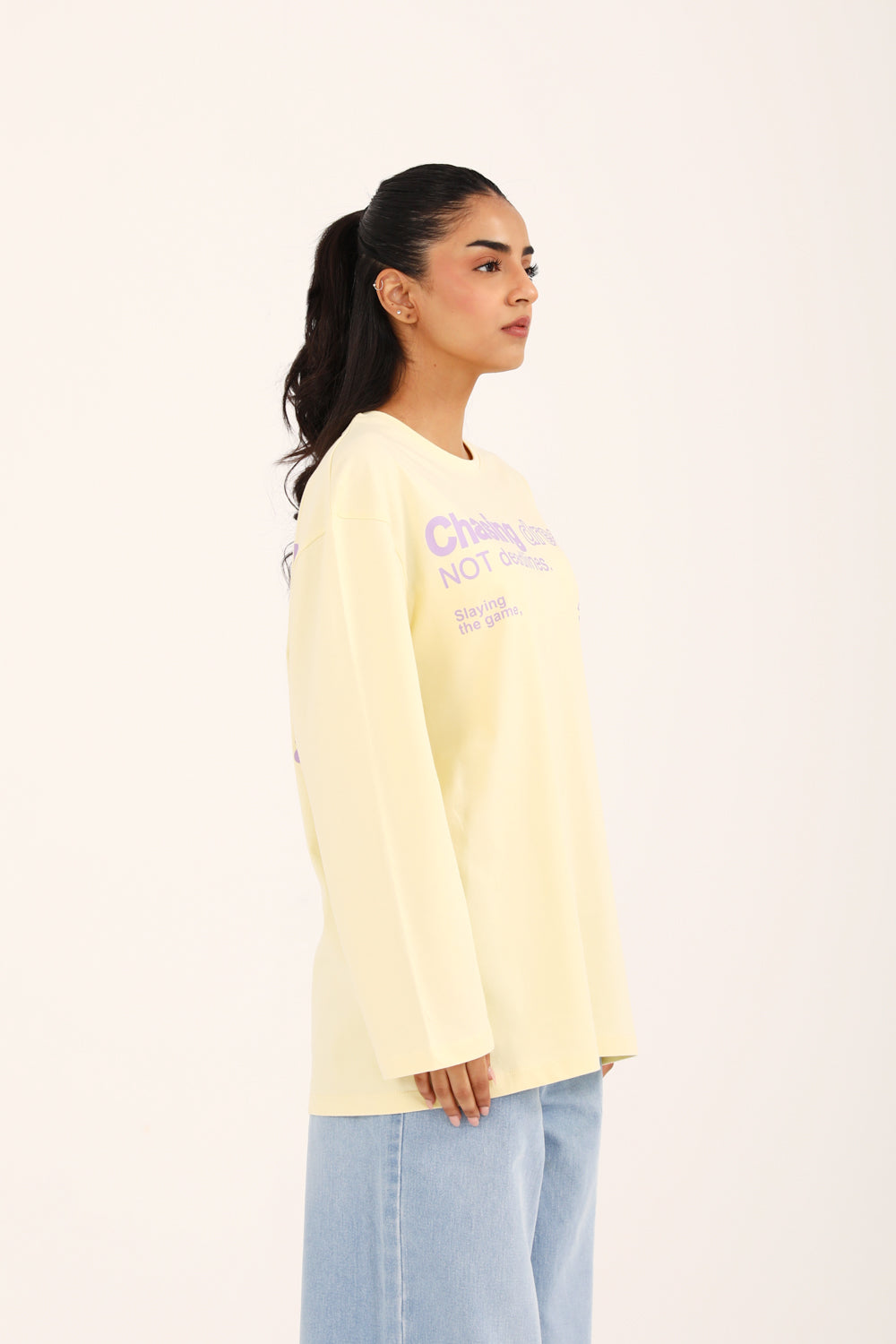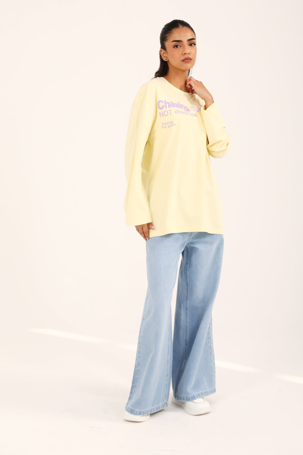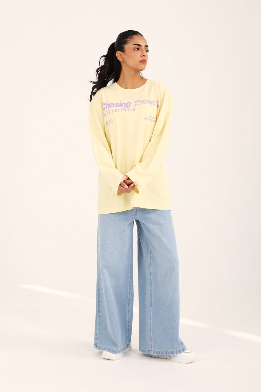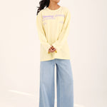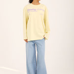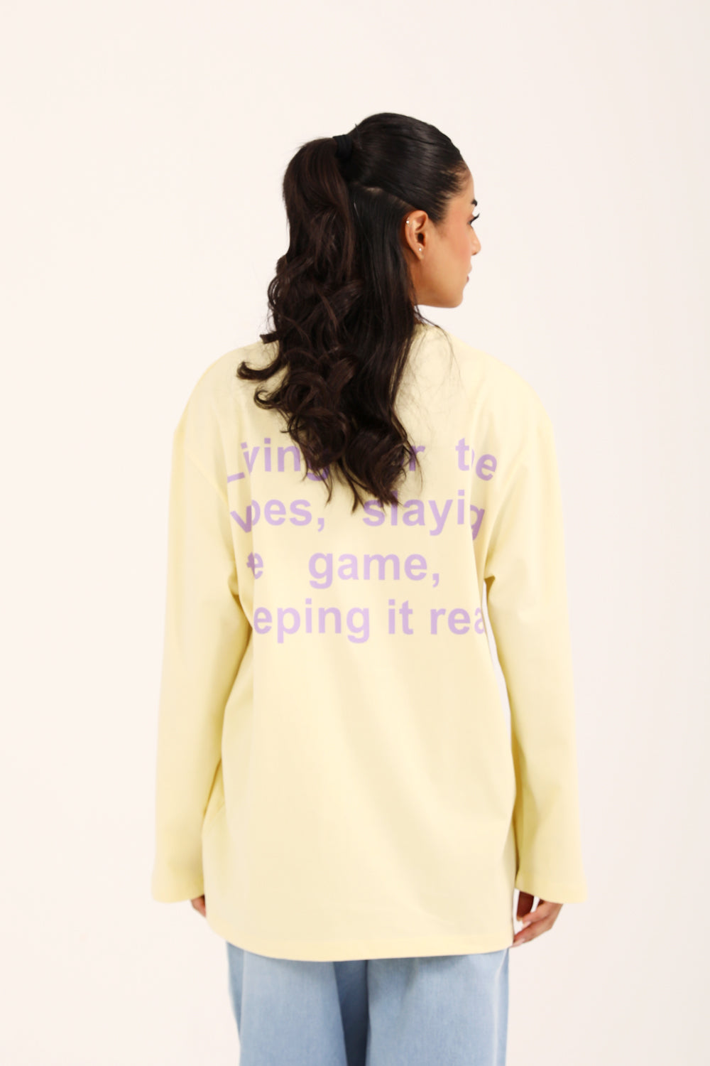 Butter yellow oversized graphic tee with a print on the front and back and full-length oversized sleeves.