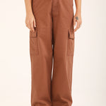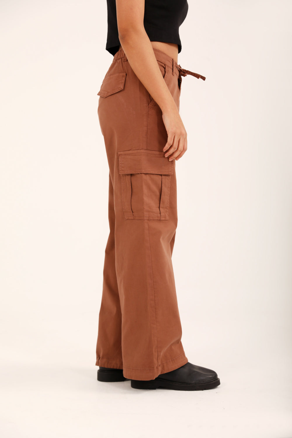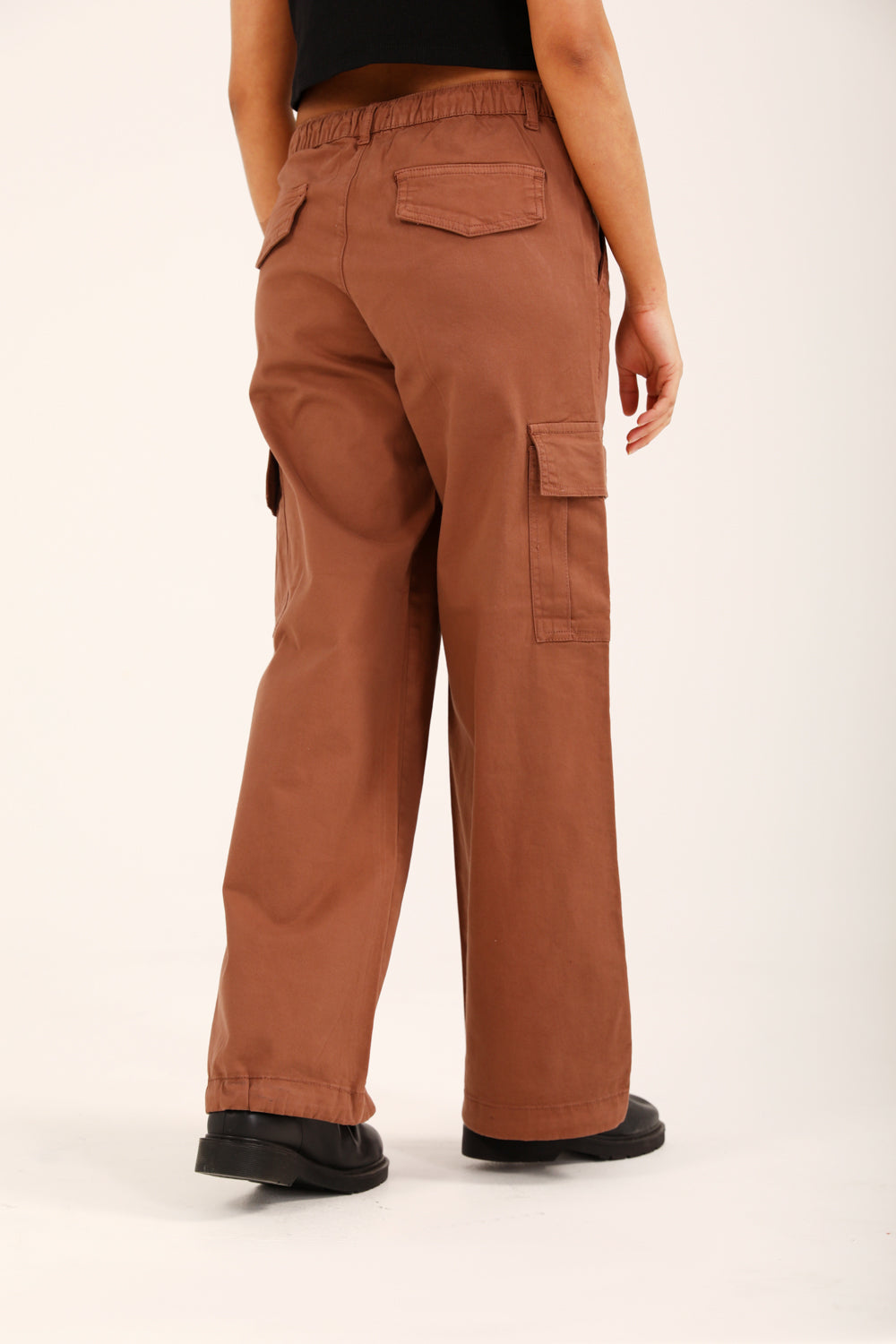 Brown cargo pants featuring functional pockets and drawcord detail for an adjustable fit.