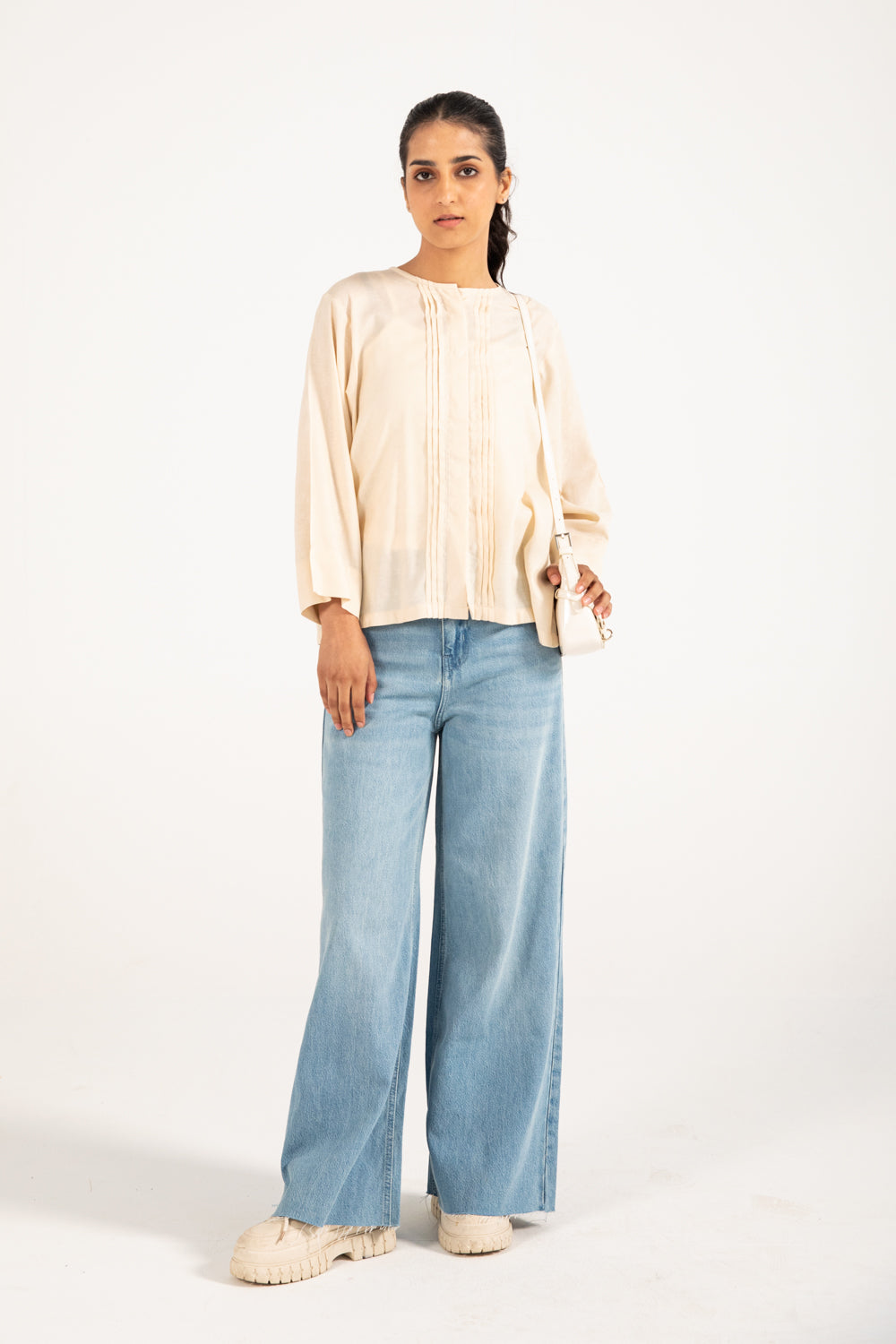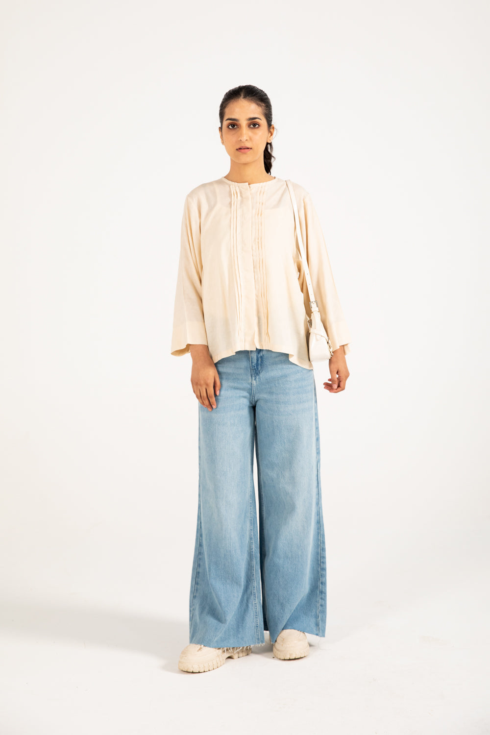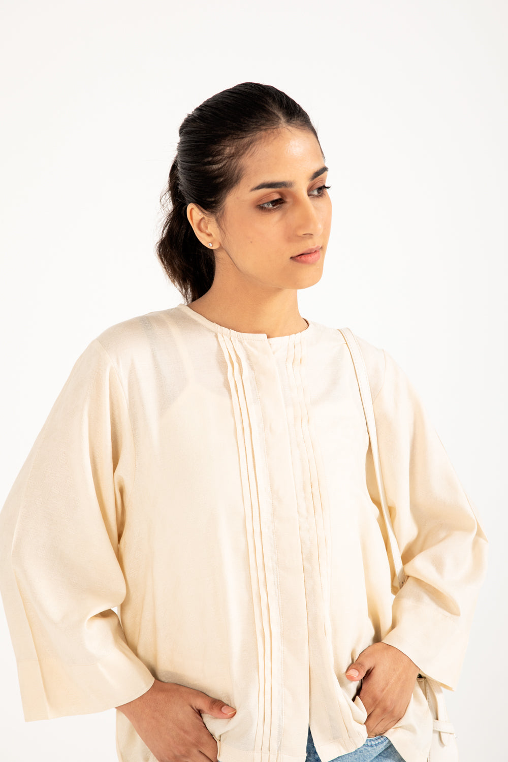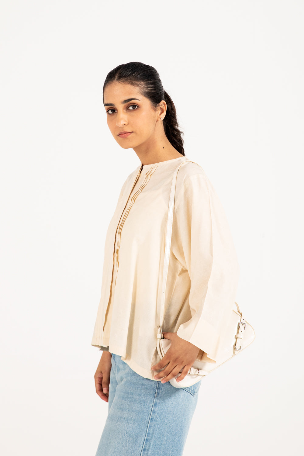 Beige button-down top with full length sleeves and pleated detailing down the front.