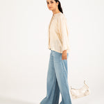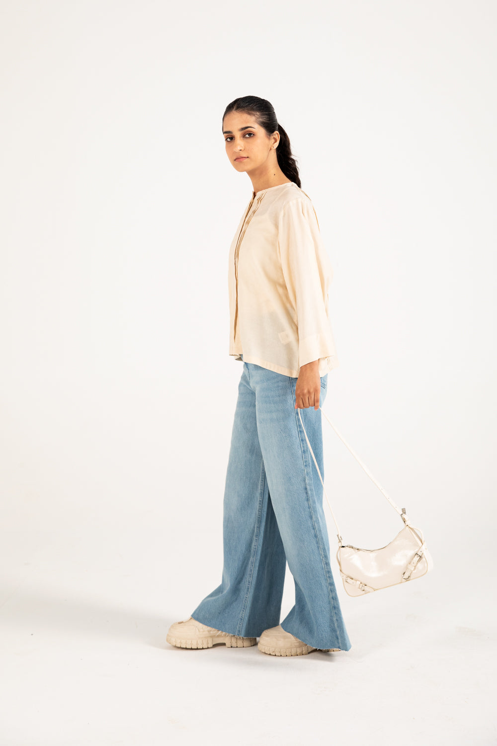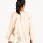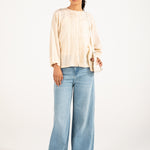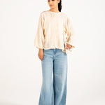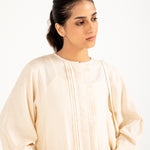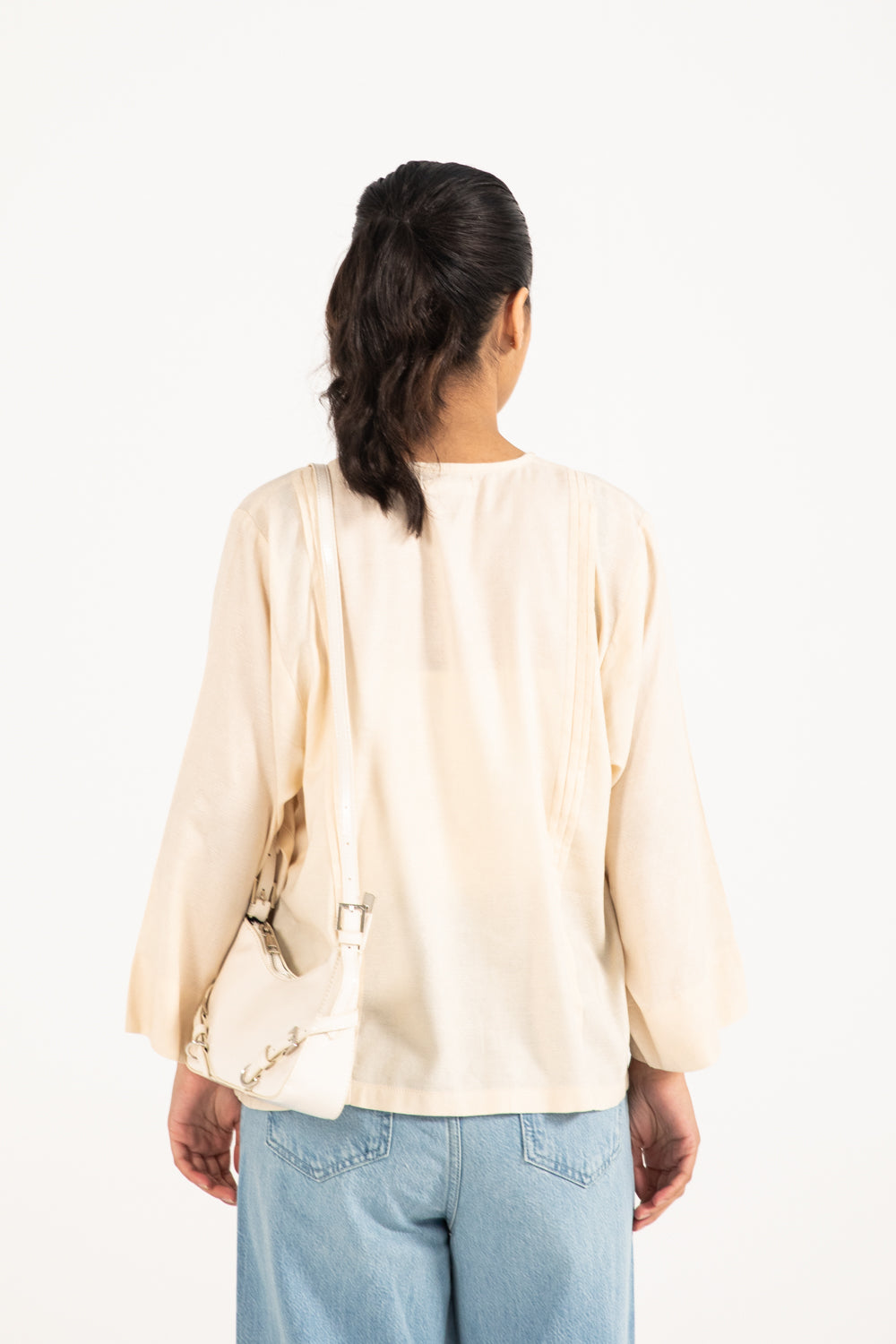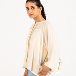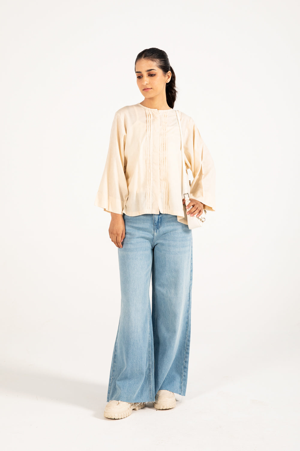 Beige button-down top with full length sleeves and pleated detailing down the front.