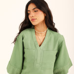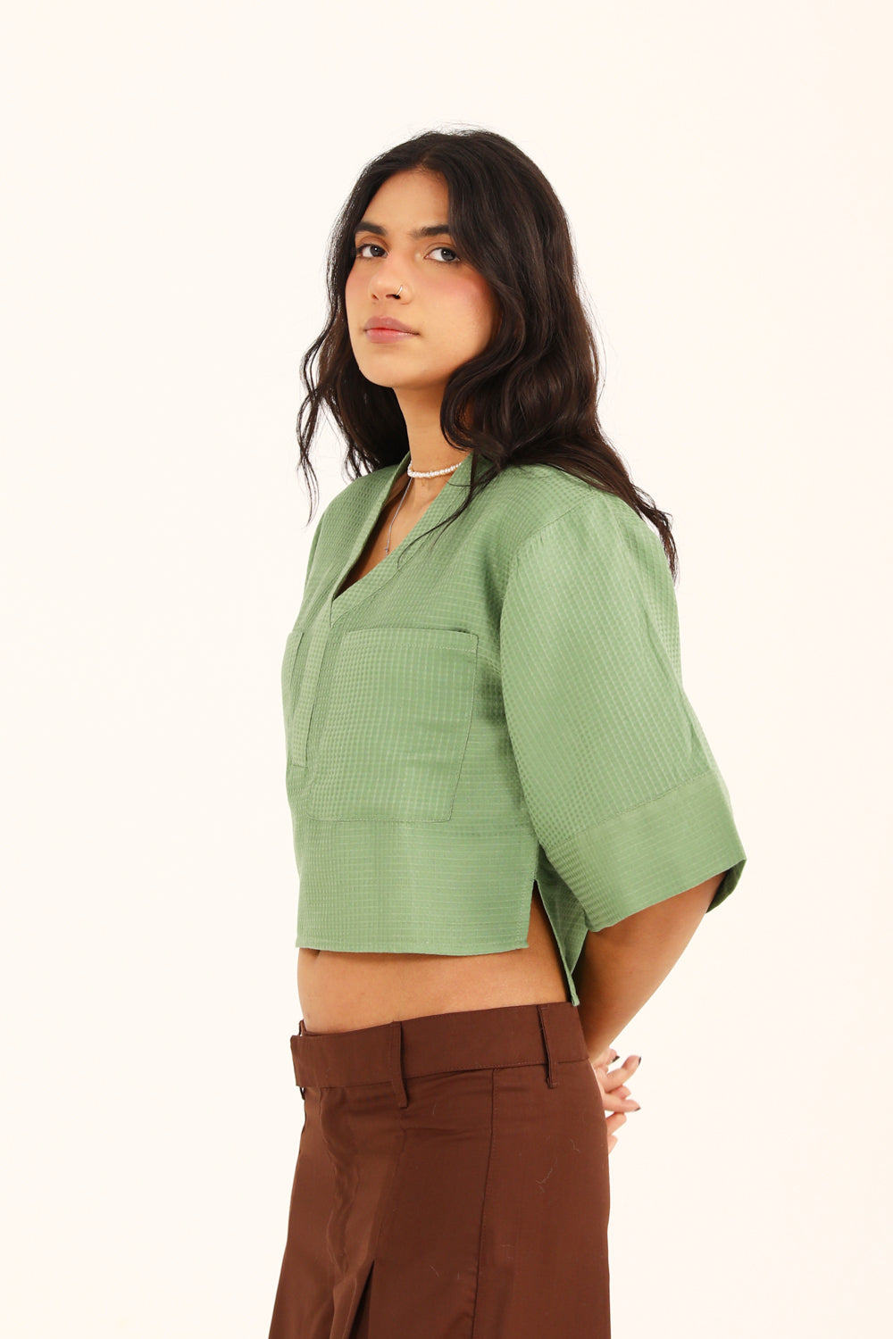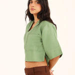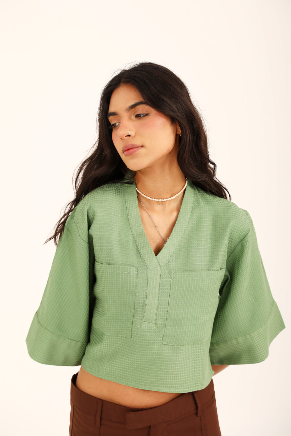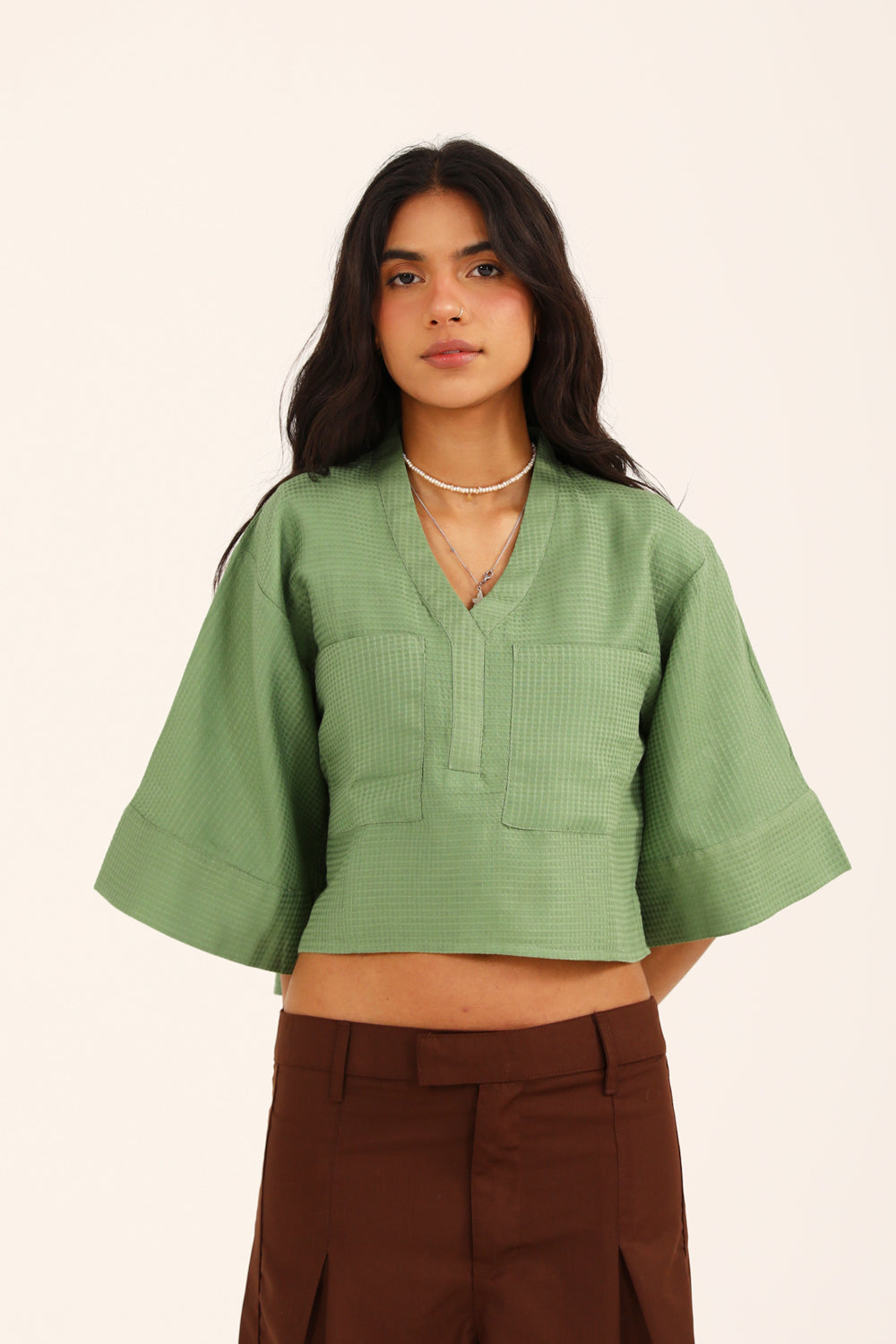 A green cotton cropped top with a V-neck, featuring chest pockets on each side and wide sleeves.