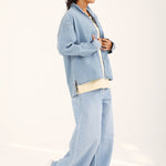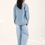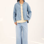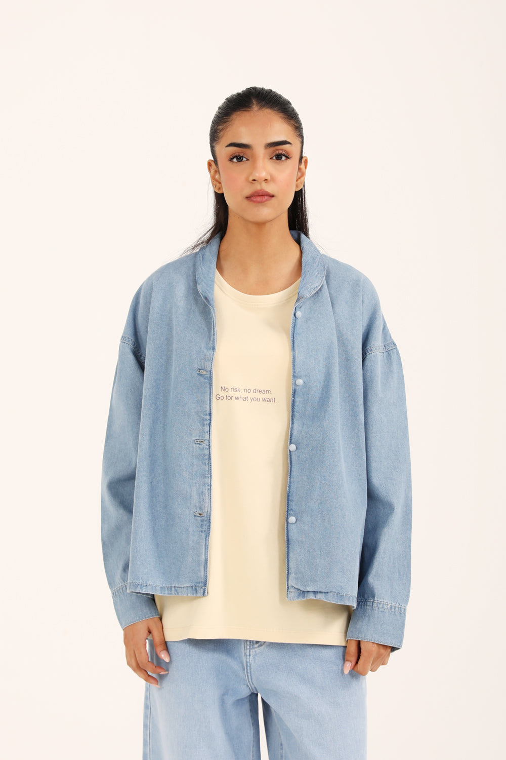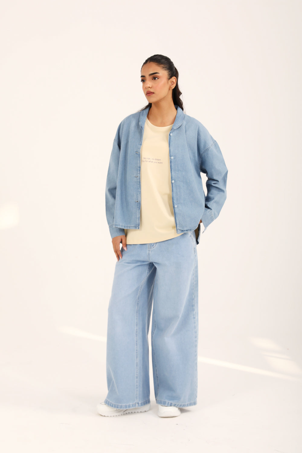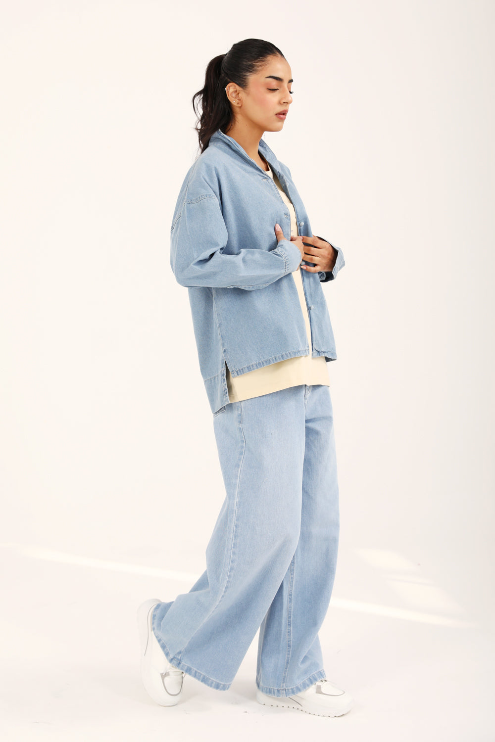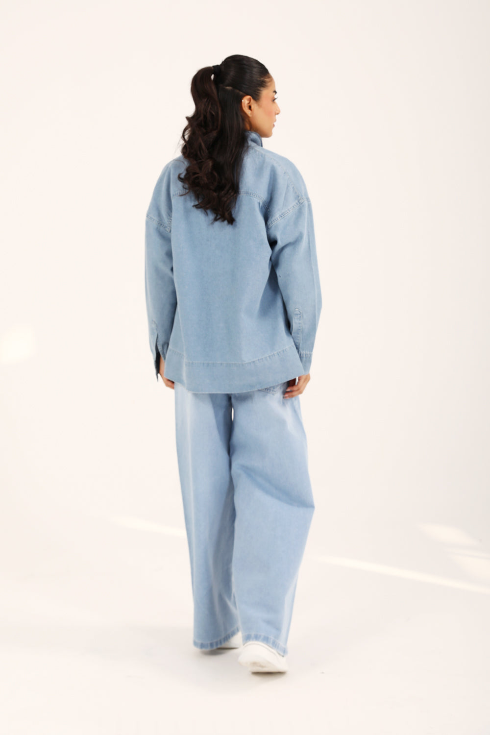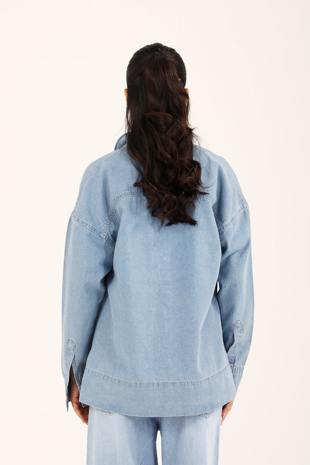 Light blue denim top featuring a collared neckline, drop shoulders, full length sleeves, and matching buttons.