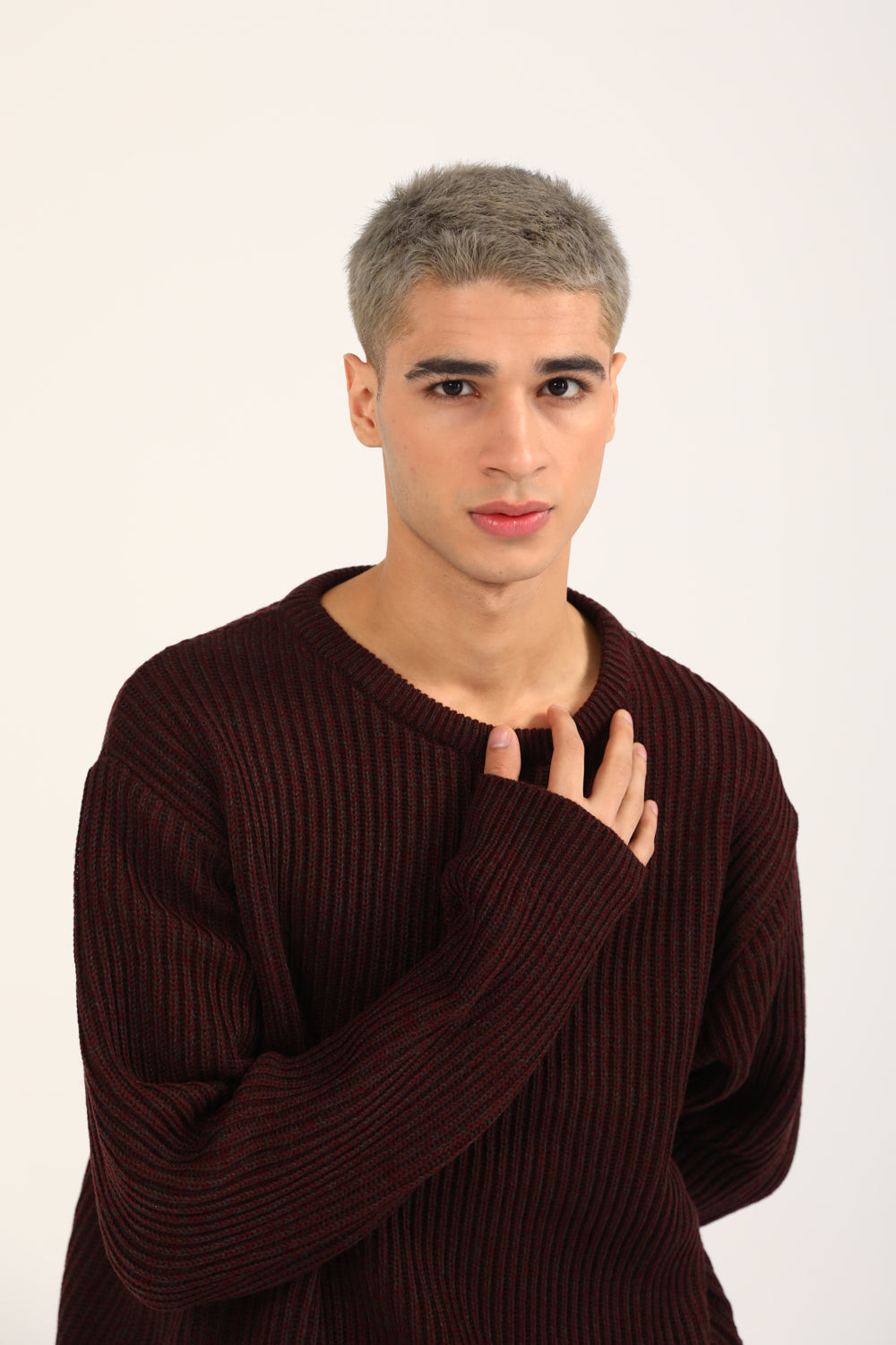 Boxy fit burgundy half cardigan knit sweater with full length oversized sleeves.