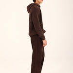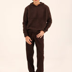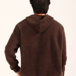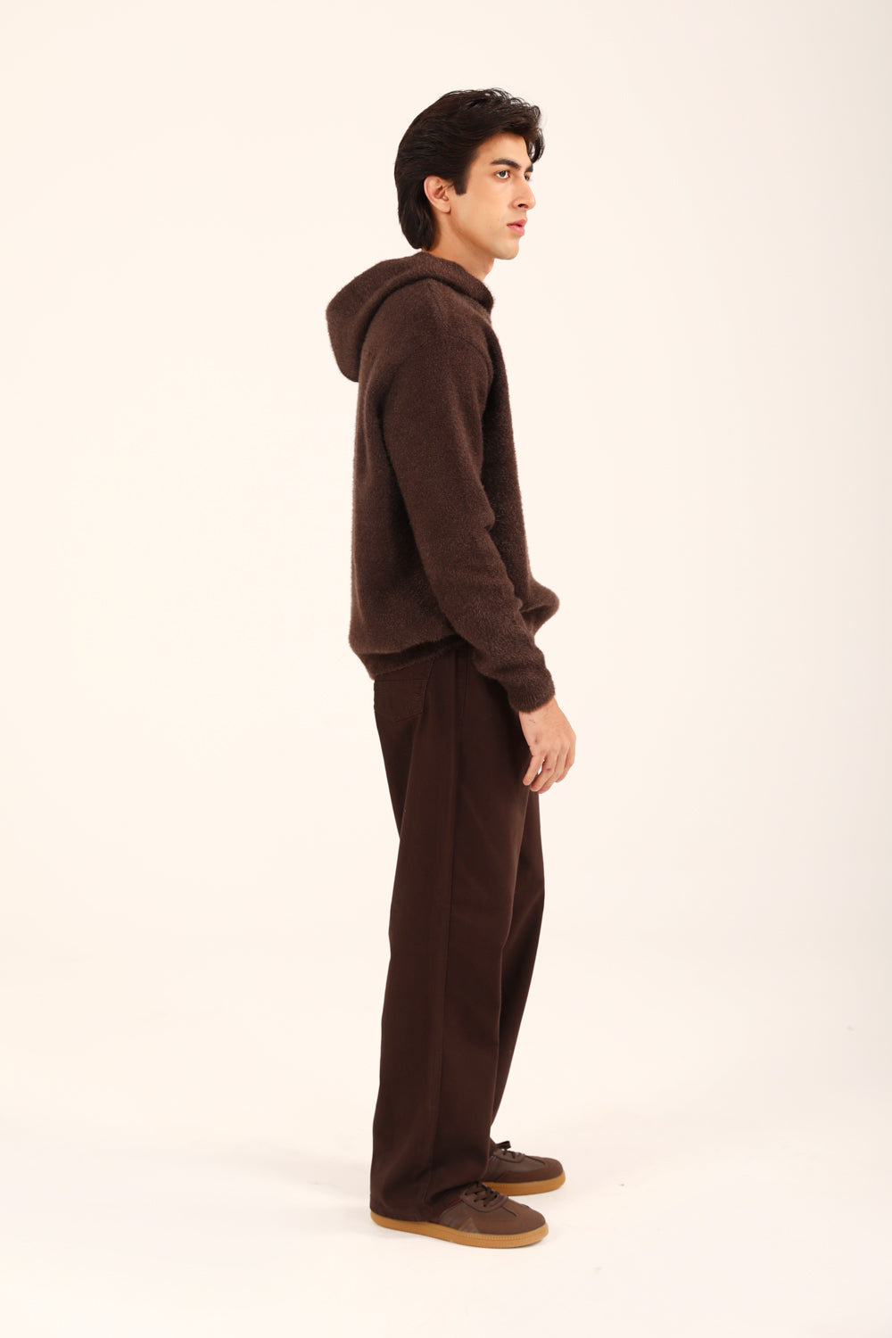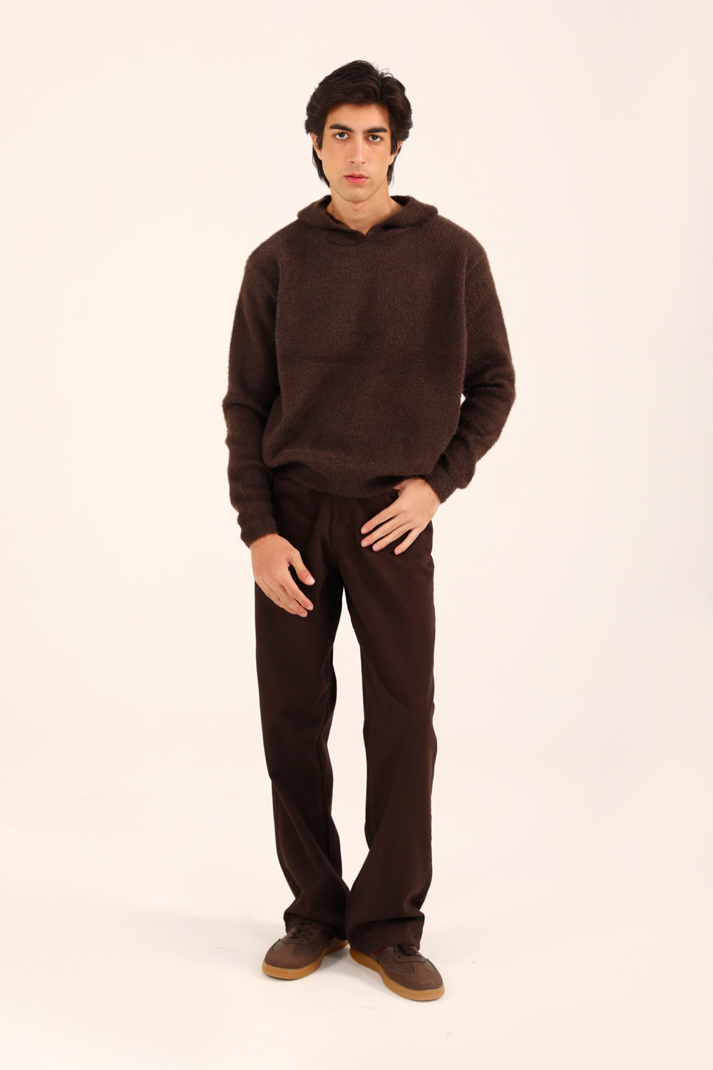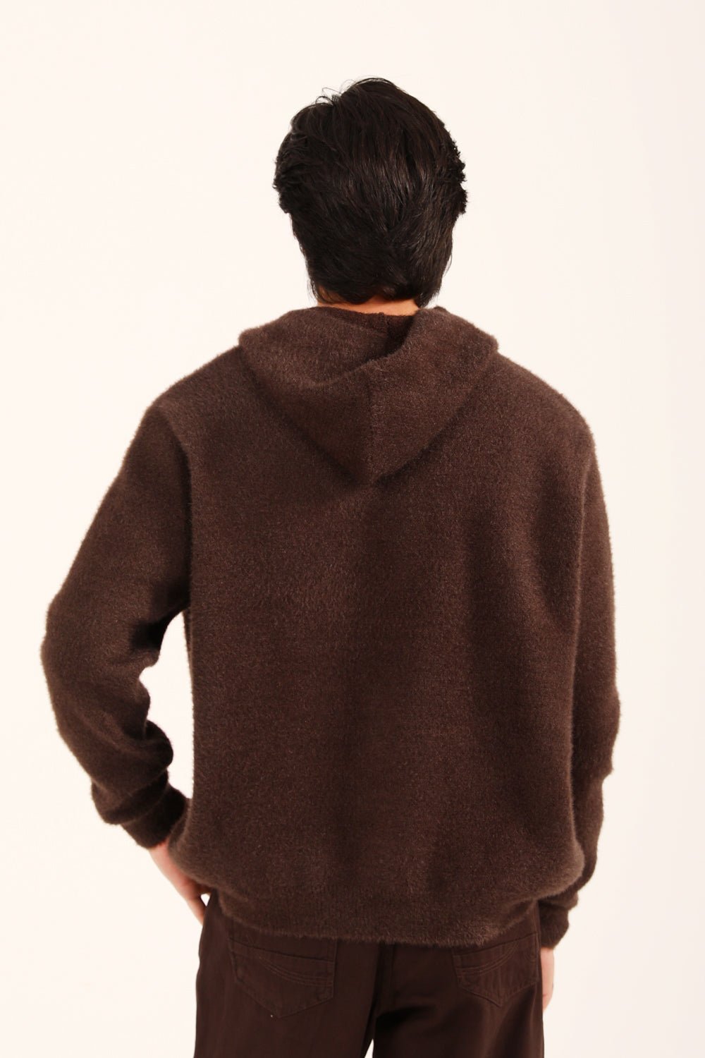 A brown sweater in a boxy fit, crafted from brushed wool blend and finished with a cozy hood.
