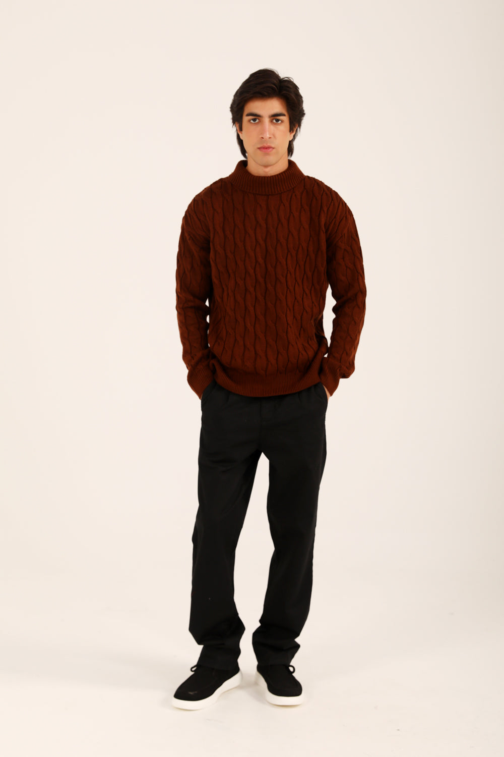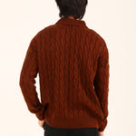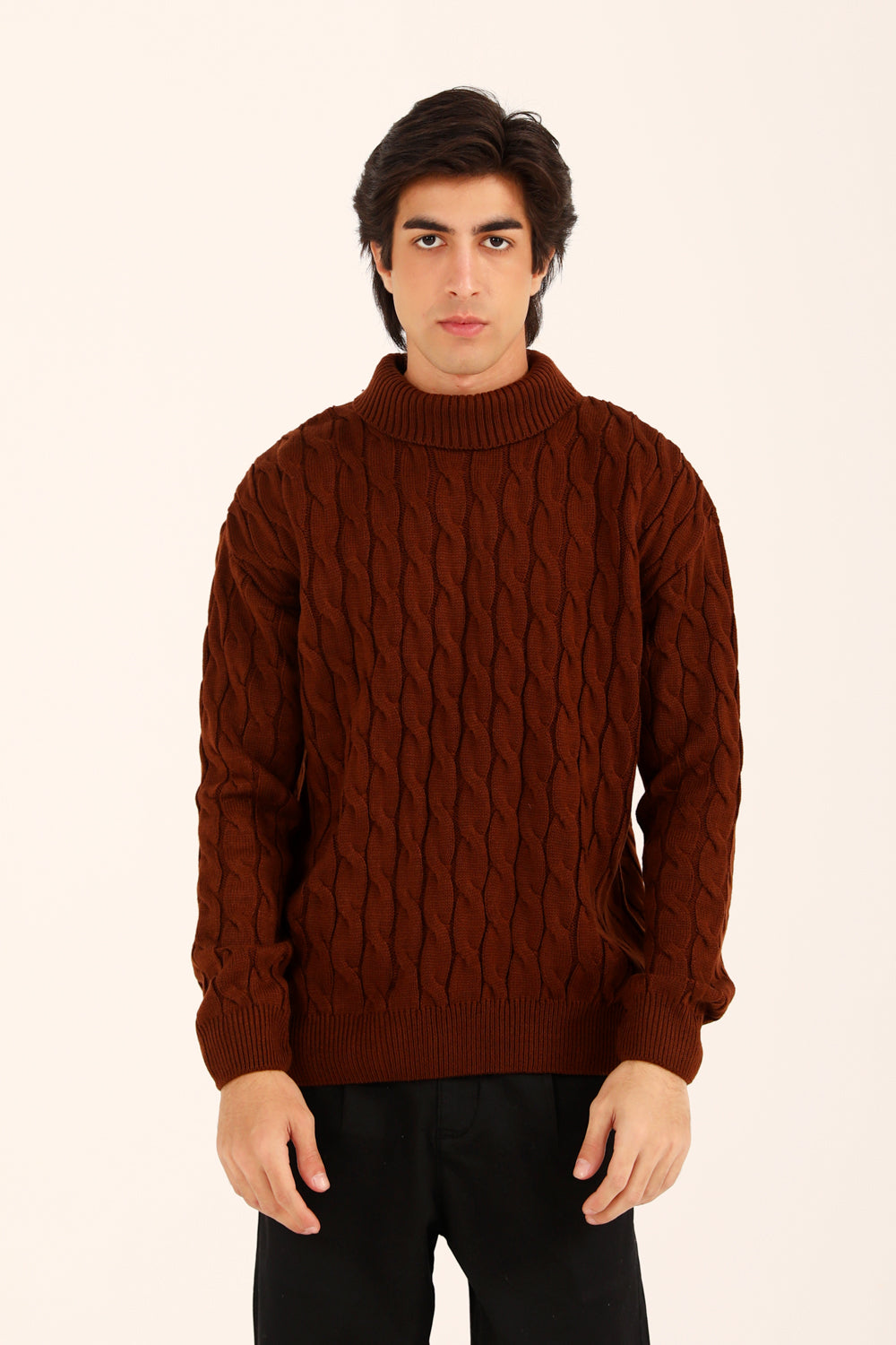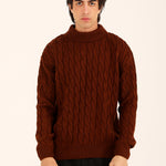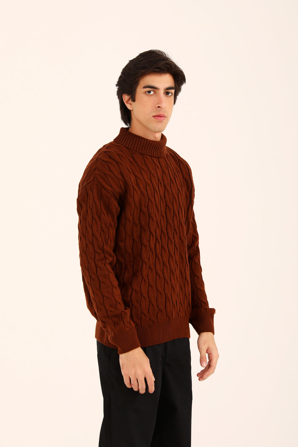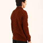 This relaxed fit sweater in rust brings a high neck silhouette together with a classic cable knit, giving it texture and effortless warmth.