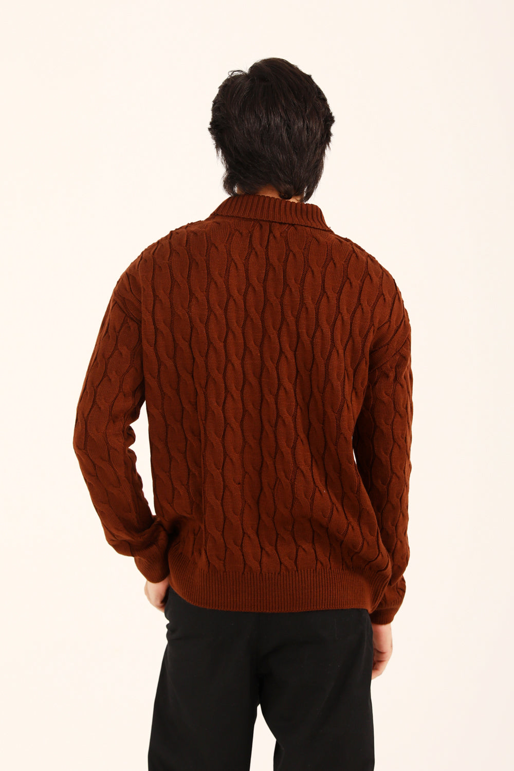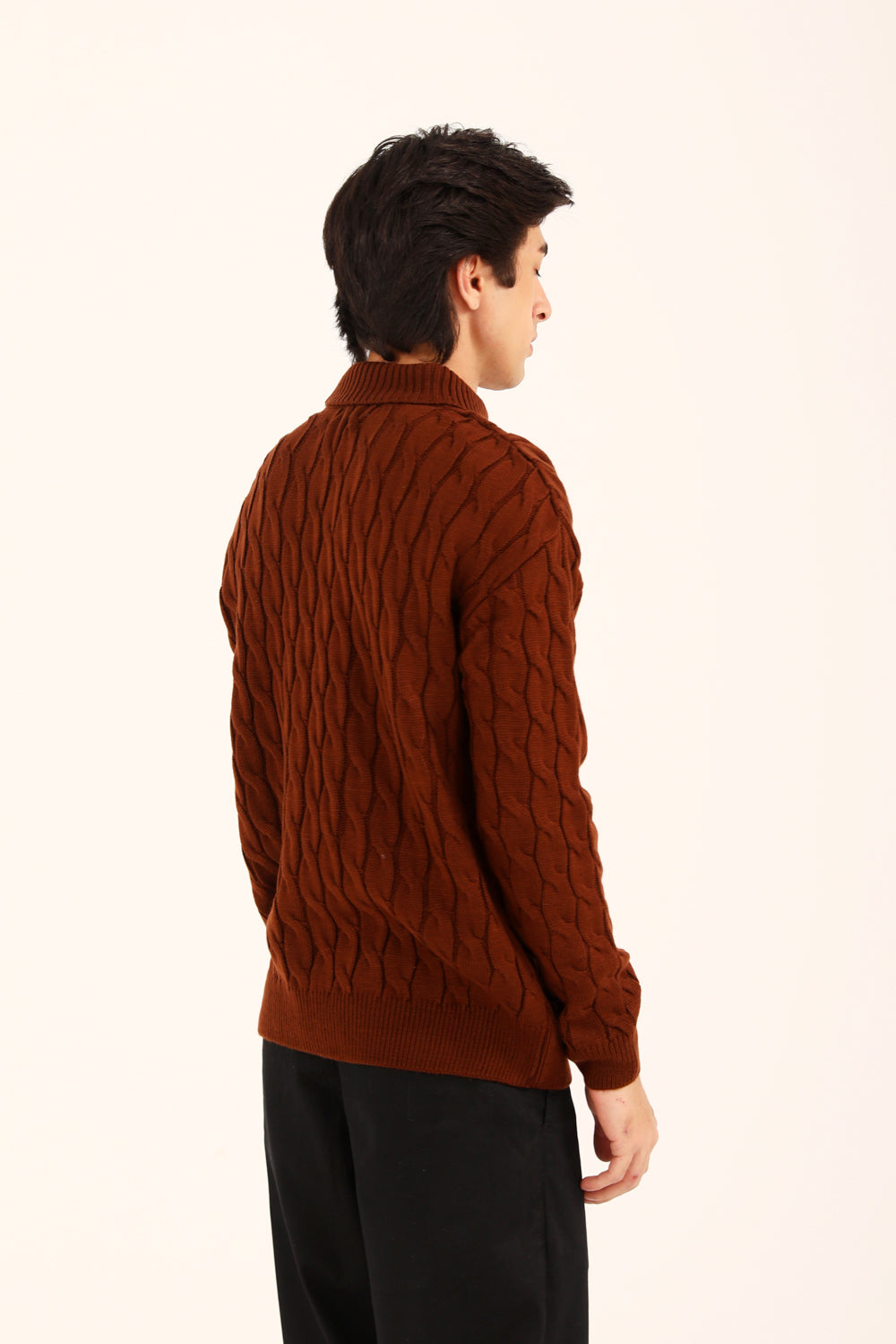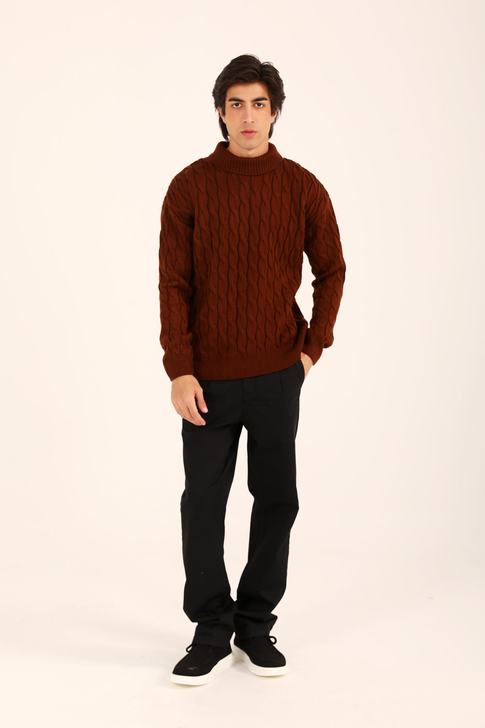 This relaxed fit sweater in rust brings a high neck silhouette together with a classic cable knit, giving it texture and effortless warmth.