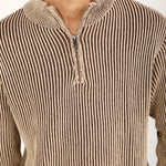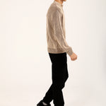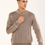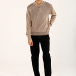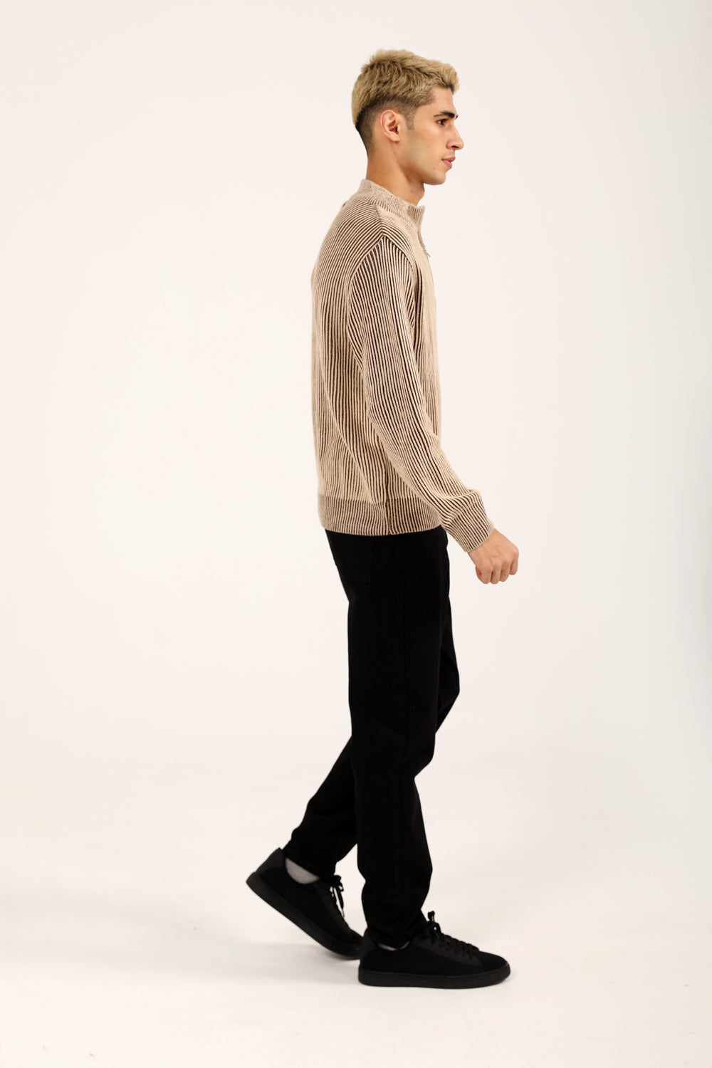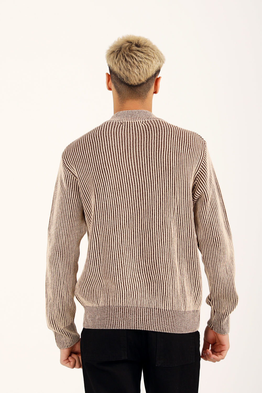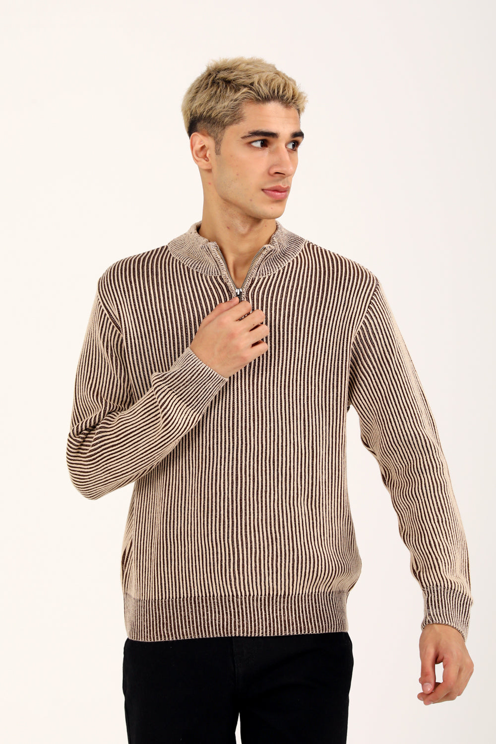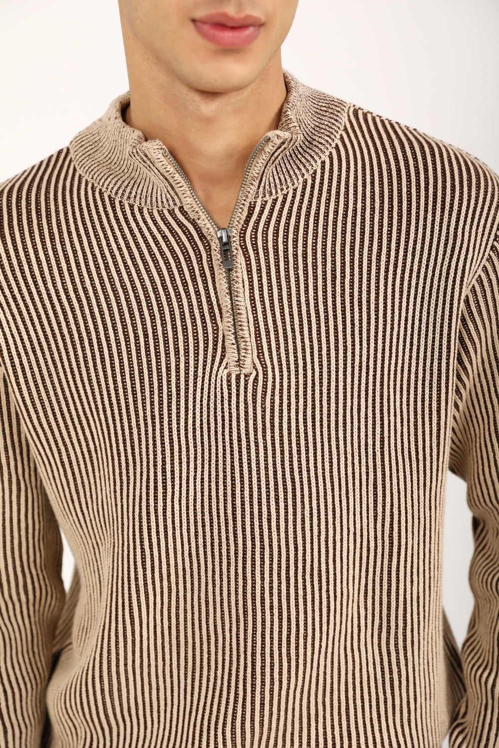 Relaxed fit mock neck sweater in off-white and brown with a zipper detail on the neckline.