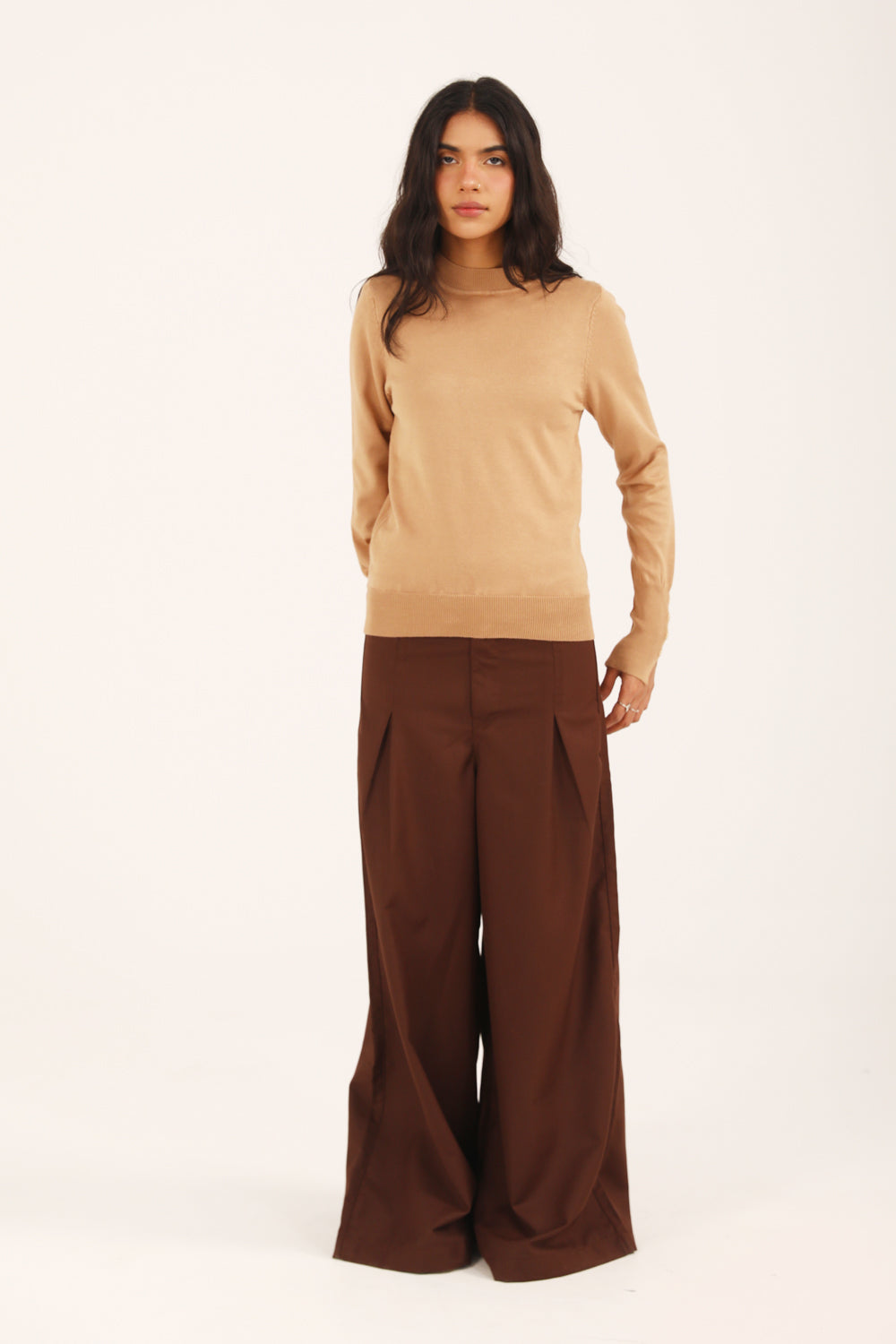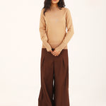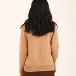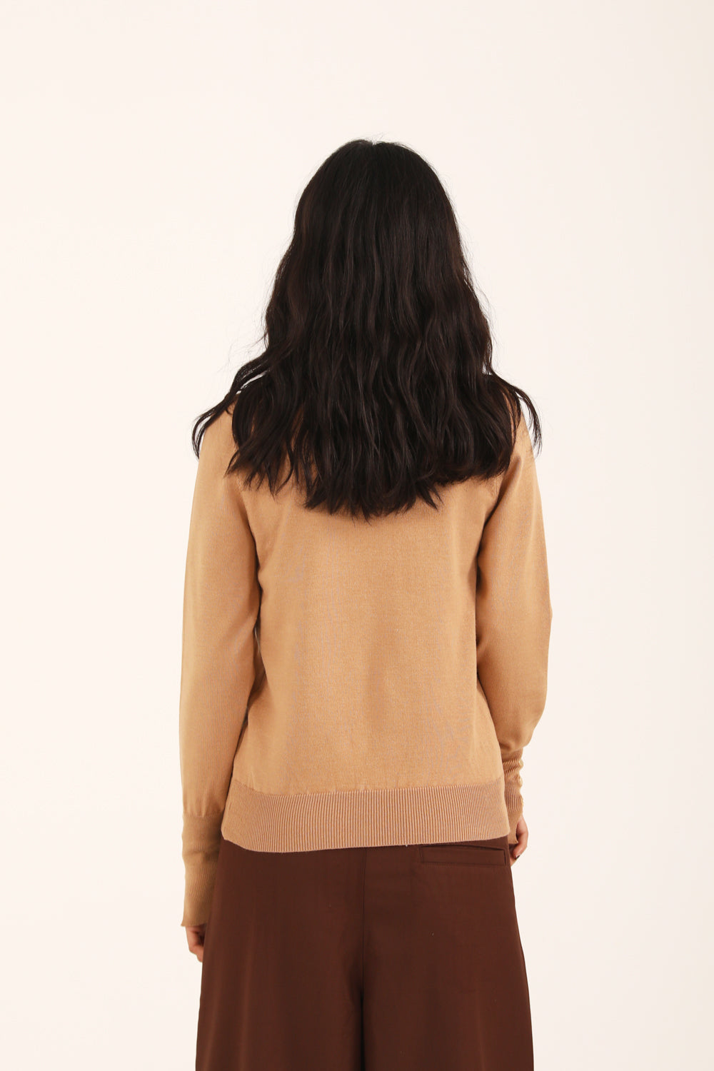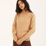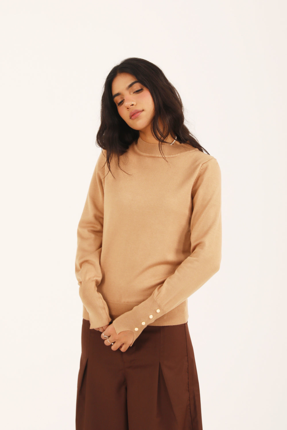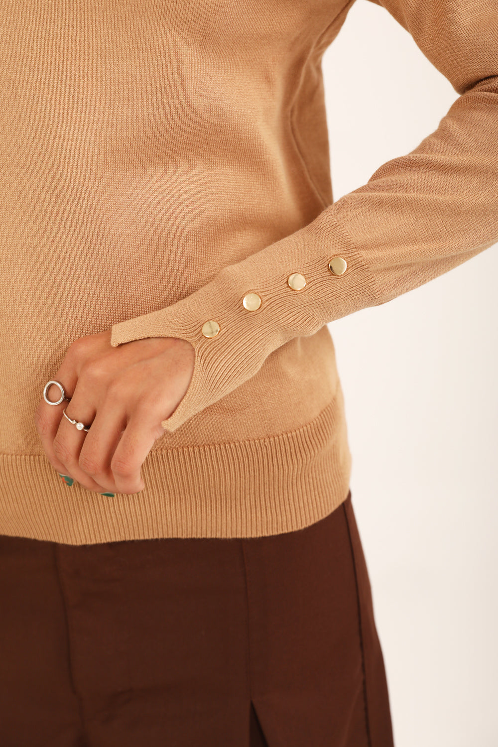 A camel colored knit top accented with metallic buttons on the cuffs.