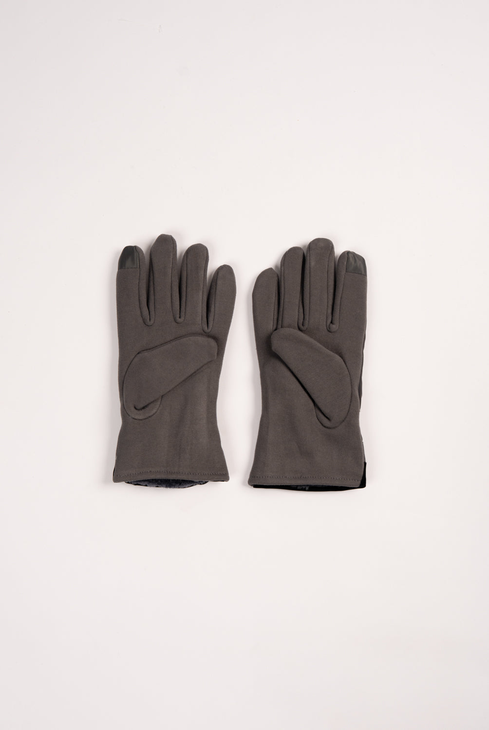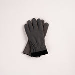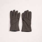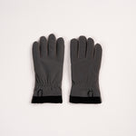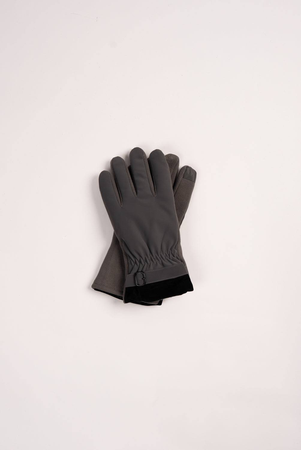 Grey gloves featuring black trim and a buckle detail.