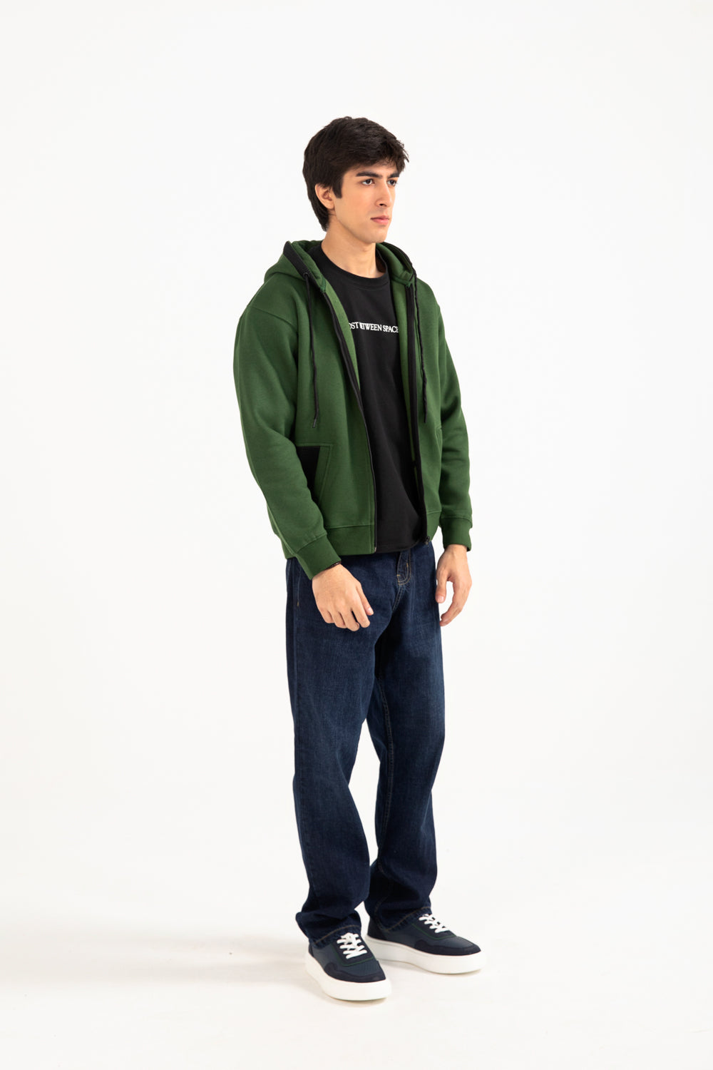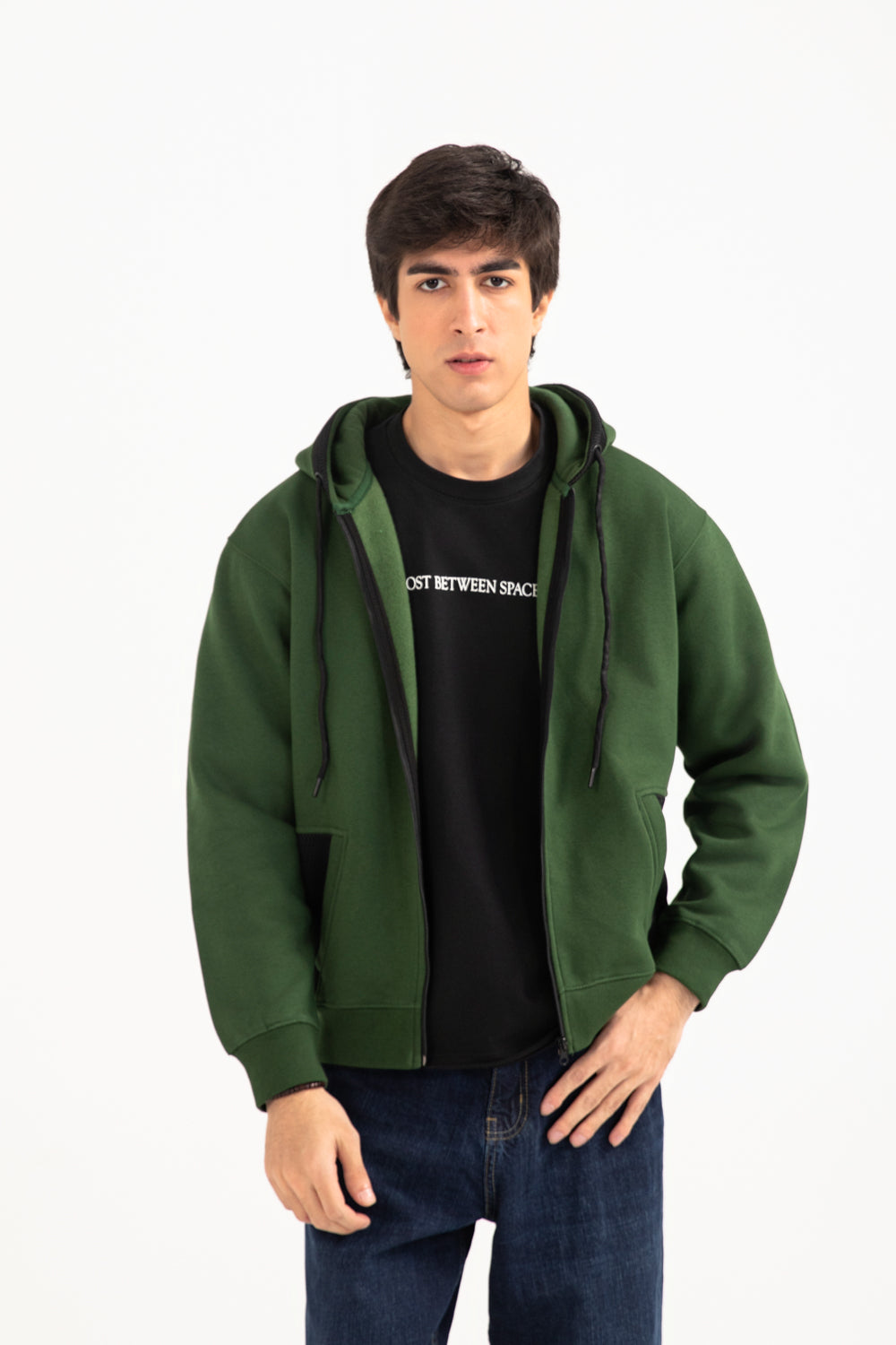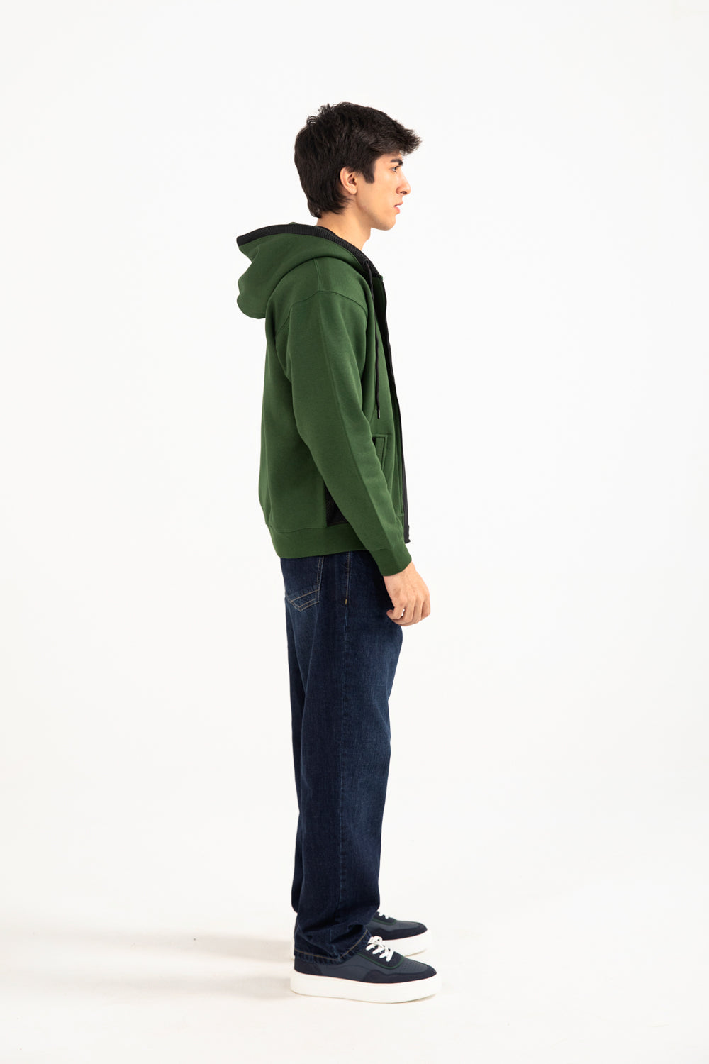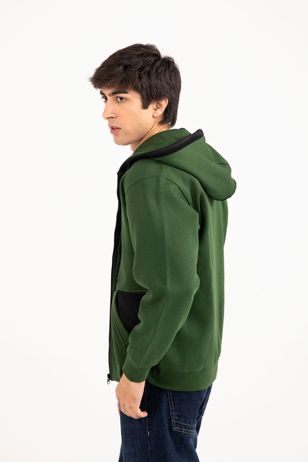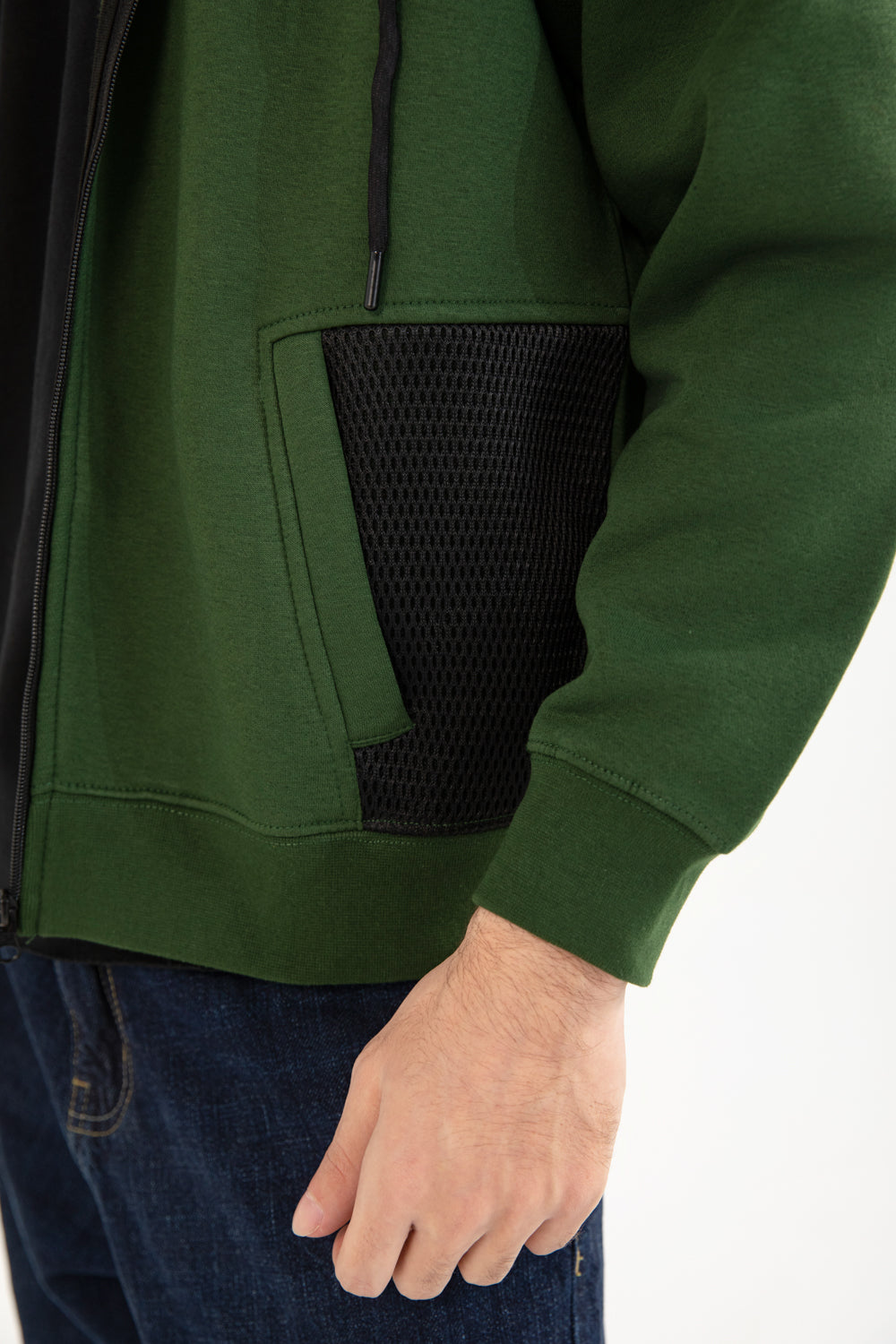 Zipper hoodie in green crafted from a cotton blend, finished with black drawstrings for contrast.
