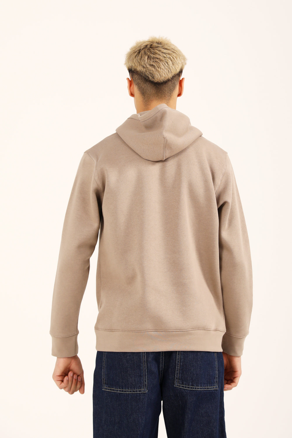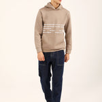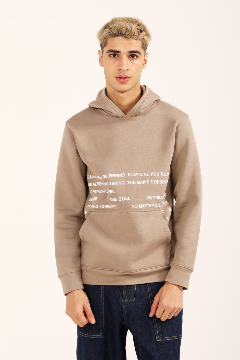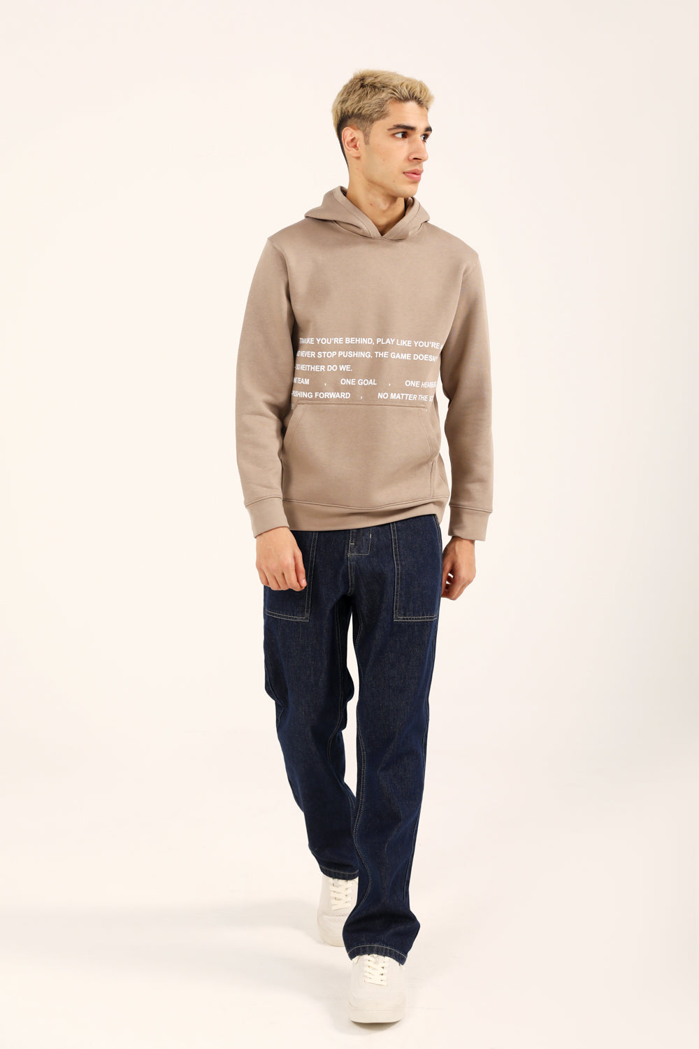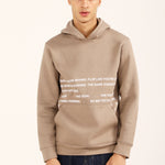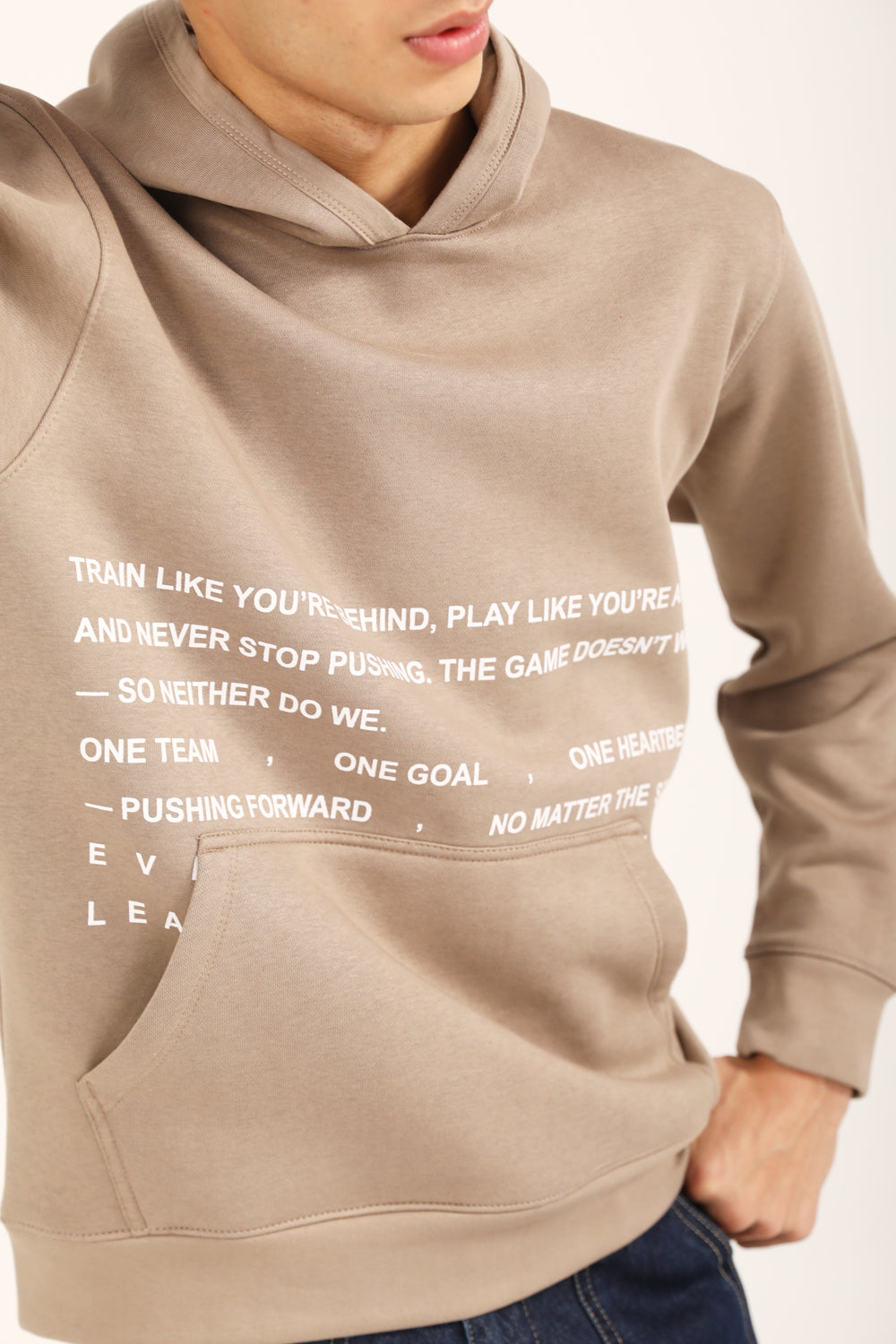 Stone-colored graphic hoodie with a relaxed fit and bold front print.
