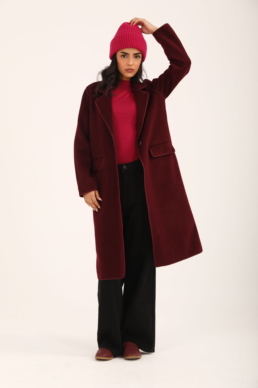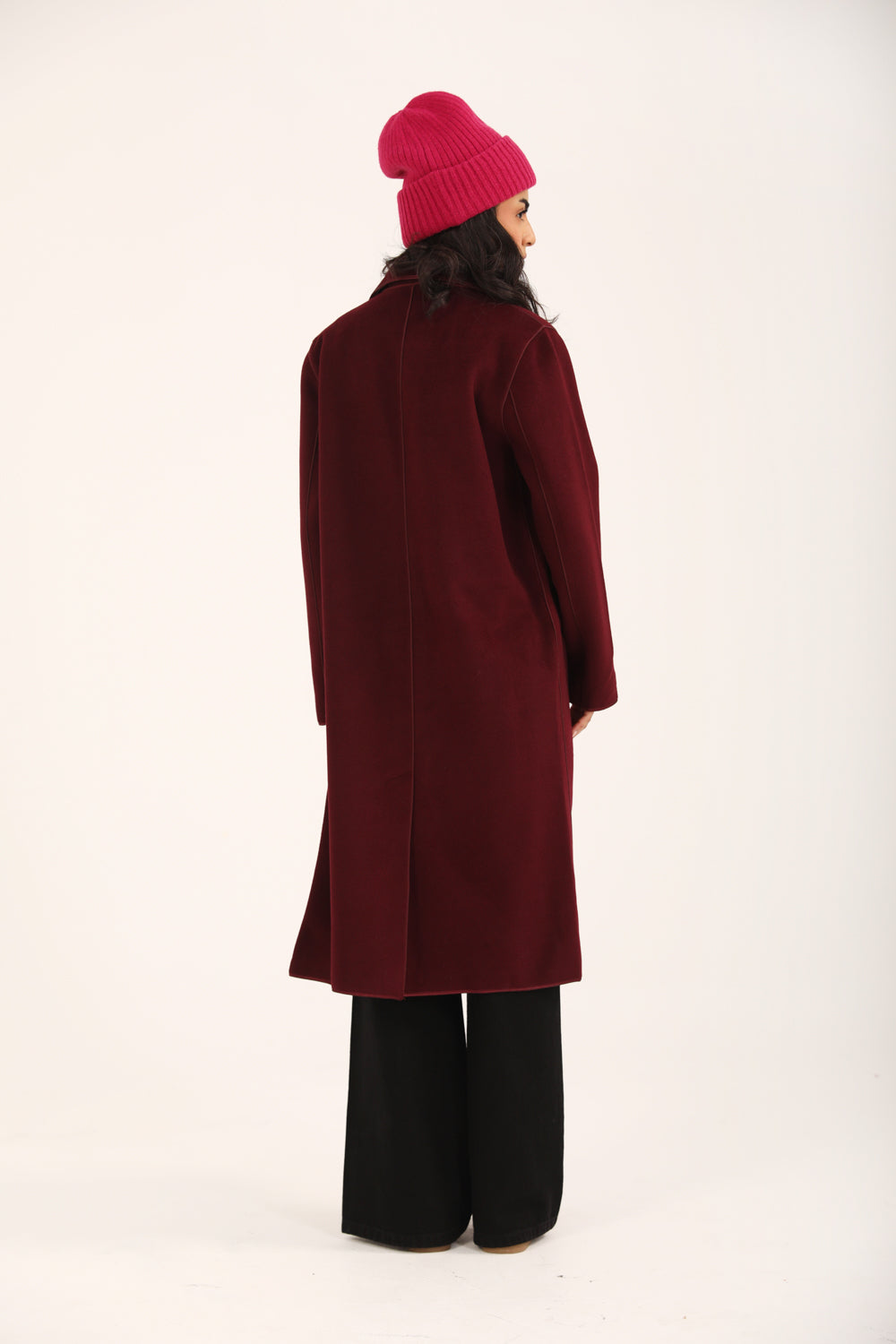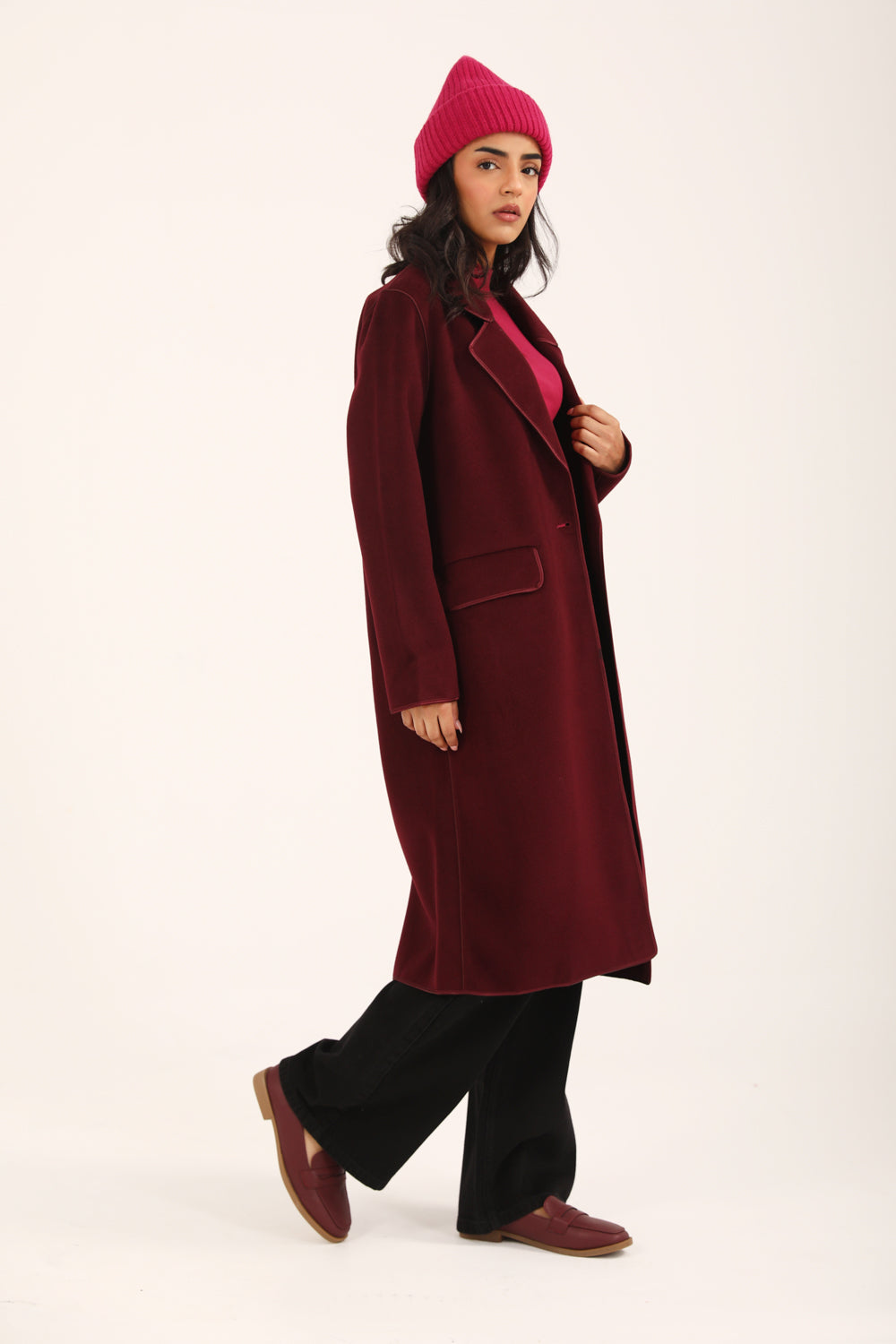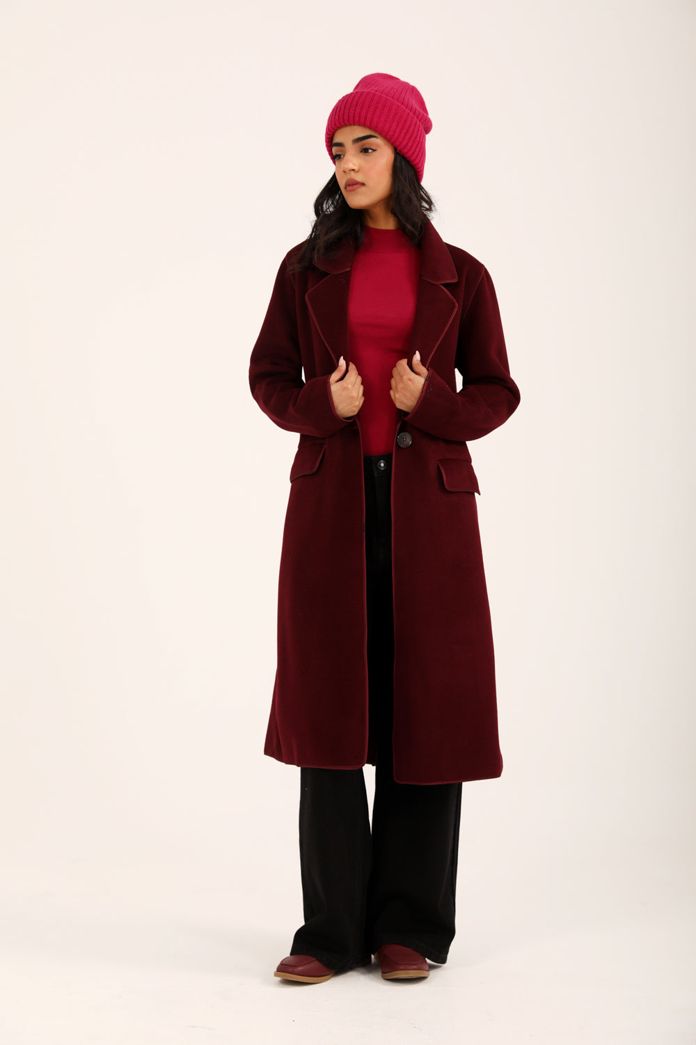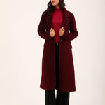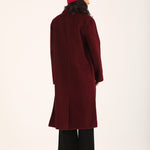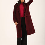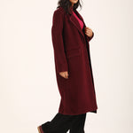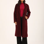 Burgundy faux suede coat with satin tipping and a single button closure.