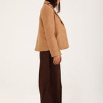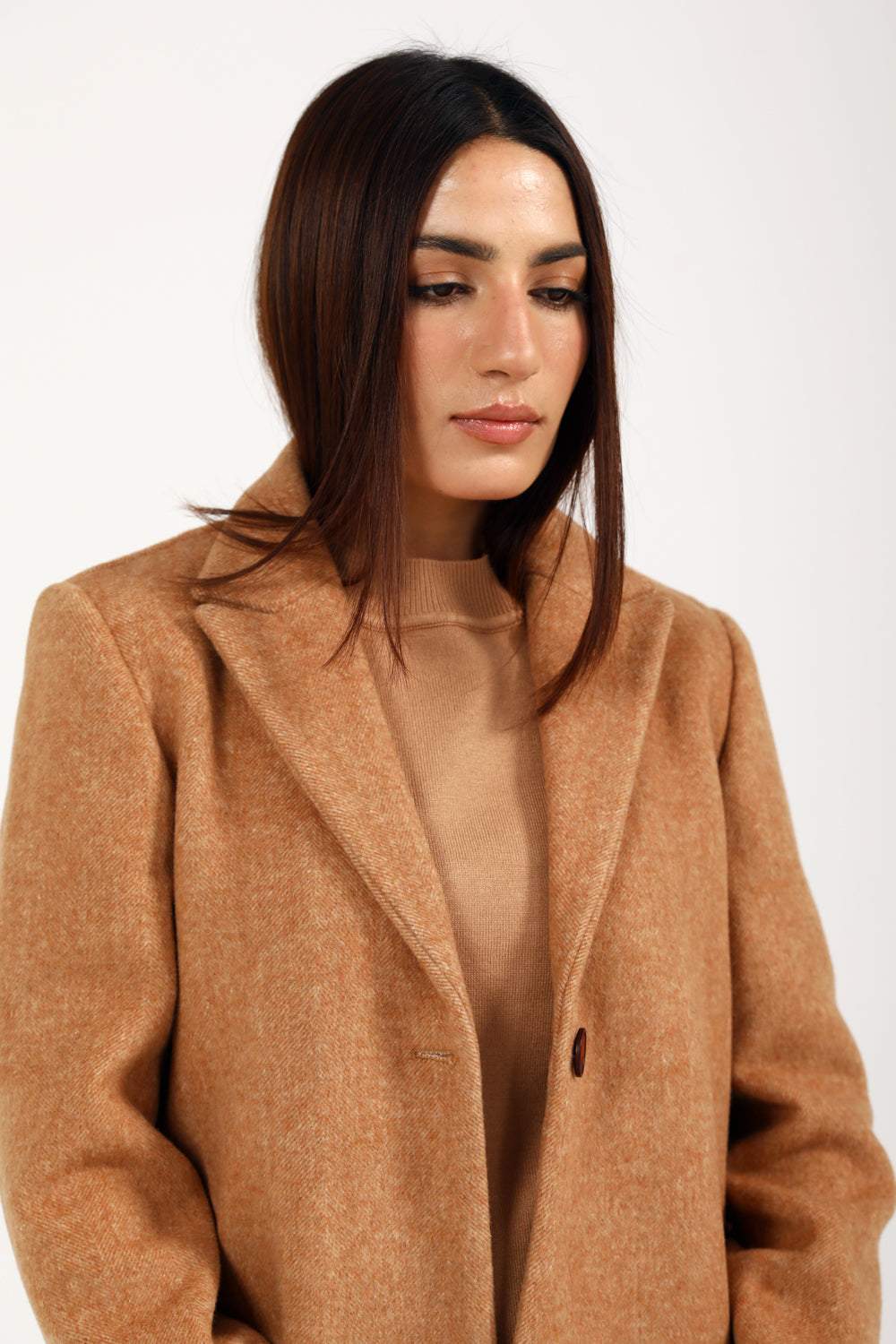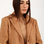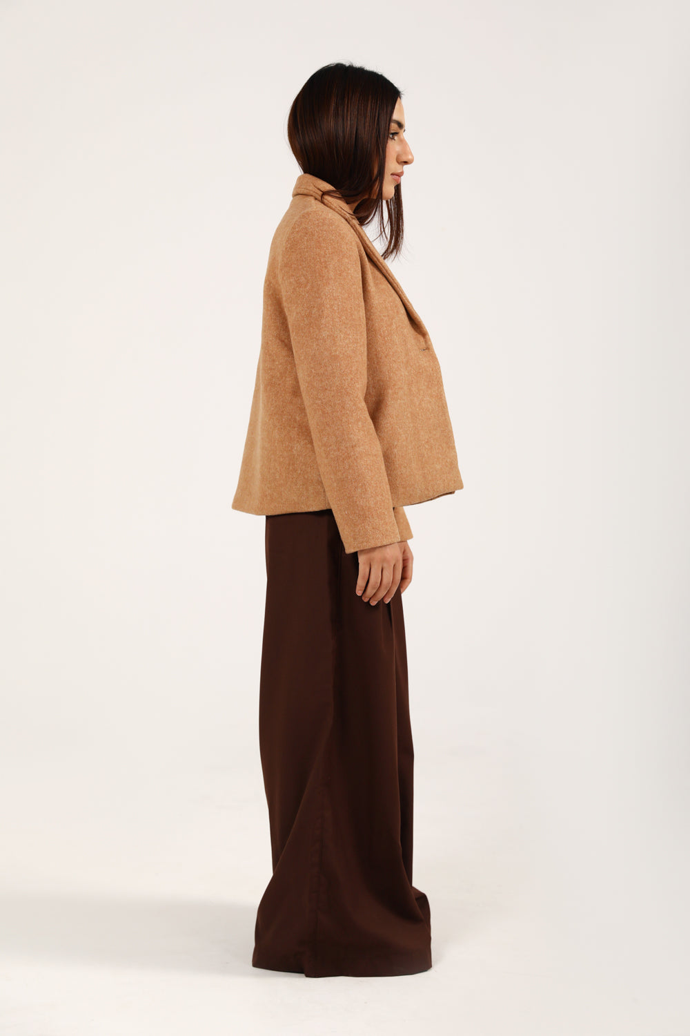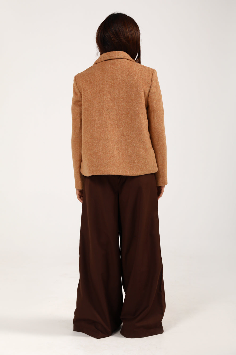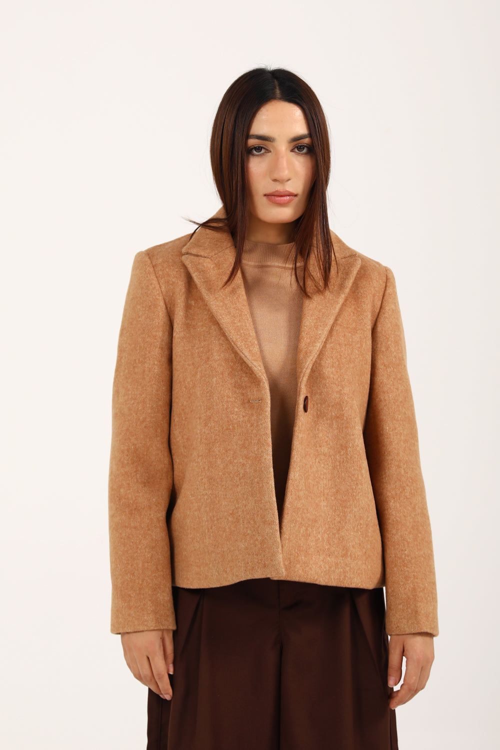 Brown short coat in a wool blend with a single button closure for a tailored look.