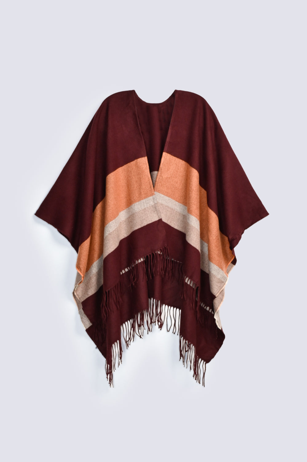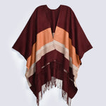 Fringed cape shawl featuring contrasting maroon and peach colored panels for an elegant layered look.