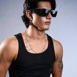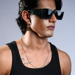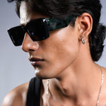 Clash square sunglasses with black frames and lenses, complemented by bold green tortoiseshell temples for a striking contrast.
