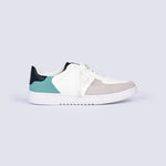 Trainers in white with a color blocked design in green, grey and white, finished with a white sole and matching laces.