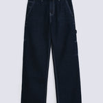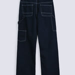 Dark blue cargo denim with contrast white stitching, featuring classic straight legs and subtle design accents at the back.