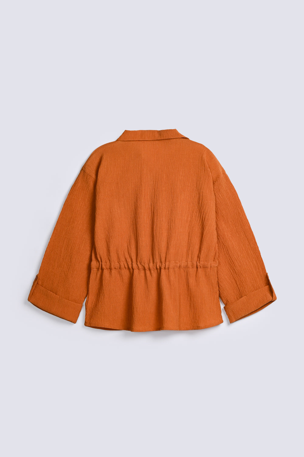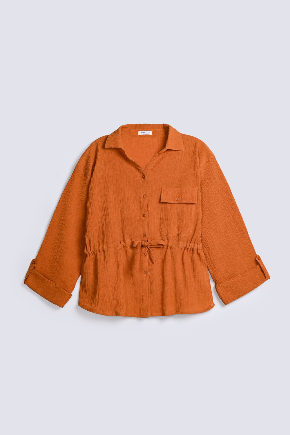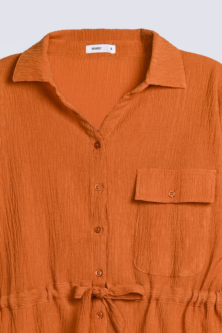 Rust cotton shirt with a textured finish, featuring a drawstring waist, a flap chest pocket with a matching button, and sleeves designed with roll up detail.