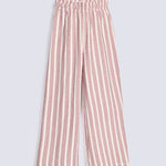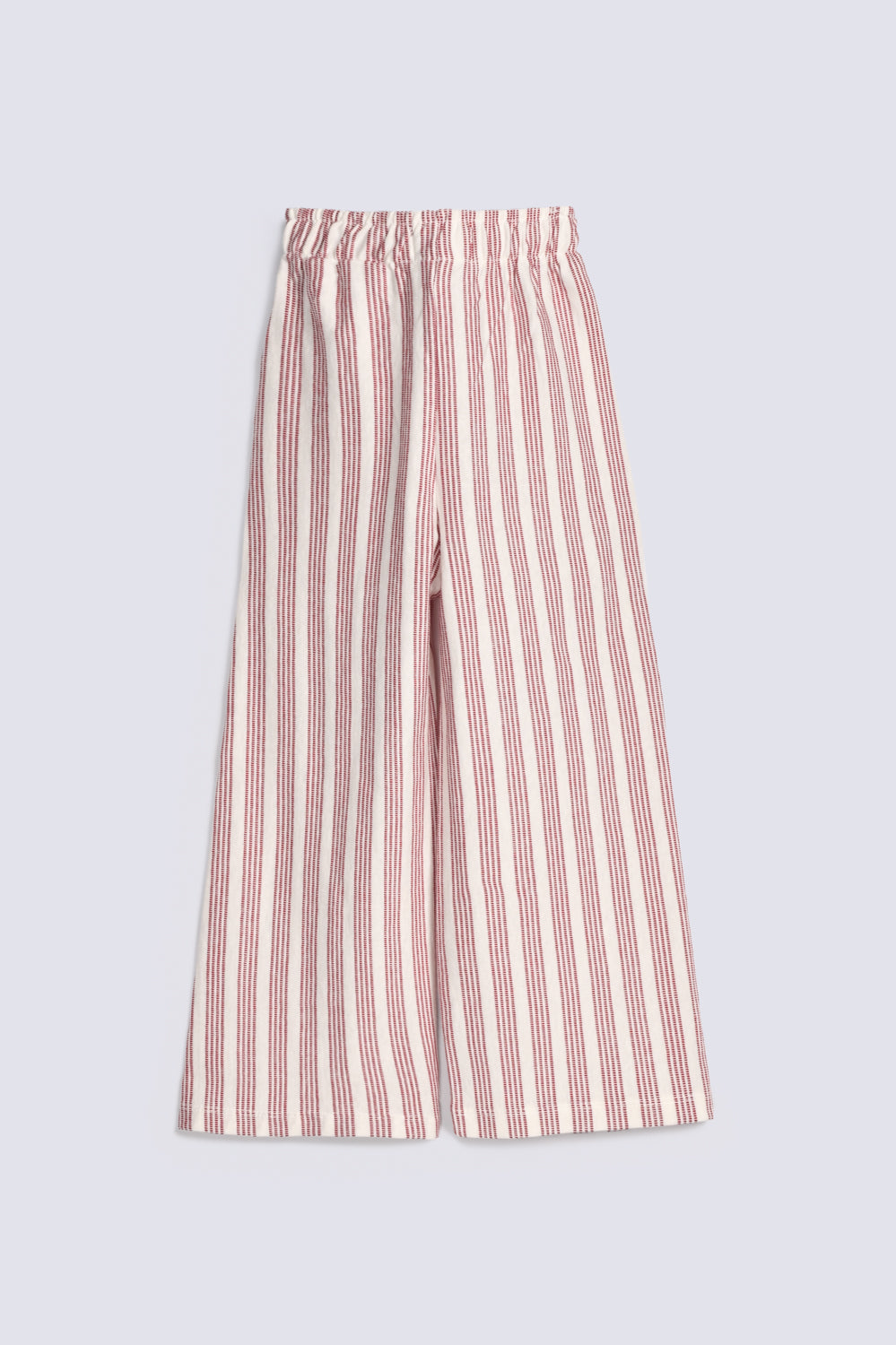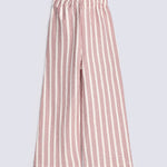 Cream wide-leg pants with Red vertical stripes and an elastic waistband.