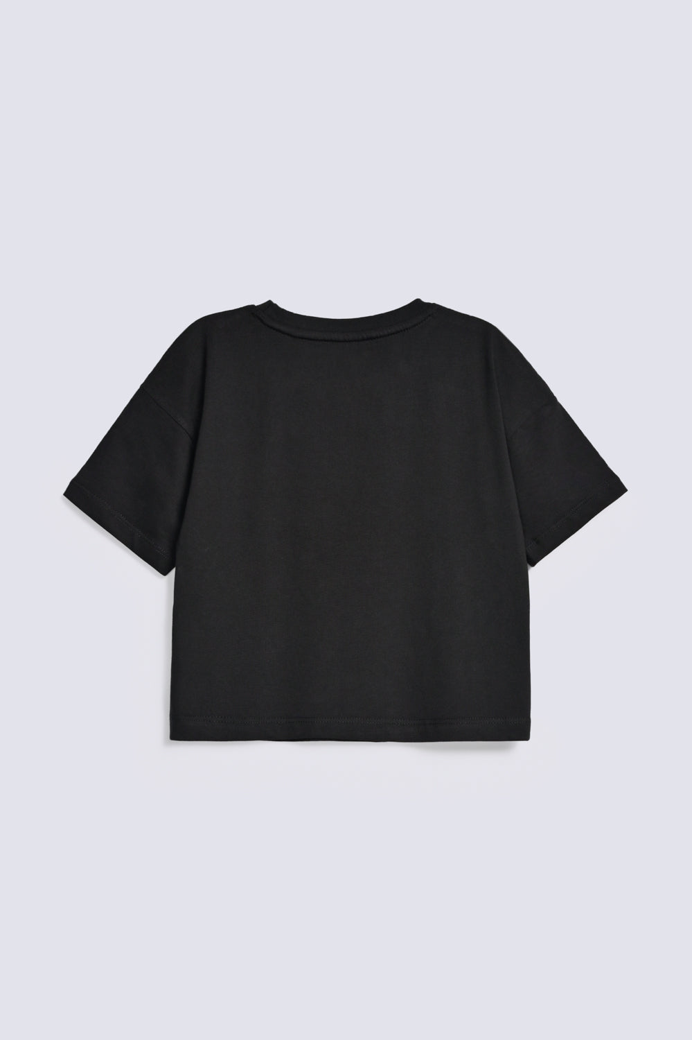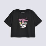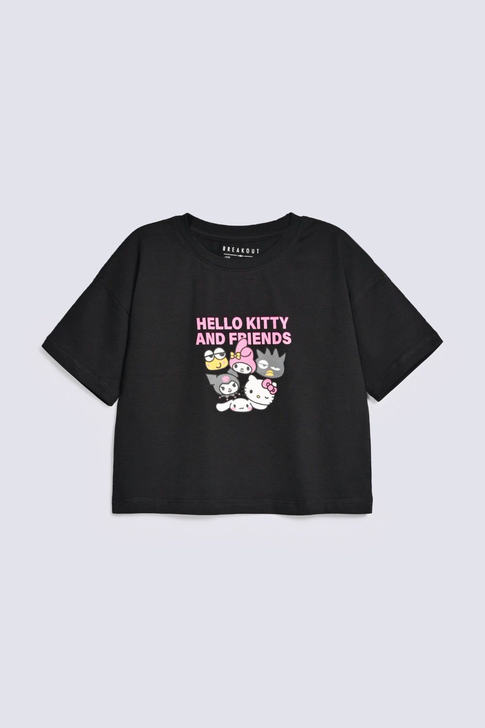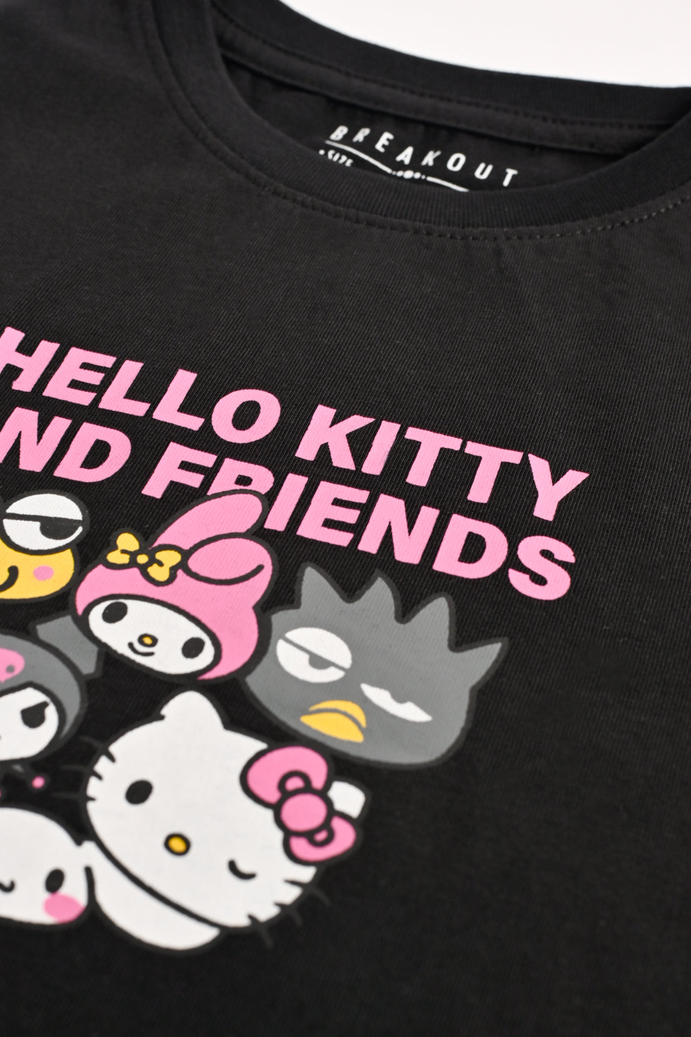 Black graphic T-shirt featuring “Hello Kitty and Friends” print.