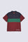 Navy and Burgundy color-block polo with a bold Green stripe and subtle slogan detail.